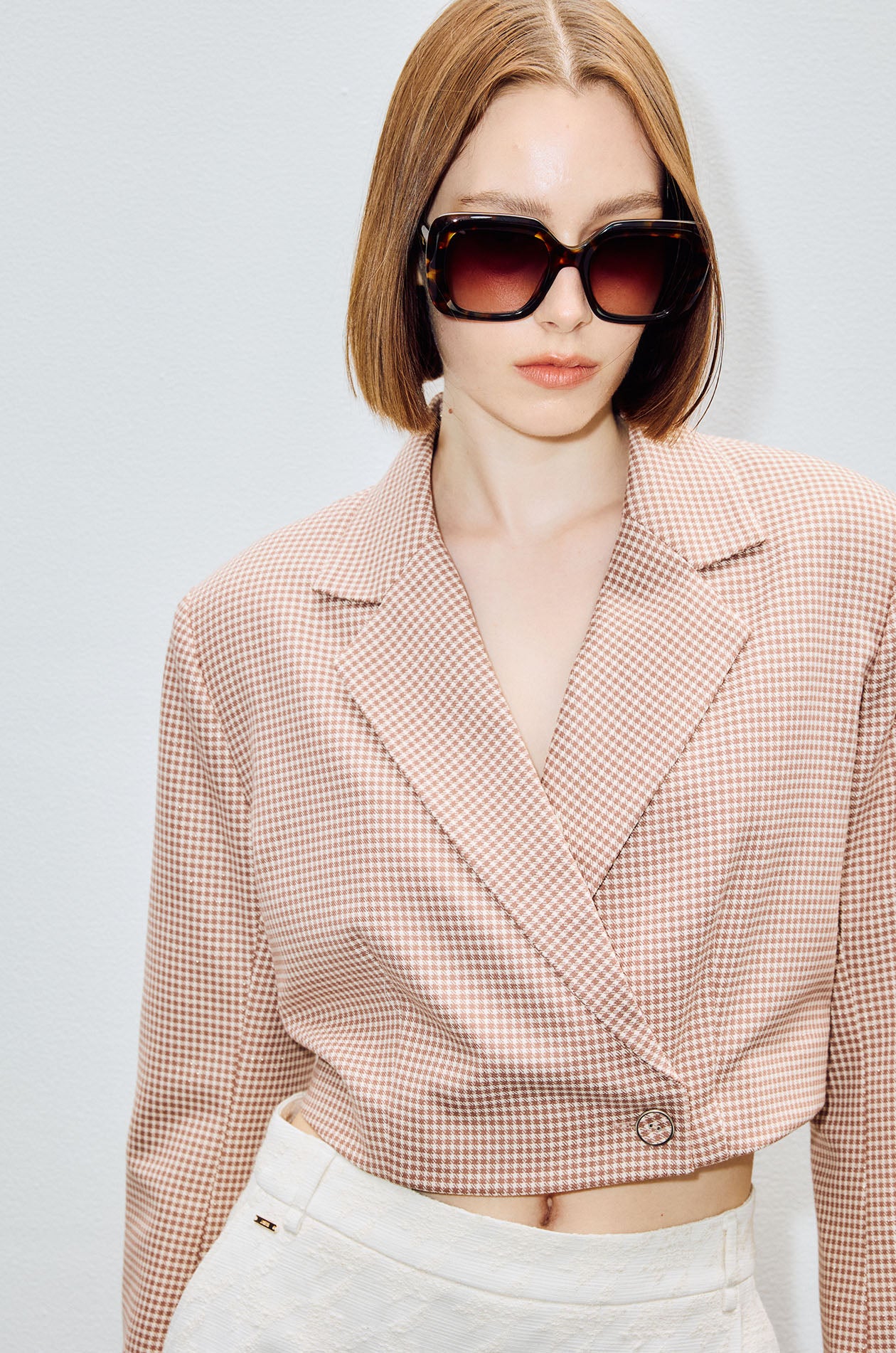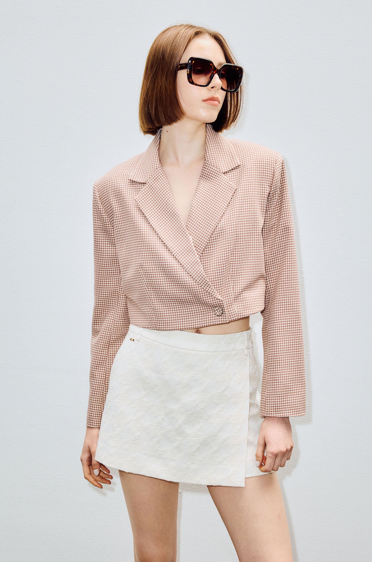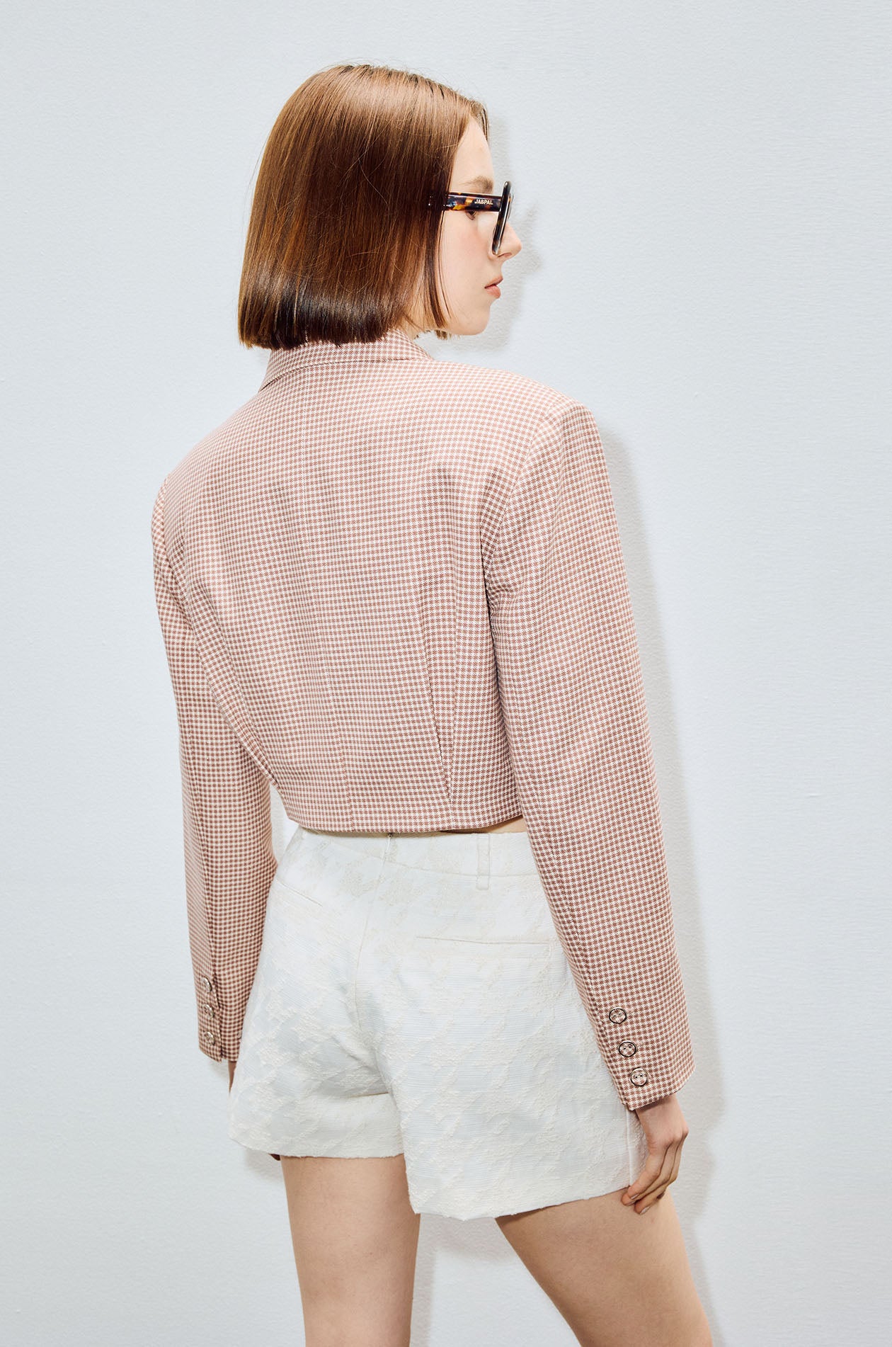 Double-breasted cropped blazer in tweed suiting fabric with houndstooth pattern. Notch lapel and padded shoulders. Front button closure. Available in beige and black.