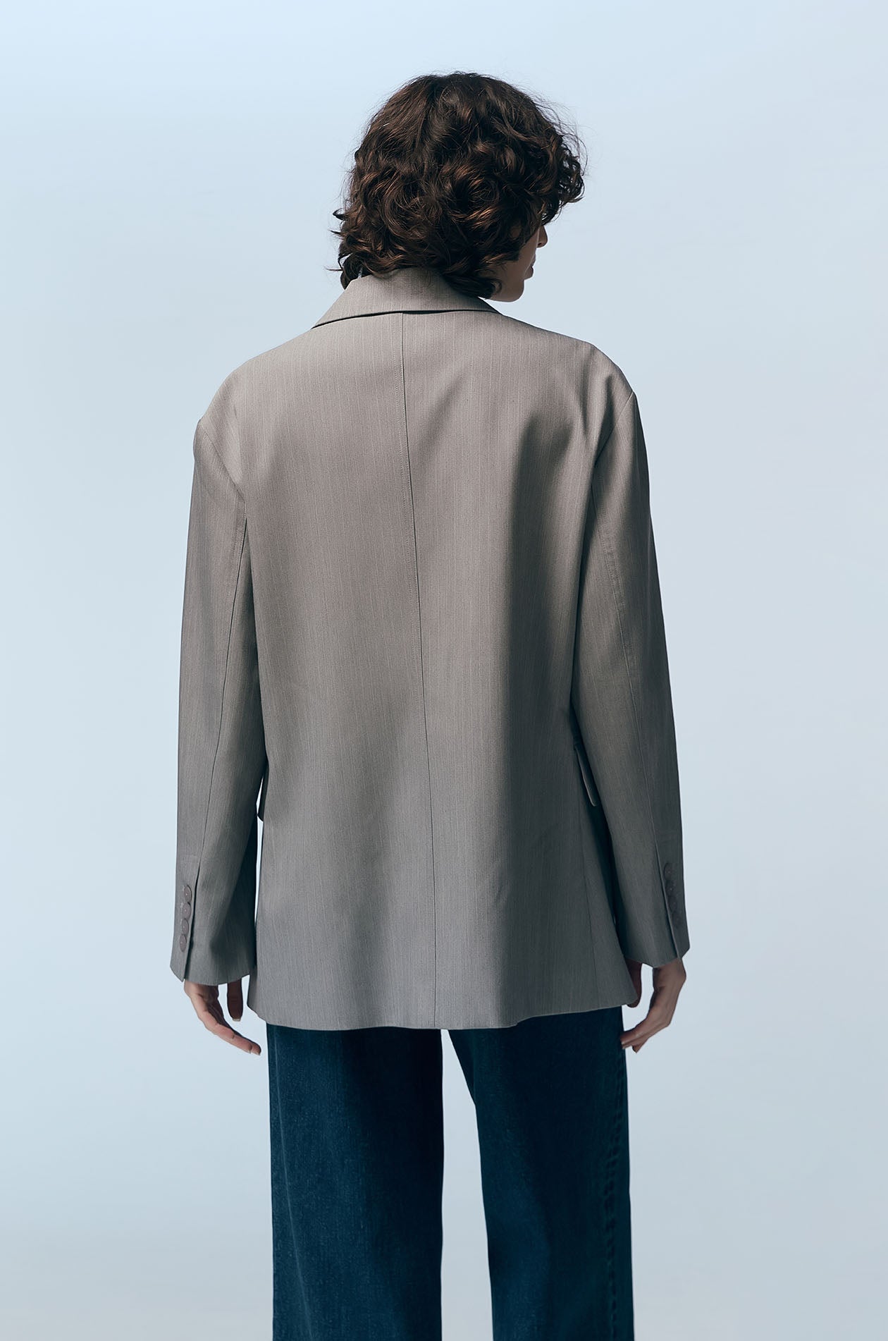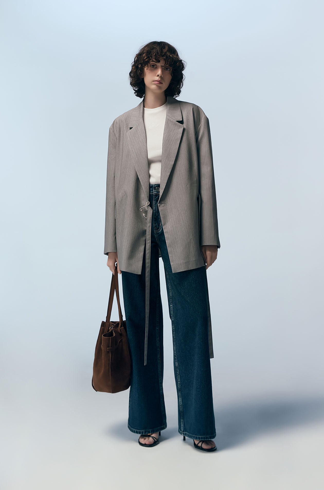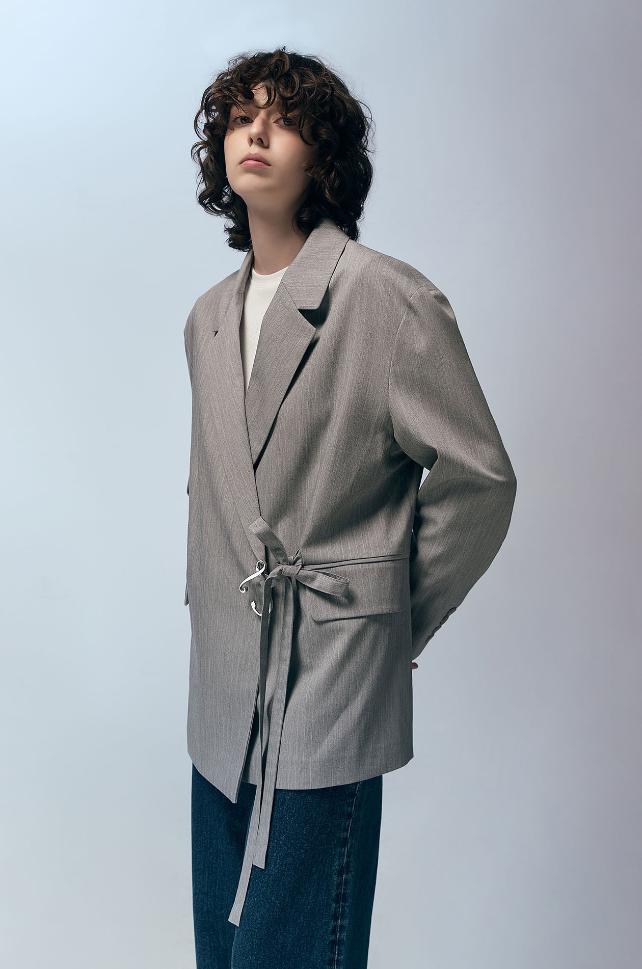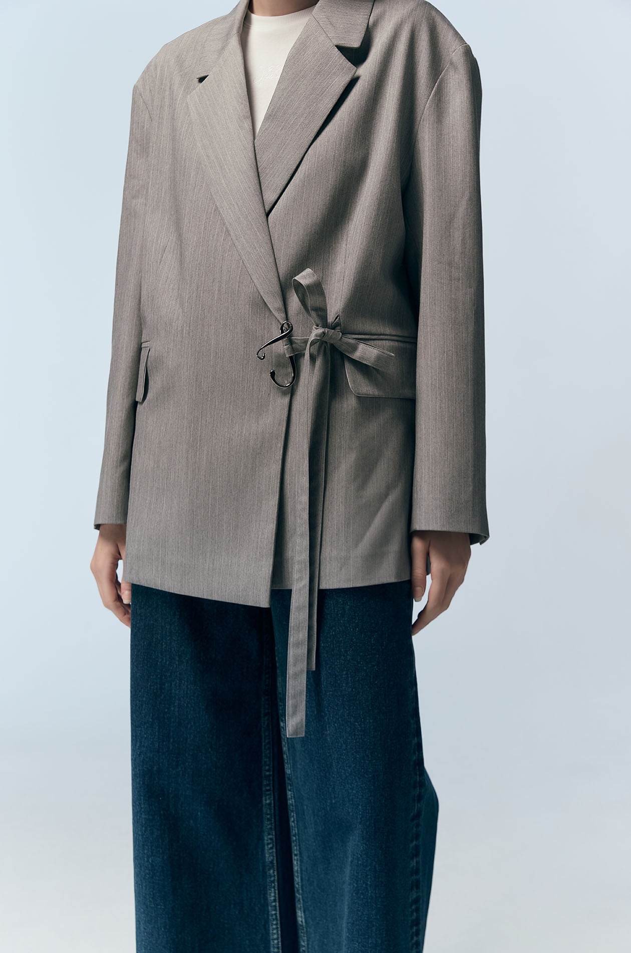 Single-breasted blazer in gabardine. The contemporary proportions elevate a sophisticated modern style to your formal and smart casual looks. Vertical pinstripes. Wrap design with tie detail and silver-tone J hardware. Notch lapel and front pockets. Relax fit. Front tie closure. Available in striped black and striped grey.