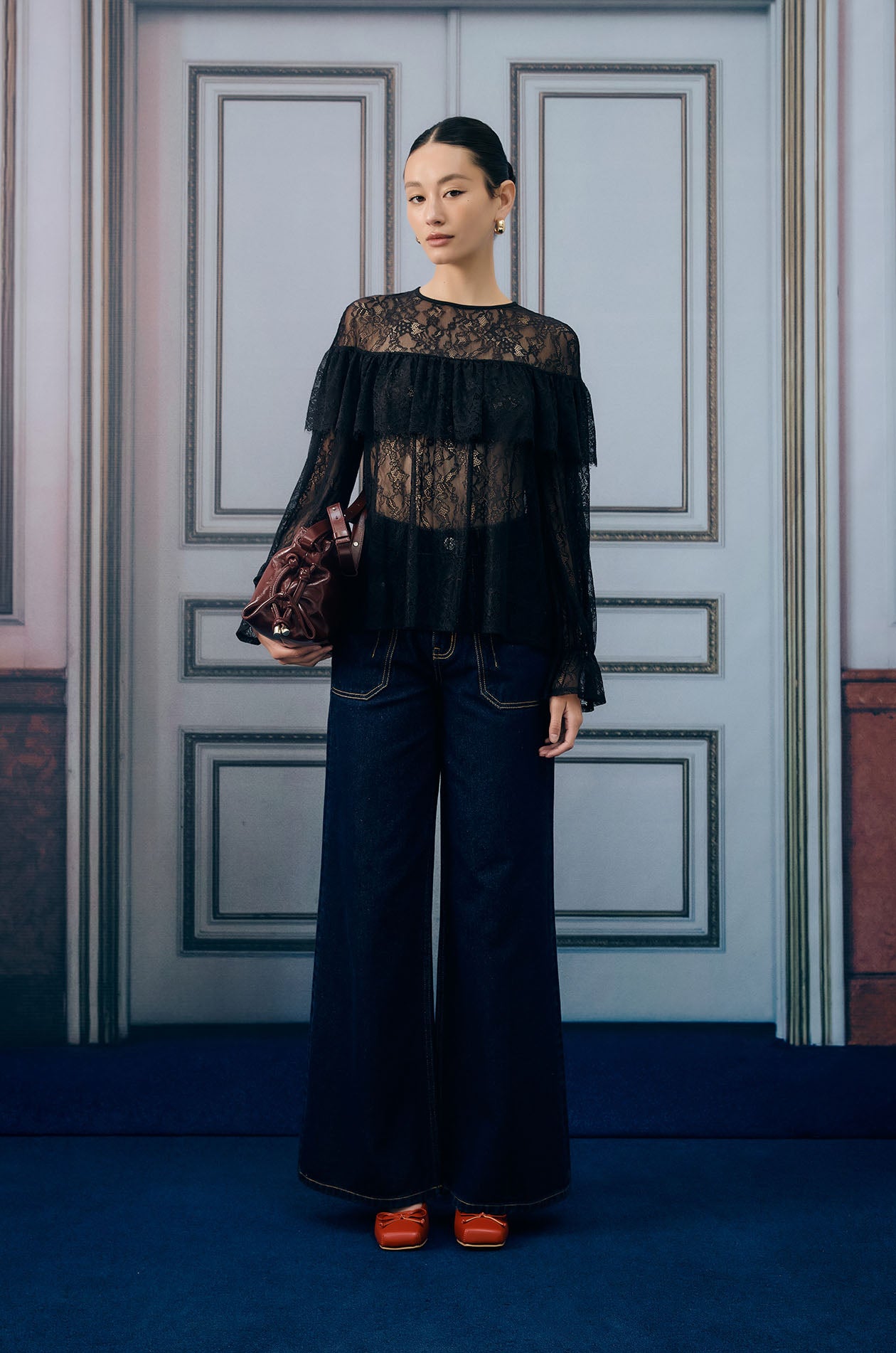 Ruffle Trim Sheer Lace Blouse