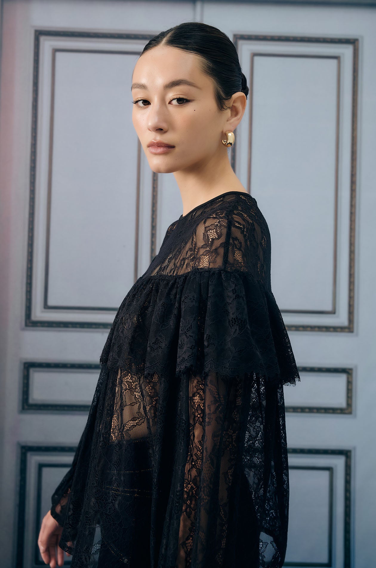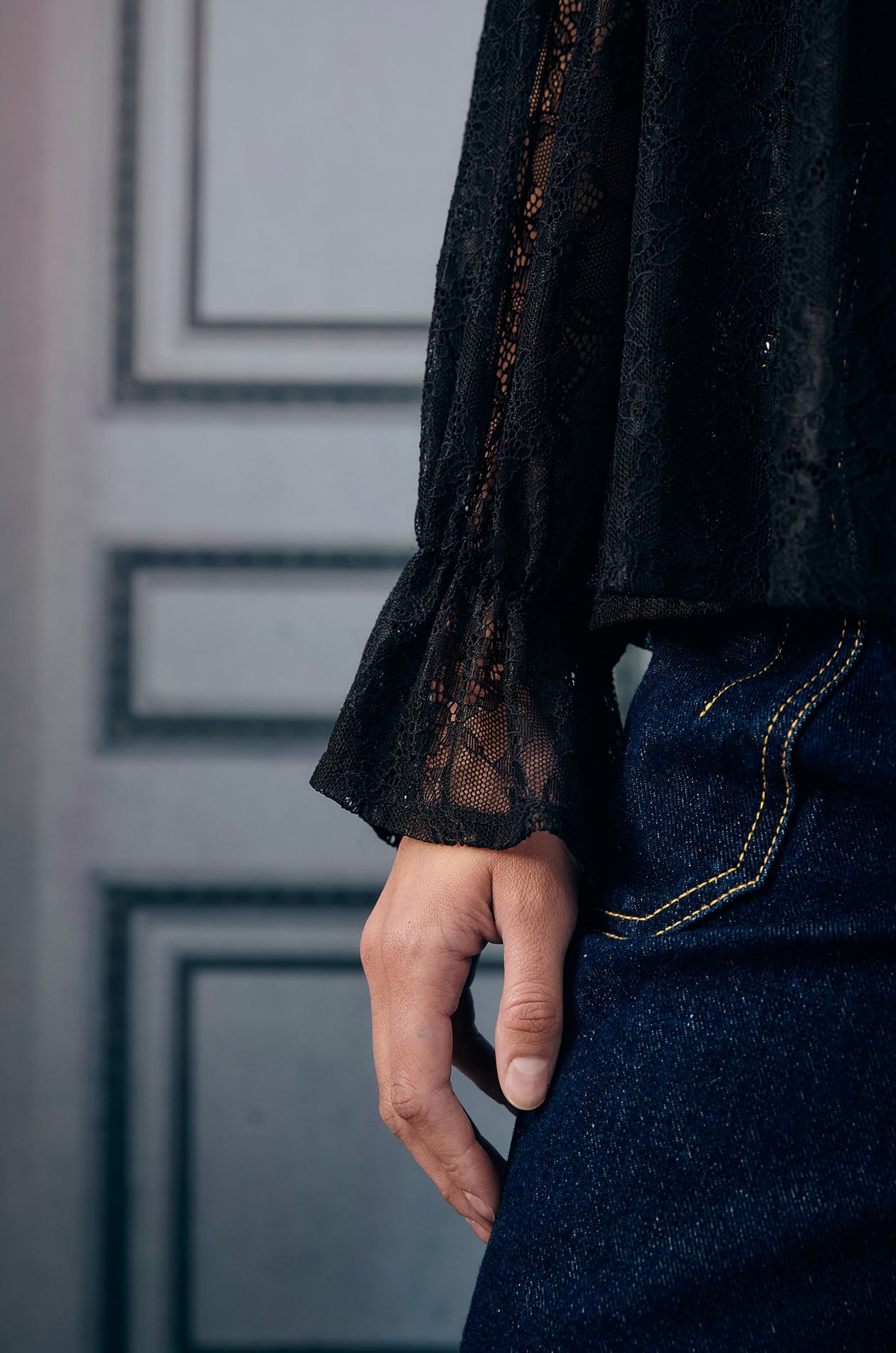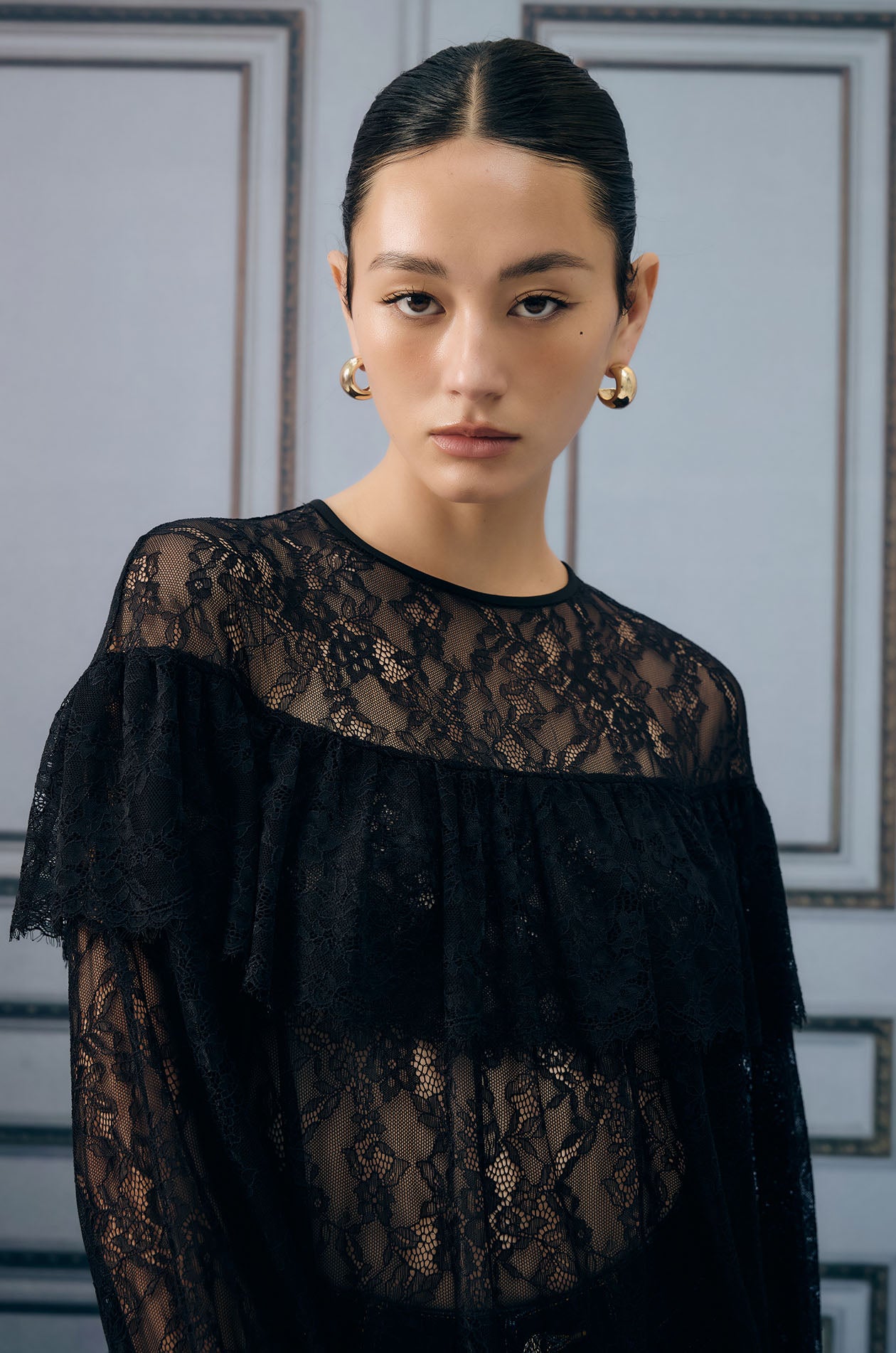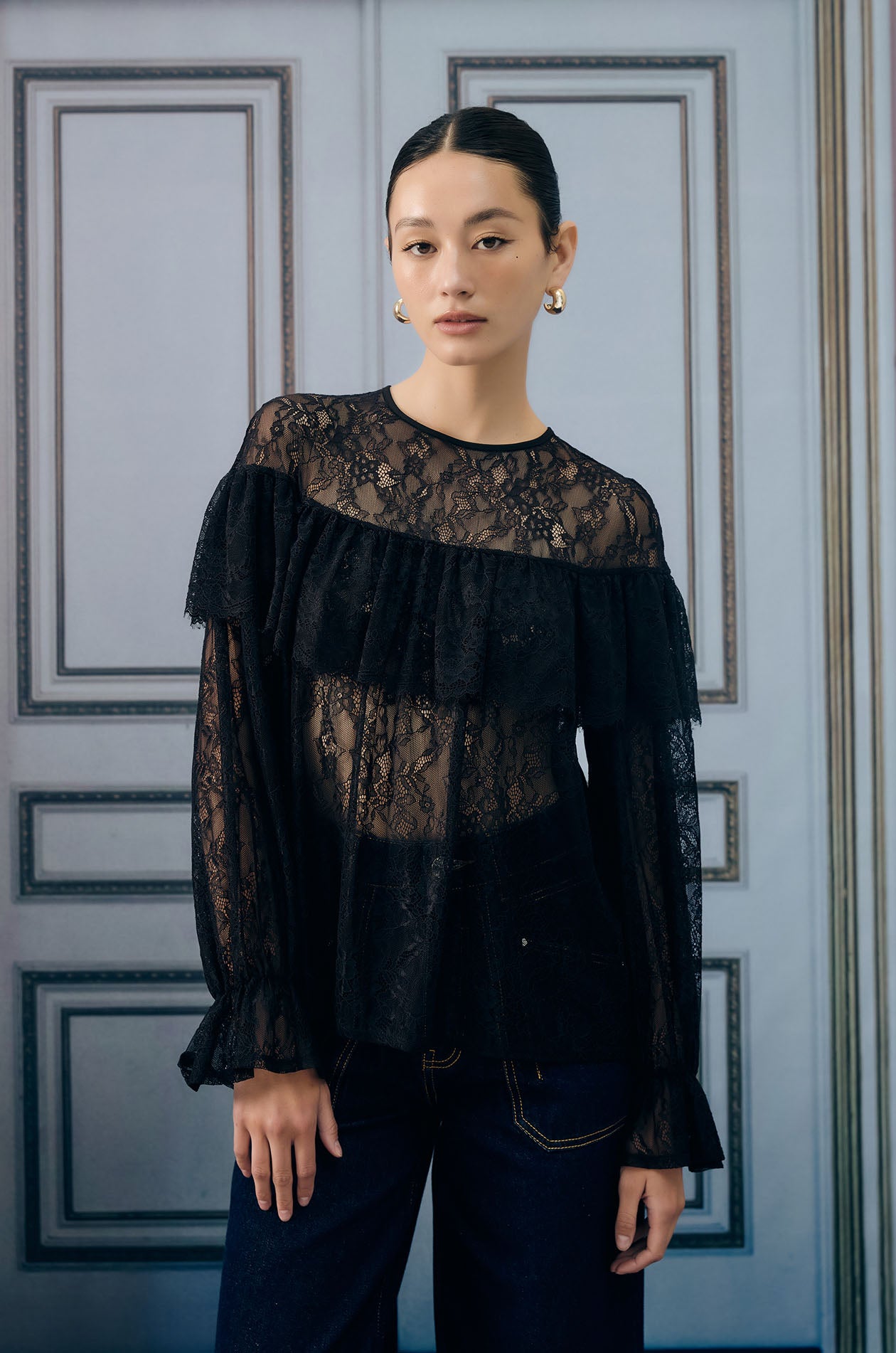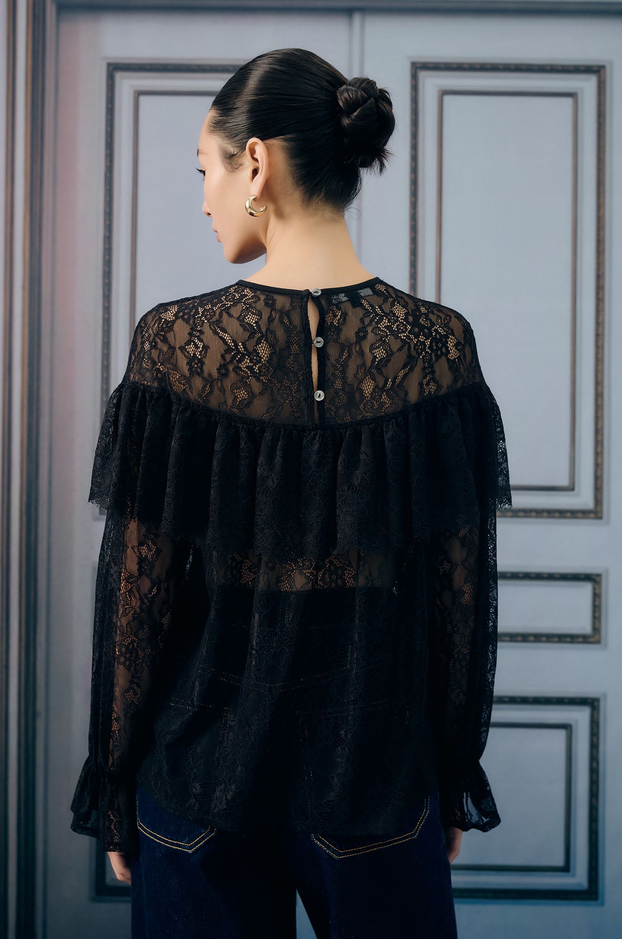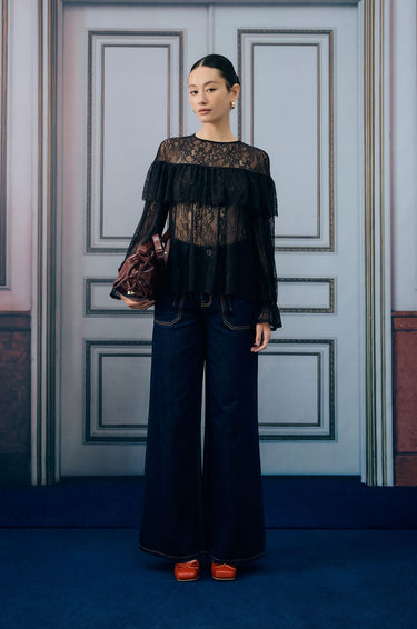 Long-sleeved blouse in floral lace fabric. Sheer effect without lining. Loose fit with round neck and ruffle detail. Back button closure. Available in black.