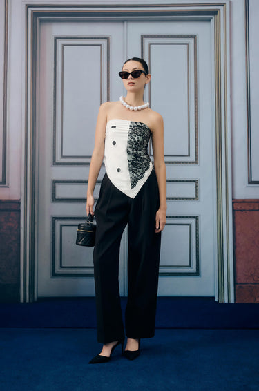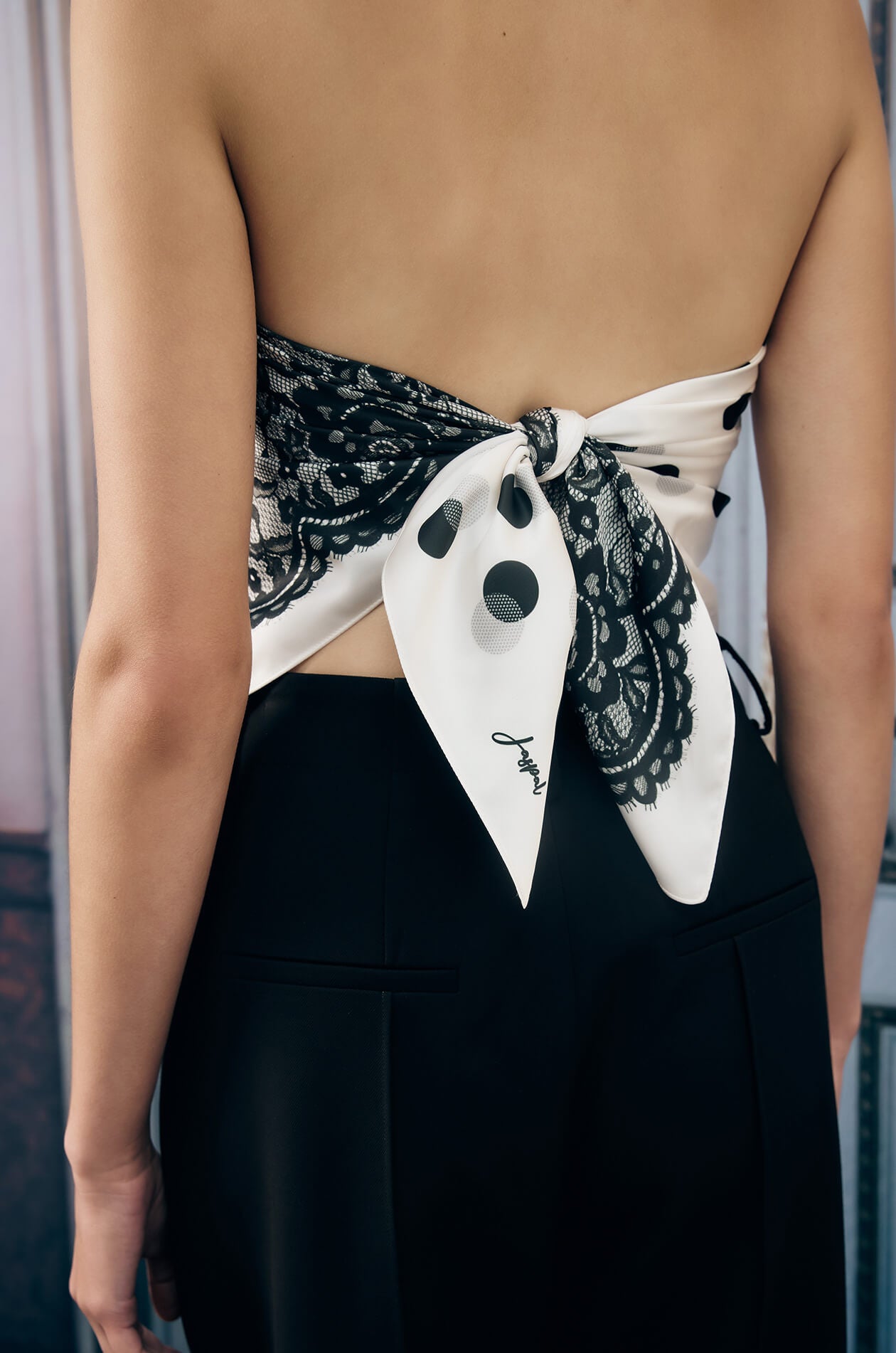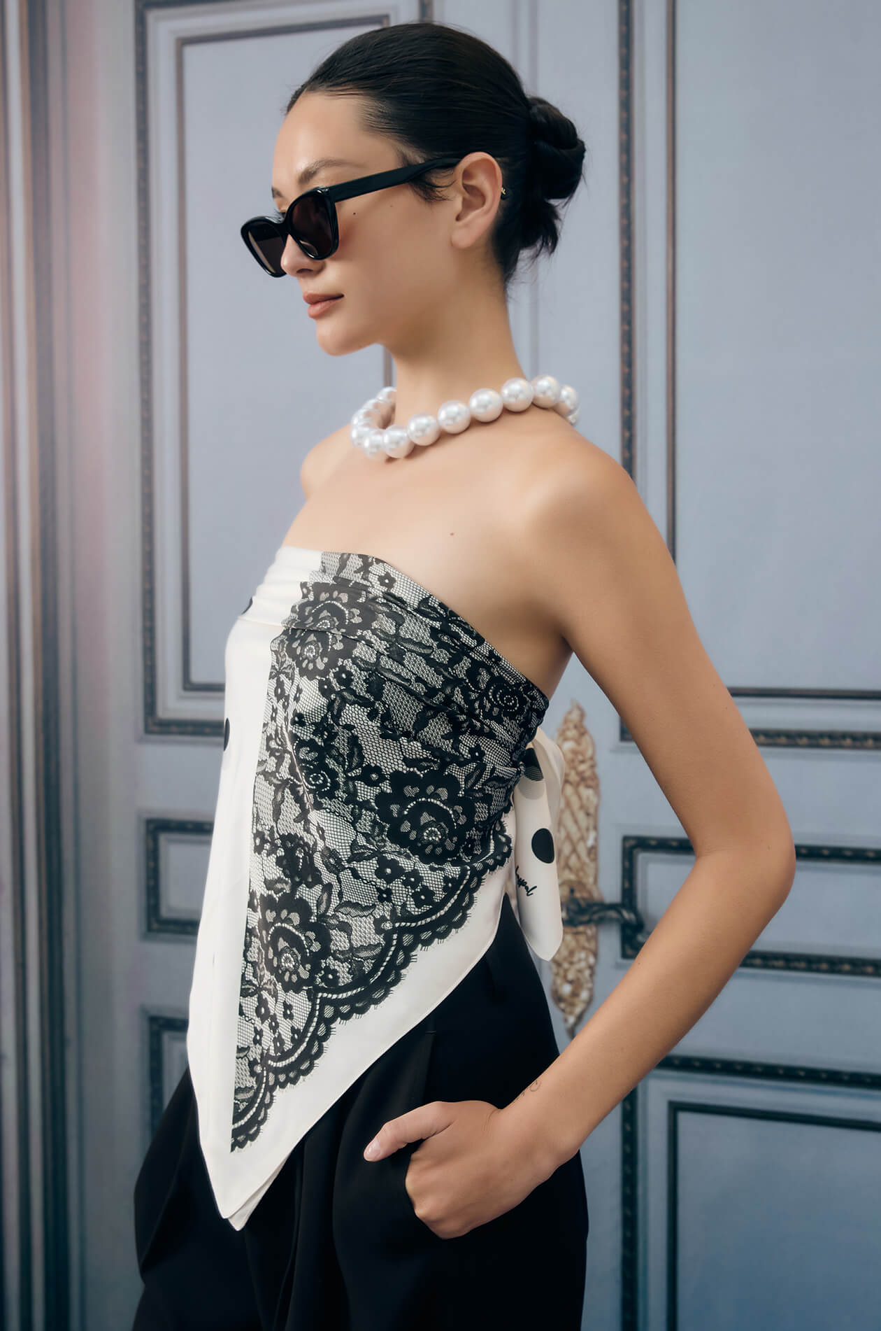 Square scarf in satin-like fabric. Contrast floral lace and dot print. Available in off-white.