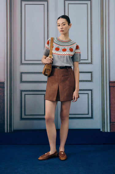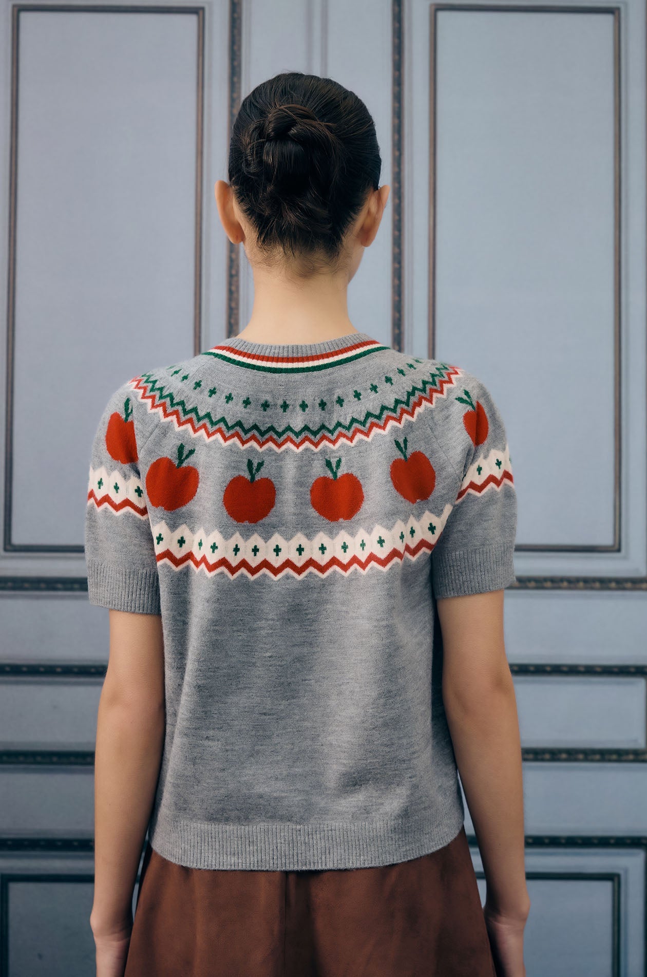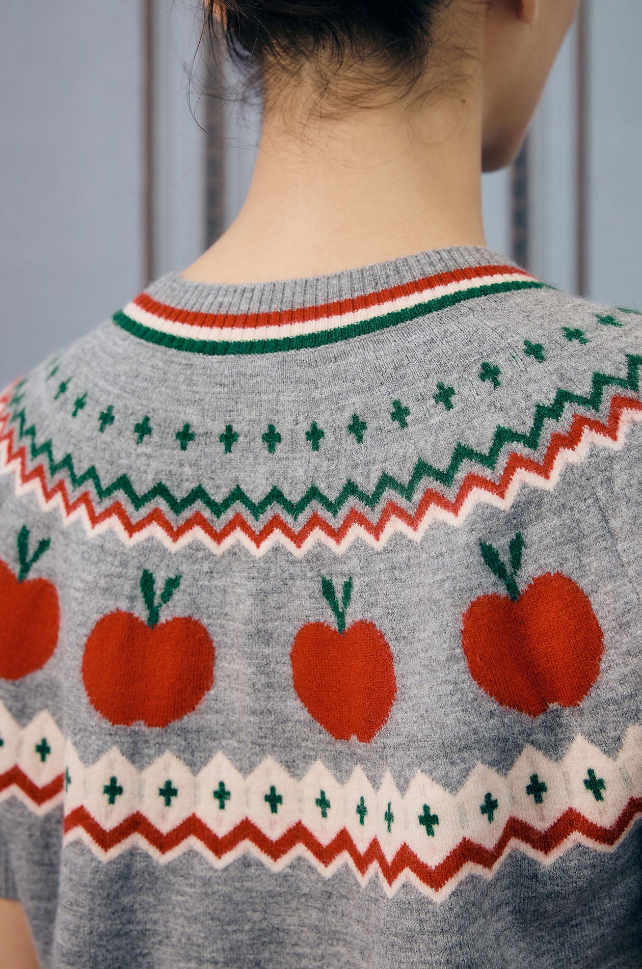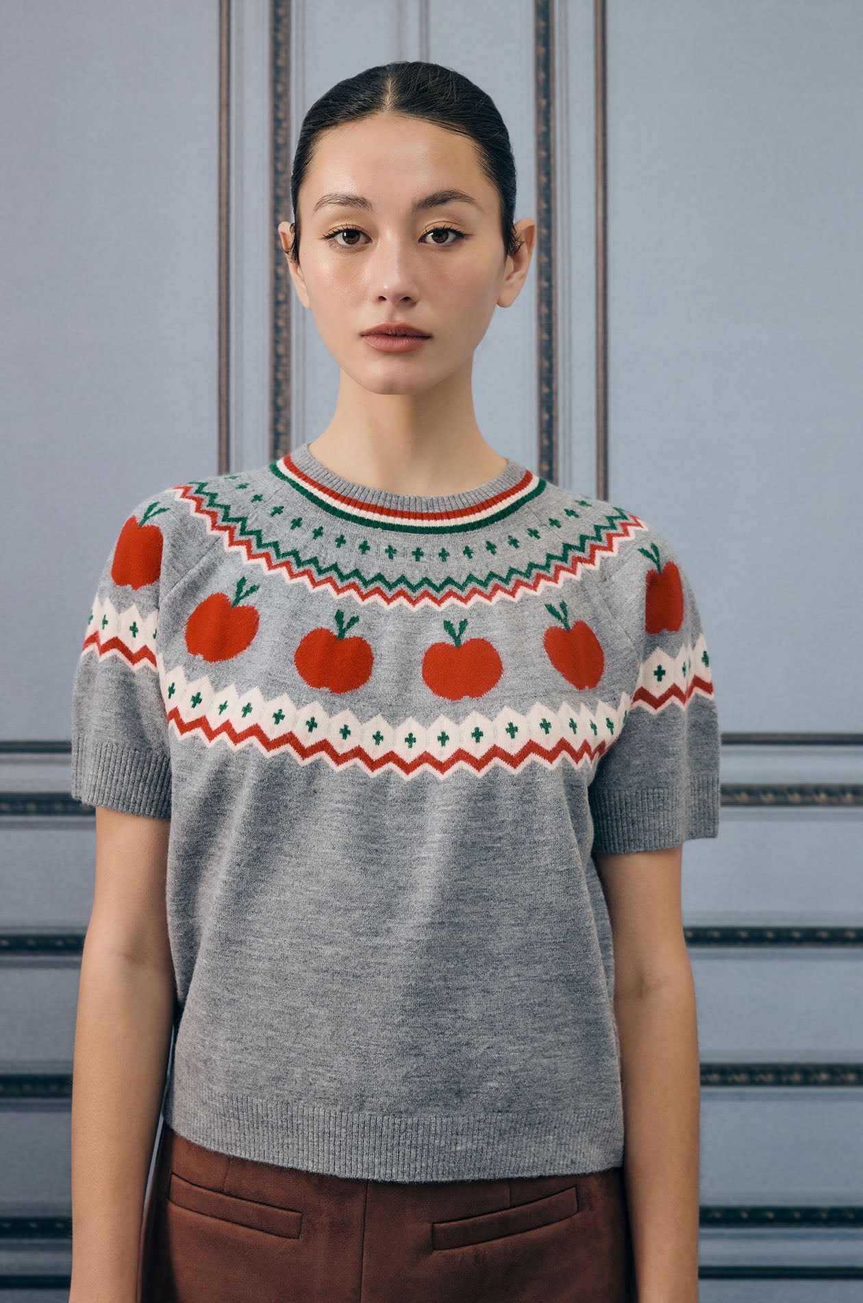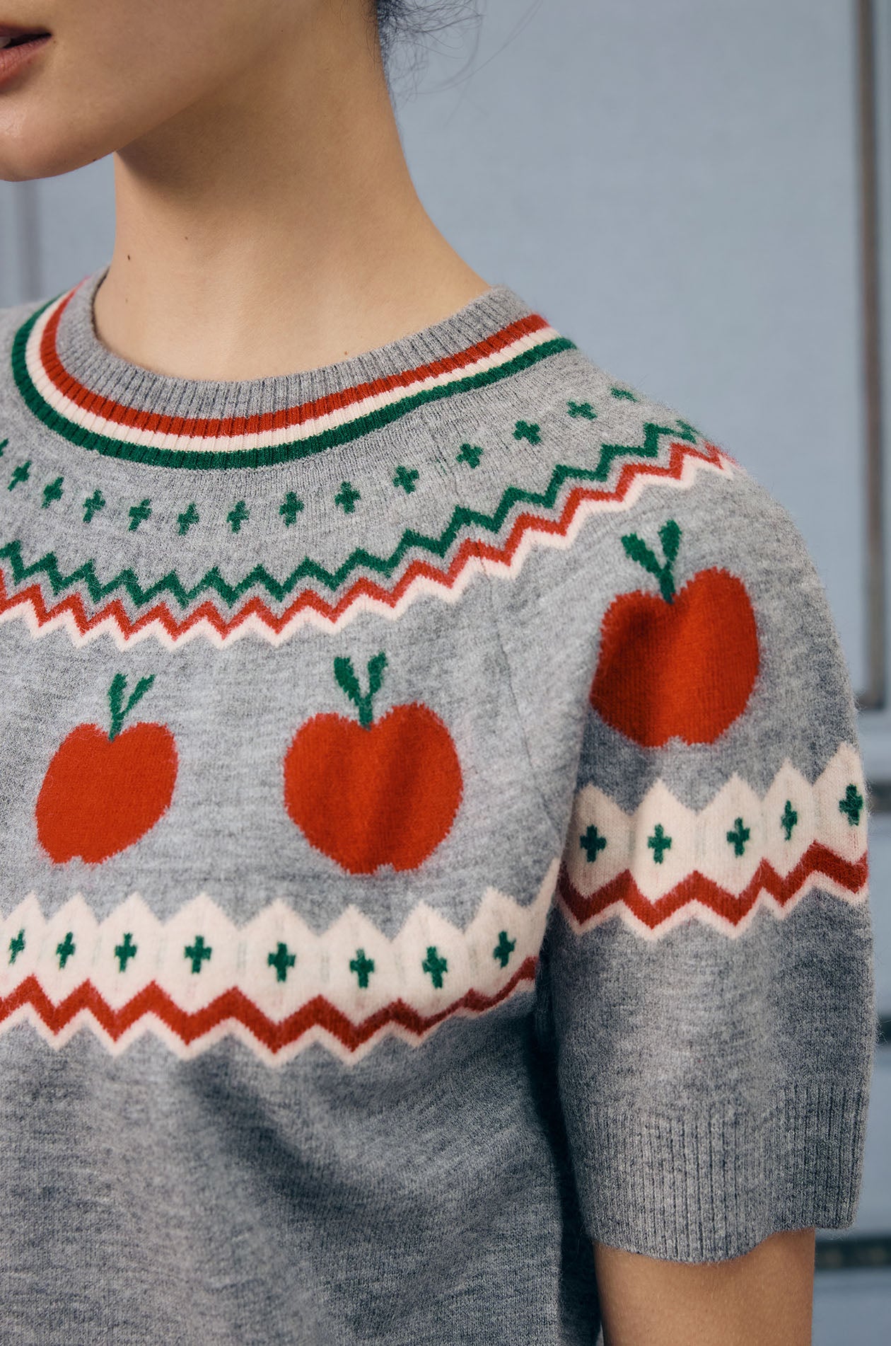 Short-sleeved sweater in jacquard knit fabric. This sweater is adorned with a charming pattern of apples. Regular fit with crew neckline and ribbed edges. Available in grey.