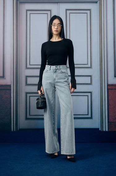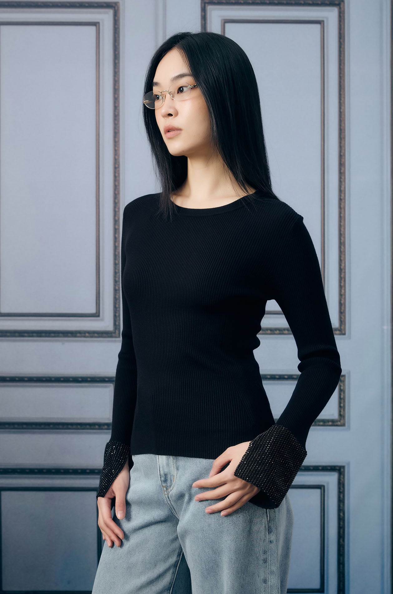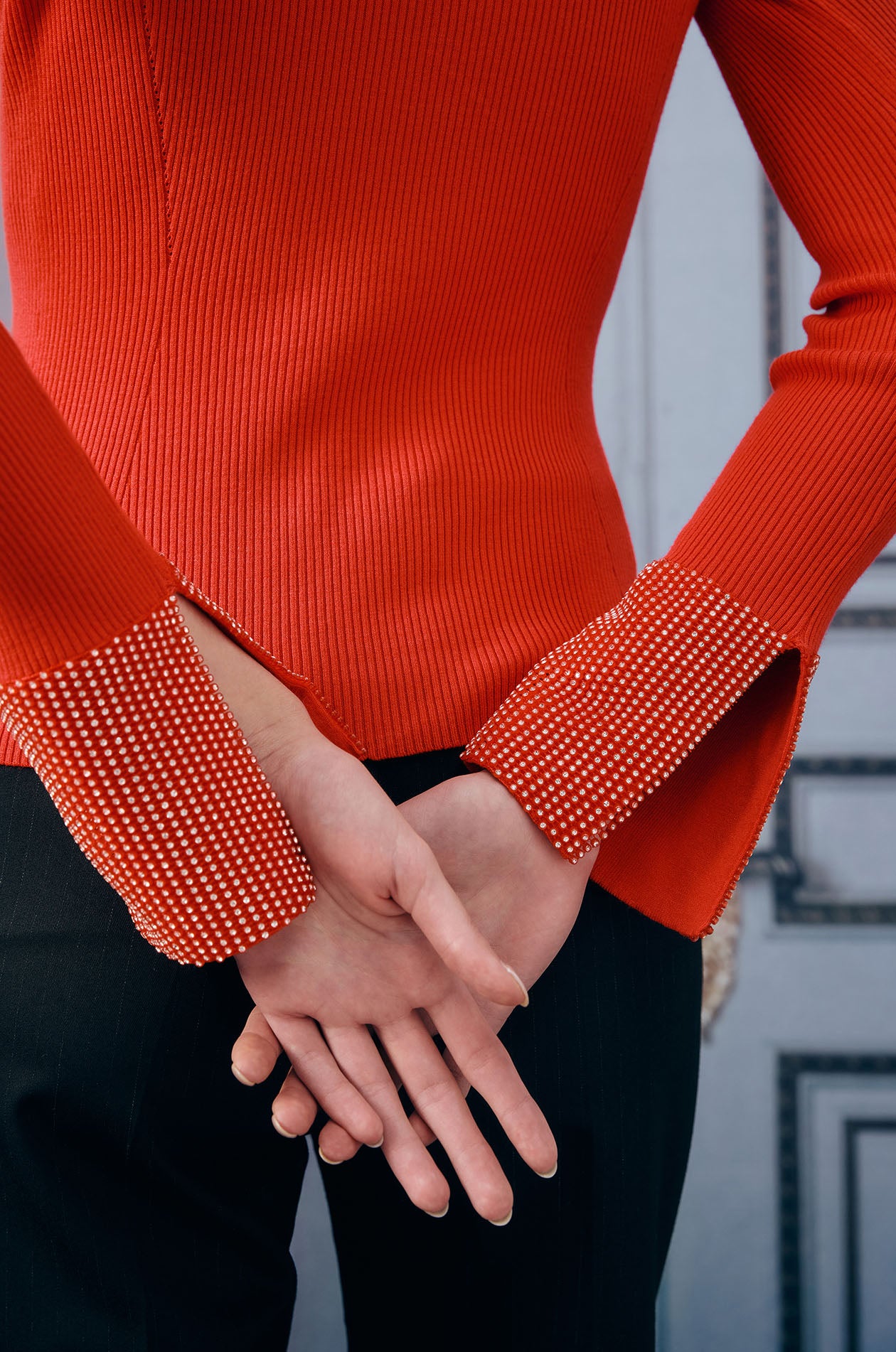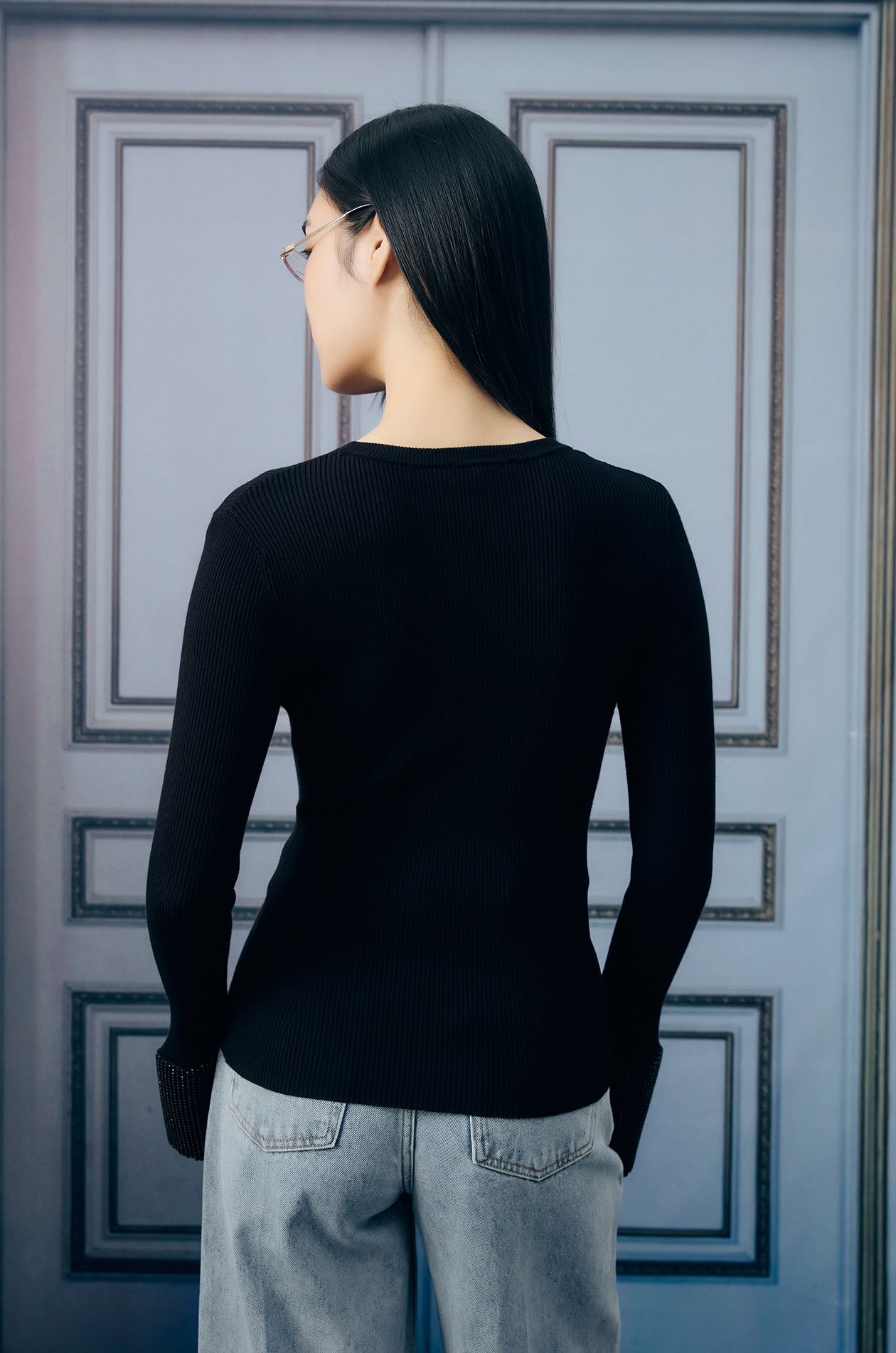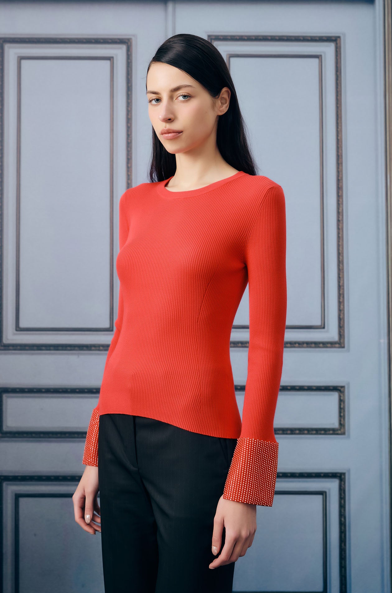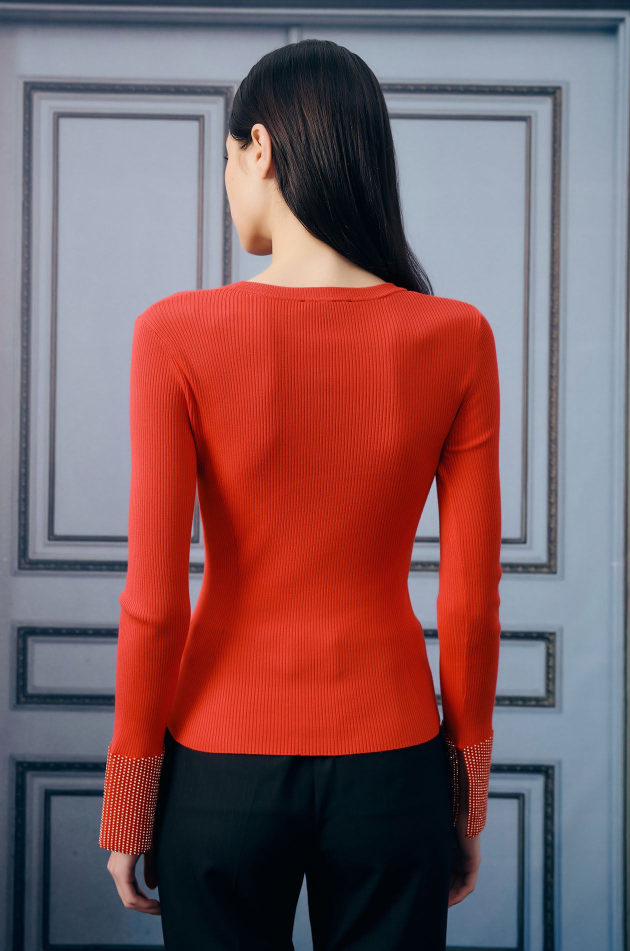 Long-sleeved top in ribbed knit. Regular fit with waist-defining design and round neckline. Available in black and red.
