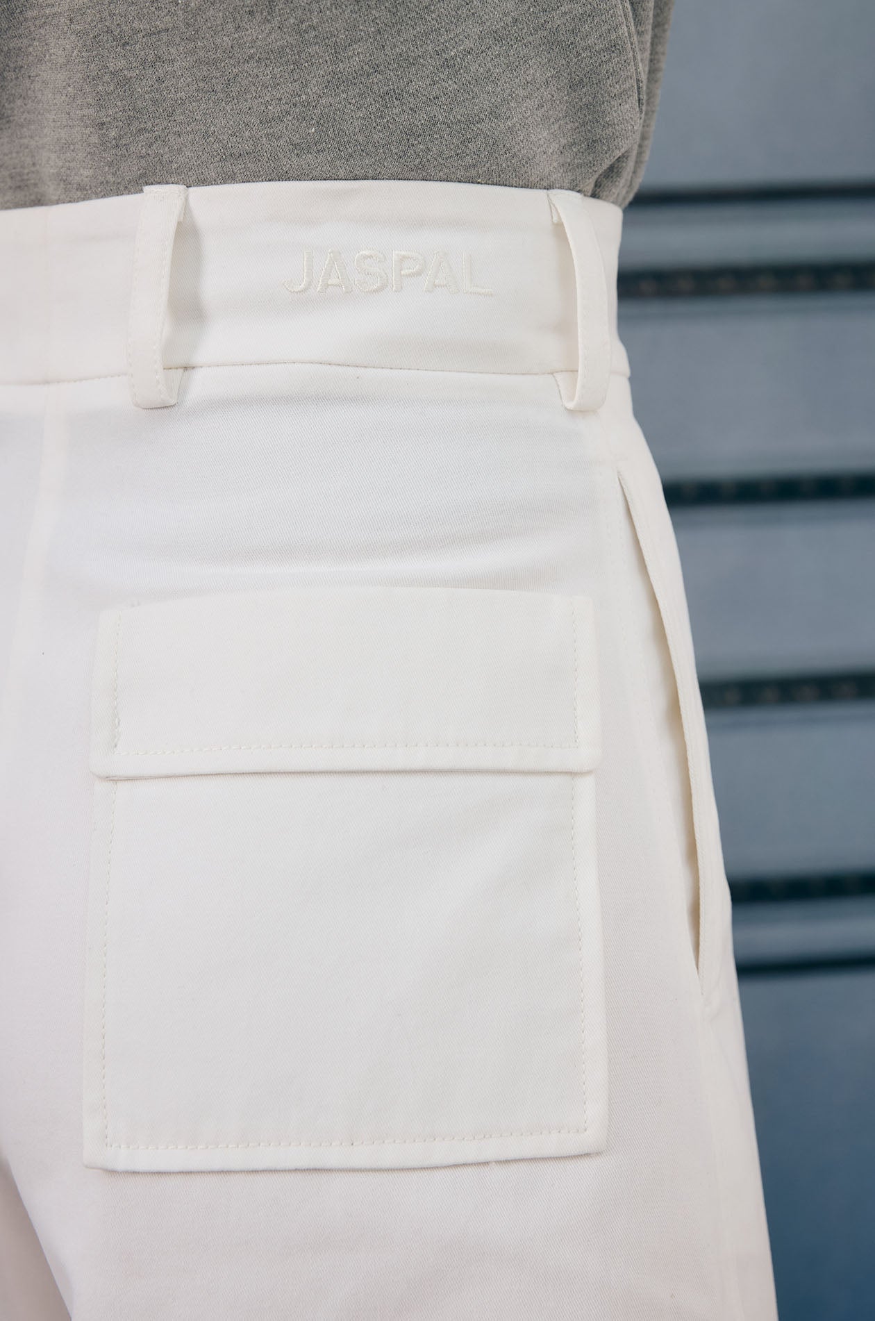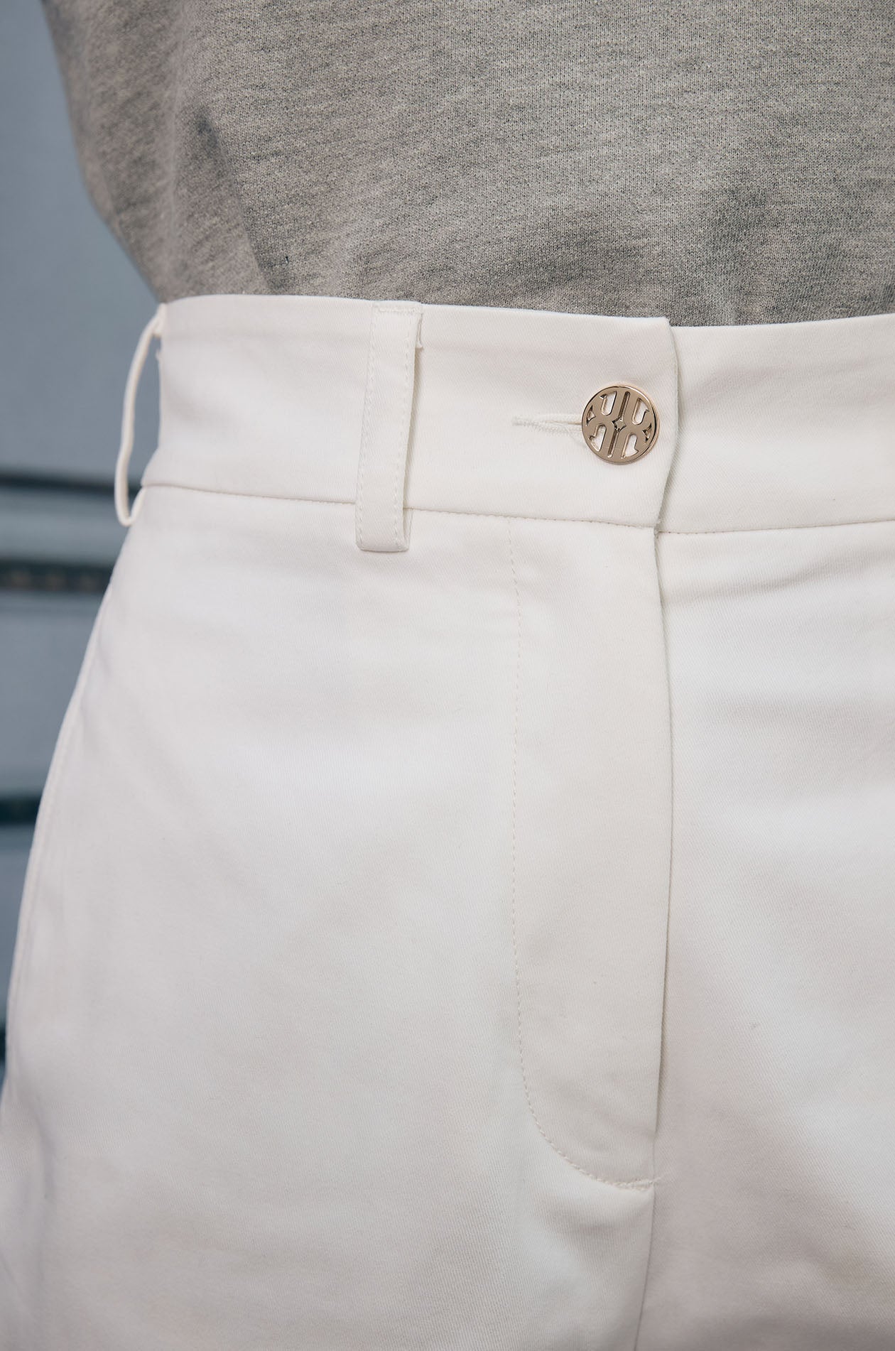 Mid-rise shorts with tight-length legs with side pockets. Front button and zip closure. Available in white.