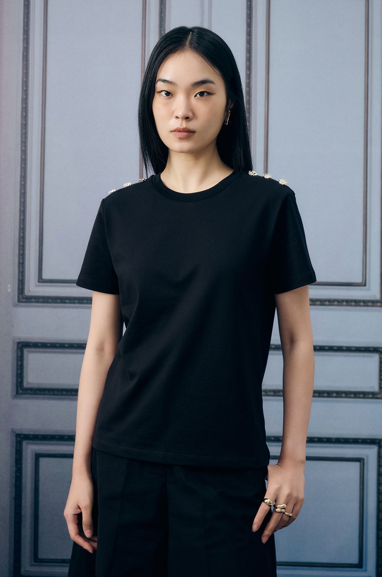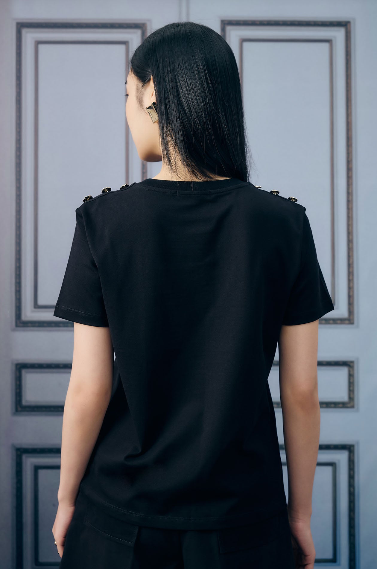 Short-sleeved T-shirt in cotton jersey. Button embellishment at the shoulders. Regular fit with round neck. Available in black.