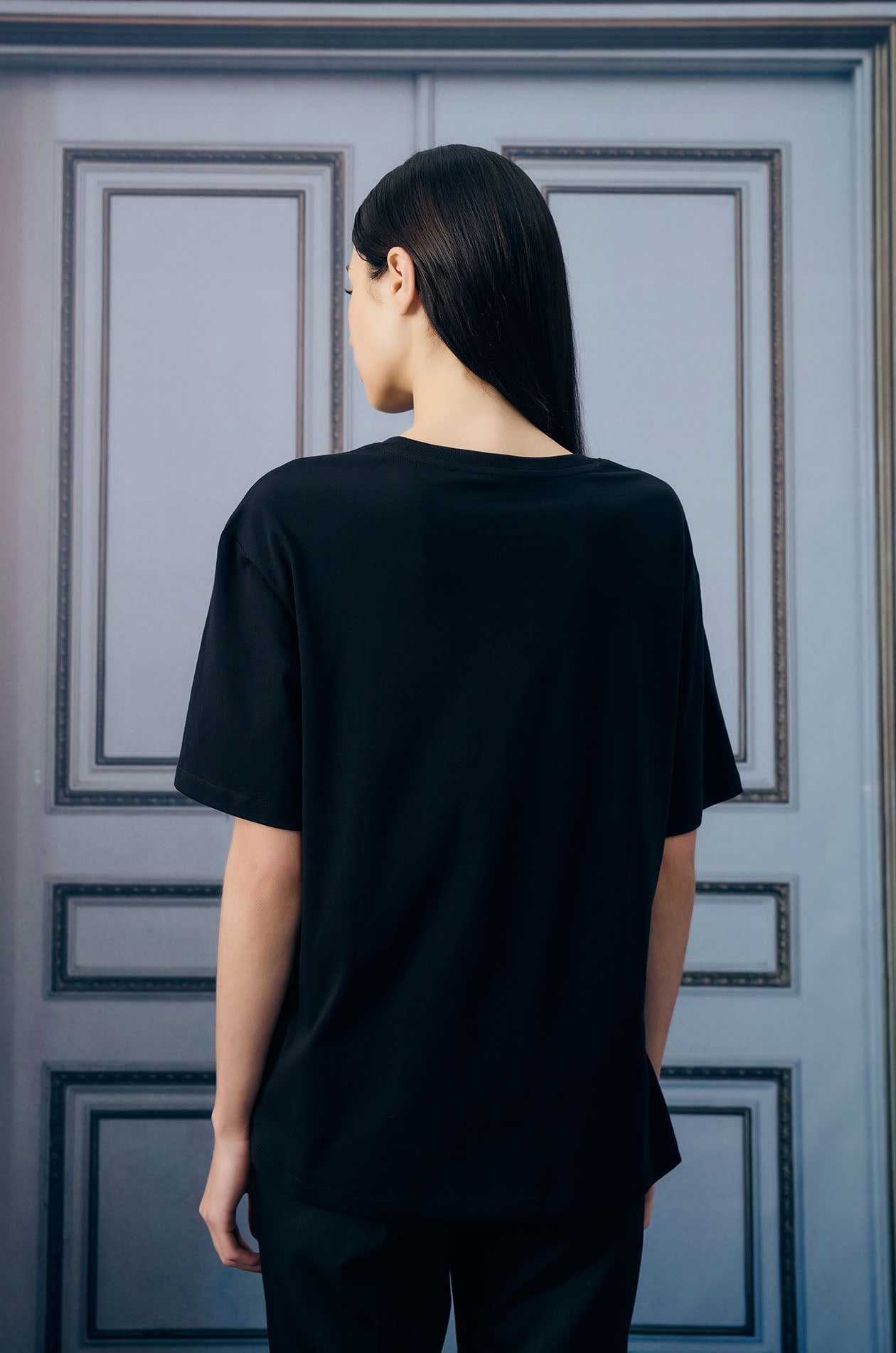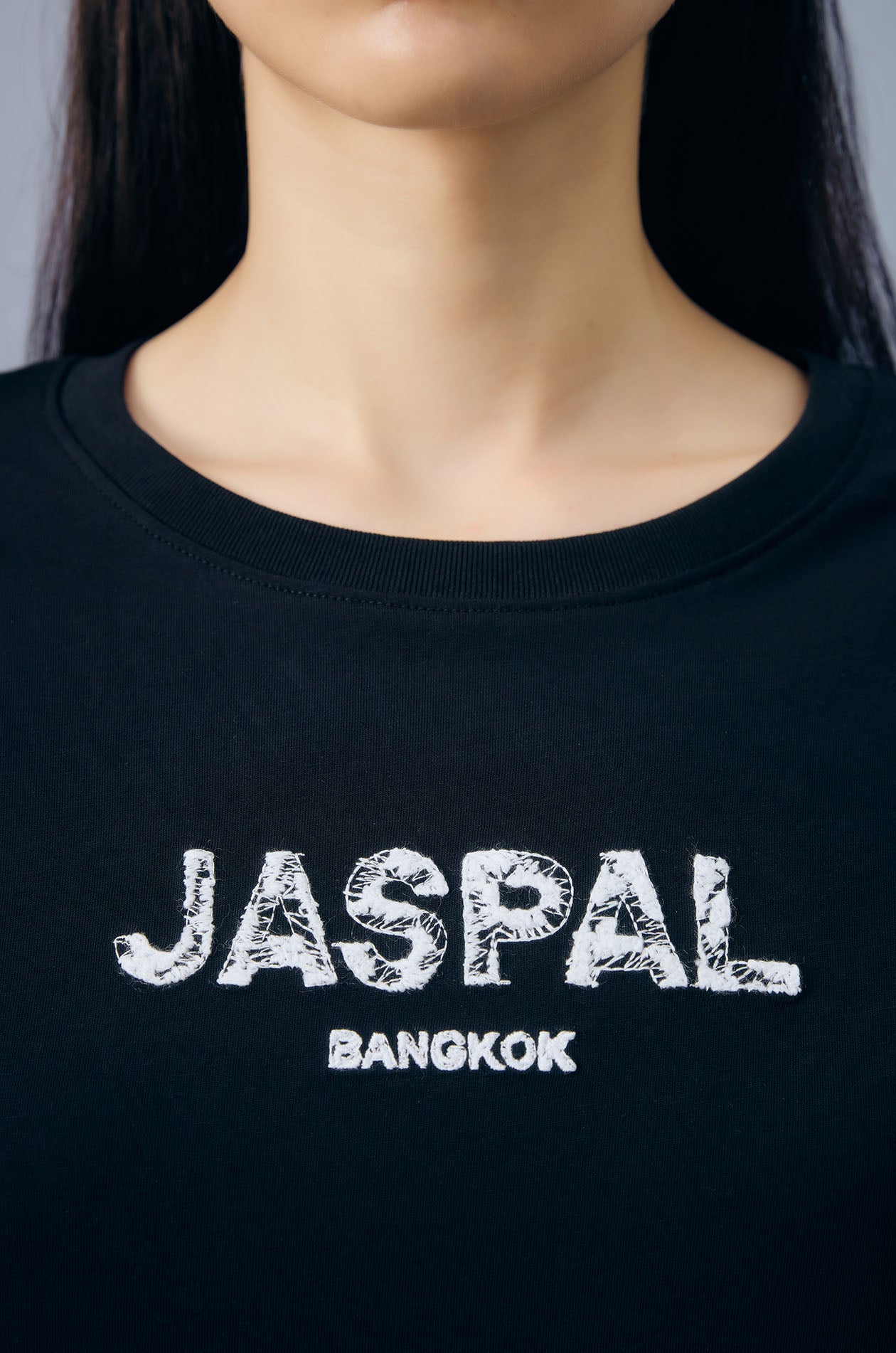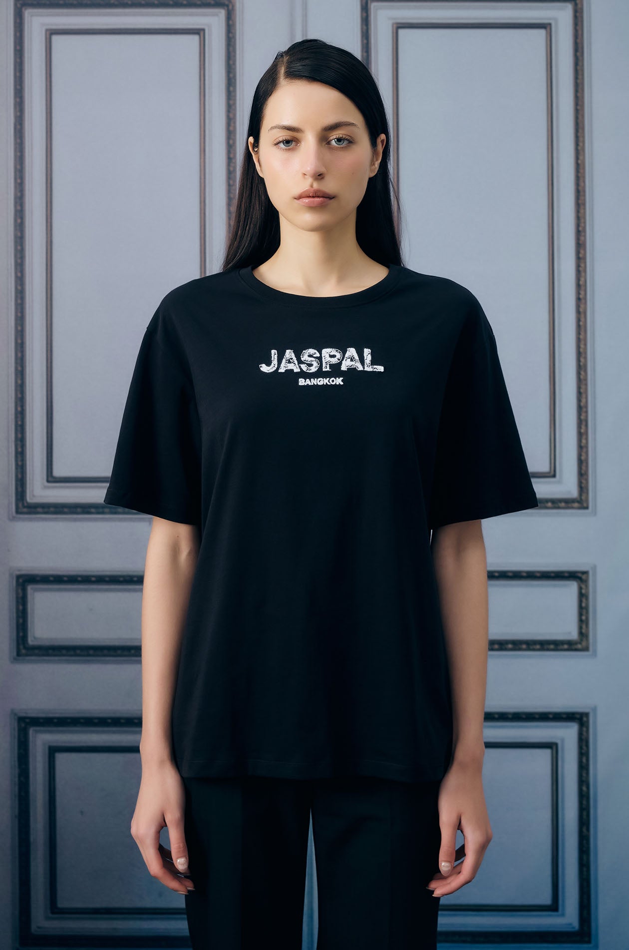 Short-sleeved T-shirt in soft-finish jersey. Oversize fit with round neckline and Jaspal logo at the front. Available in black.
