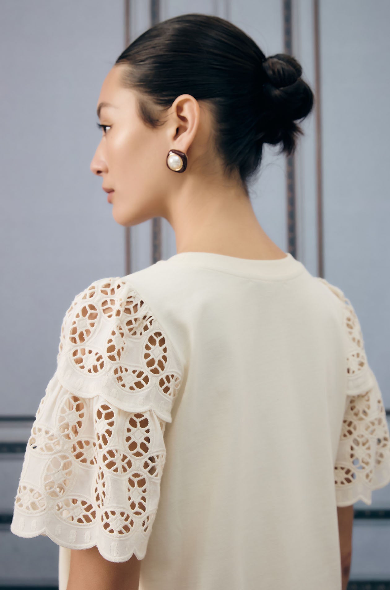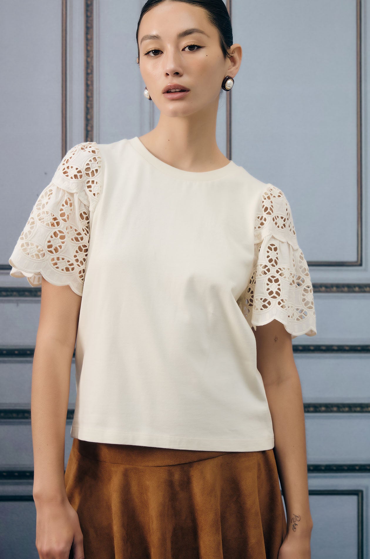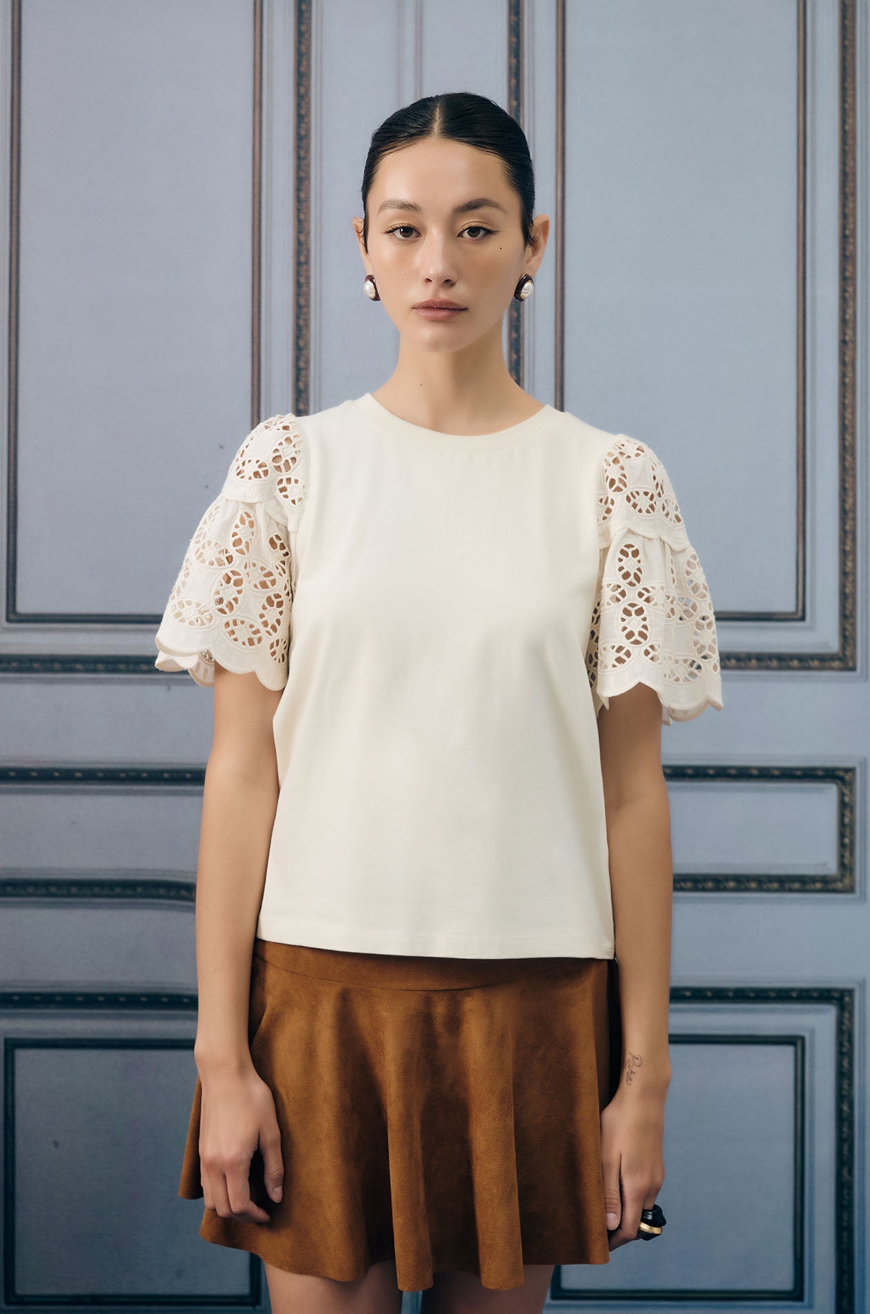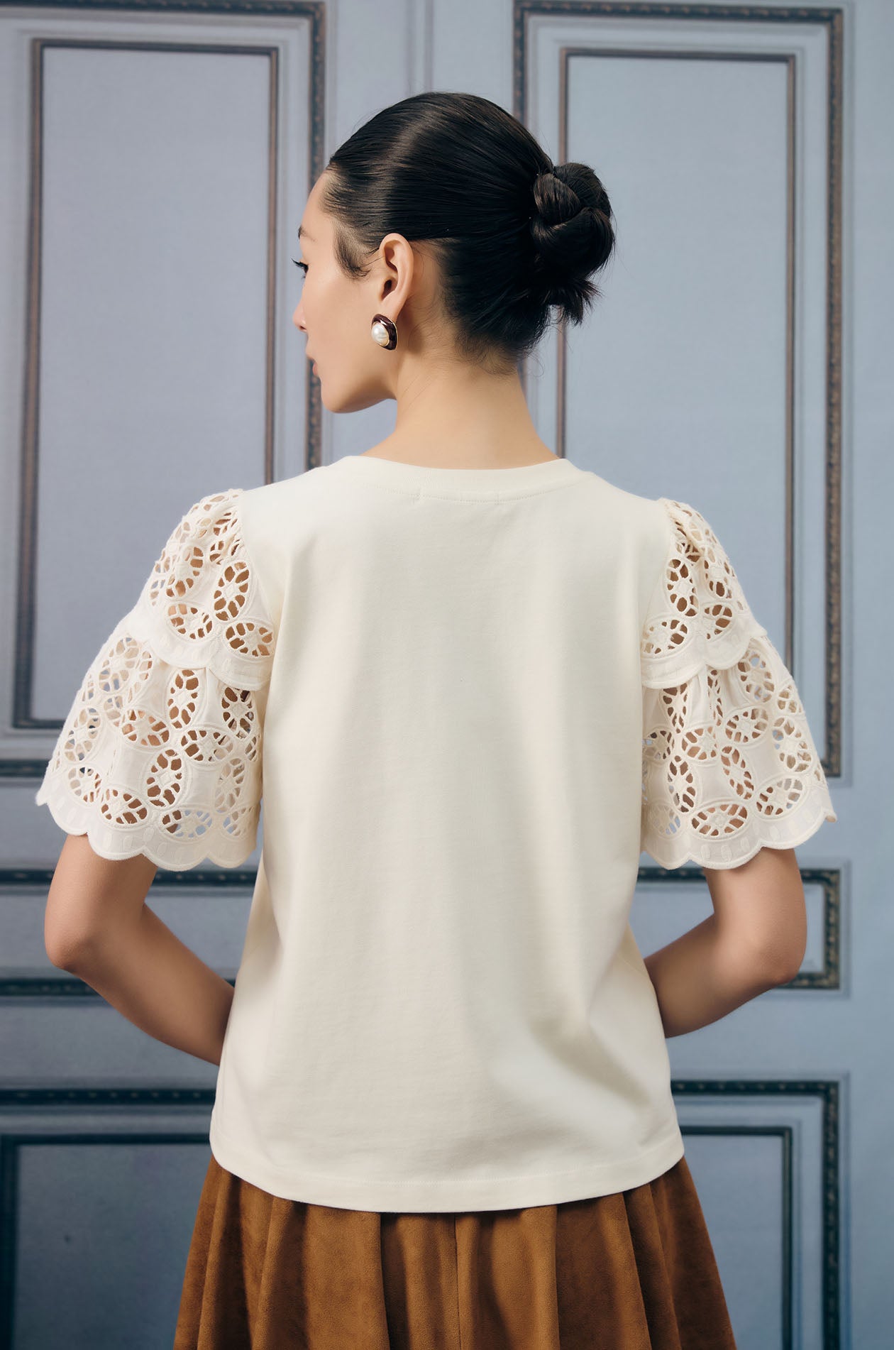 Short-sleeved top in cotton jersey with broderie anglaise sleeves. Regular fit with round neckline. Available in cream.