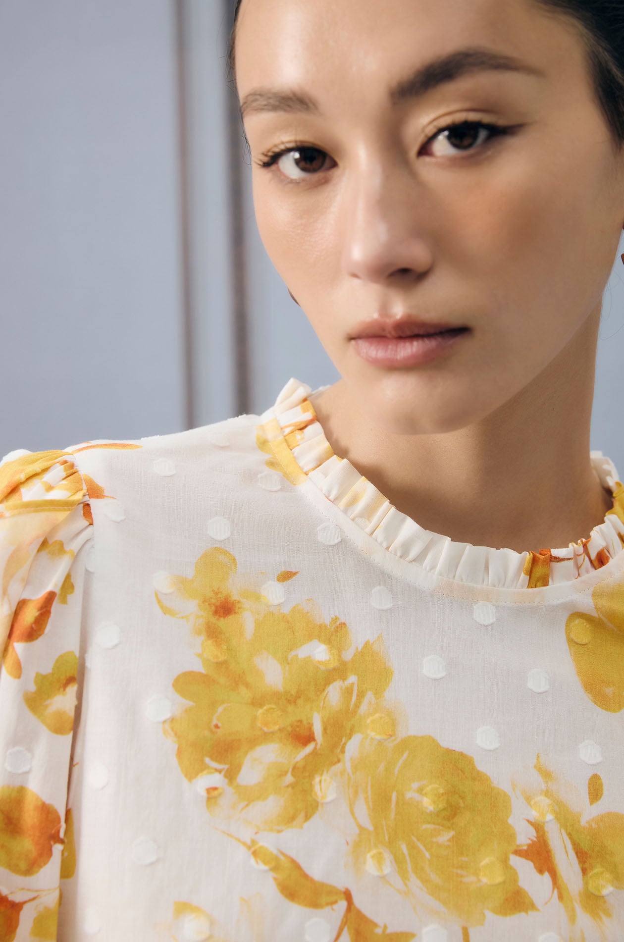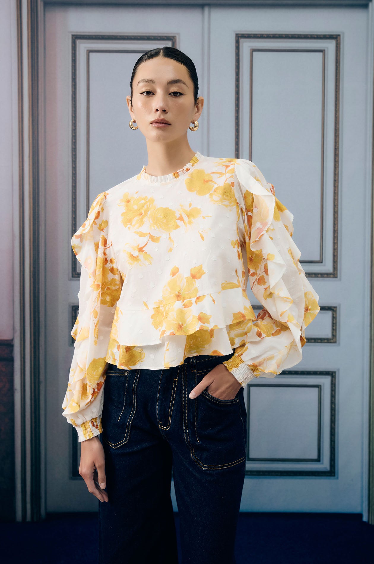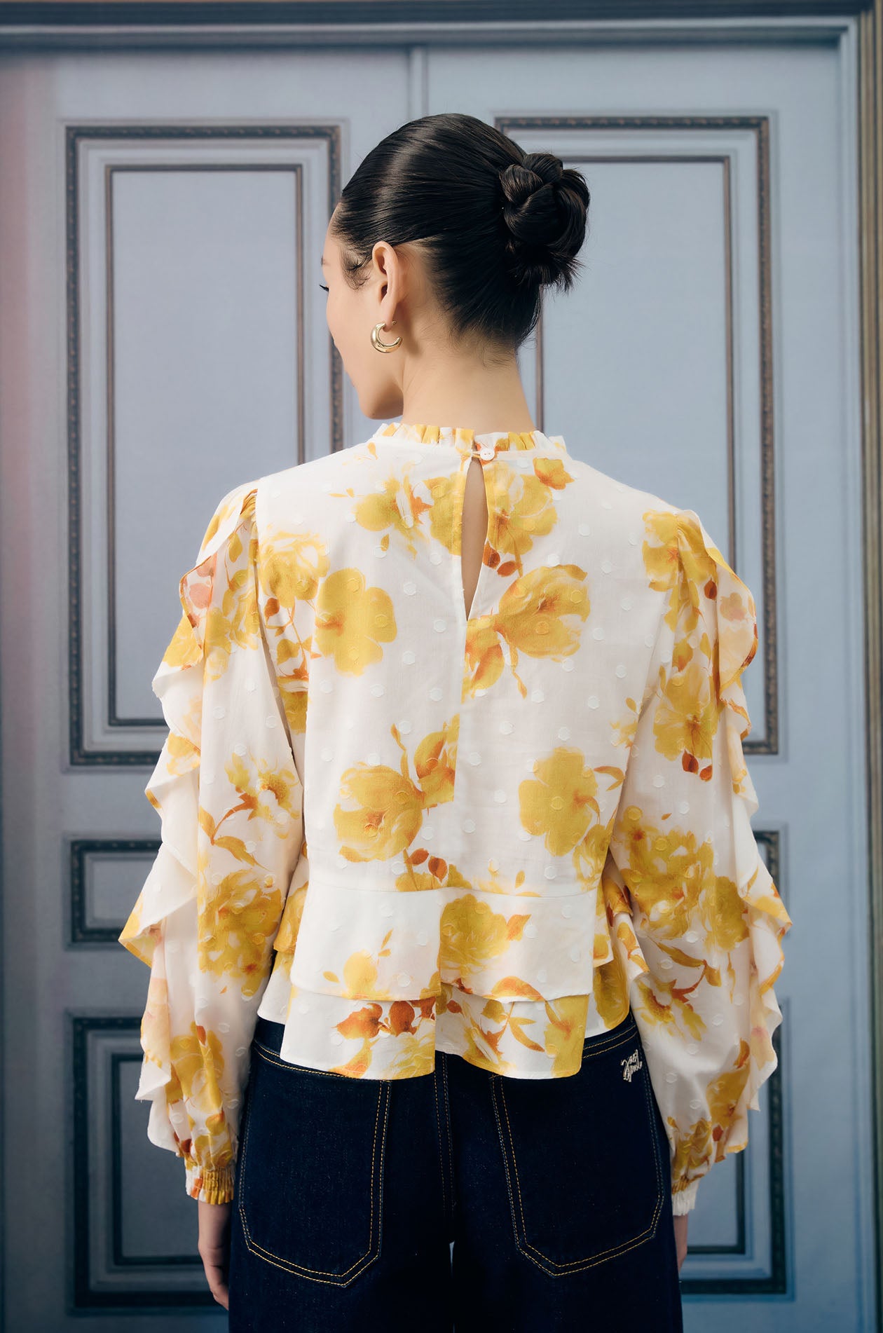 Long-sleeved blouse in lightweight jacquard with dot pattern. Relaxed fit with floral print, flounce detail, and elastic cuffs. Back loop button closure. Available in white/yellow.
