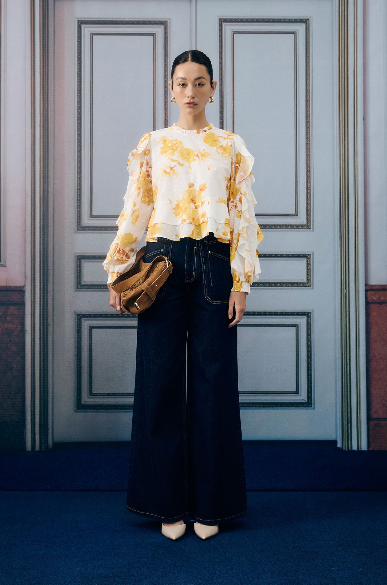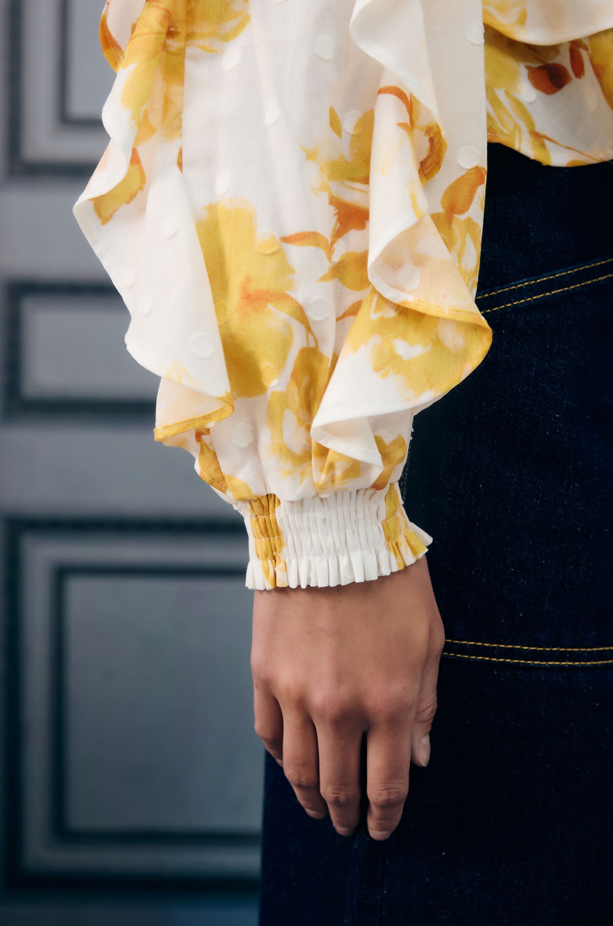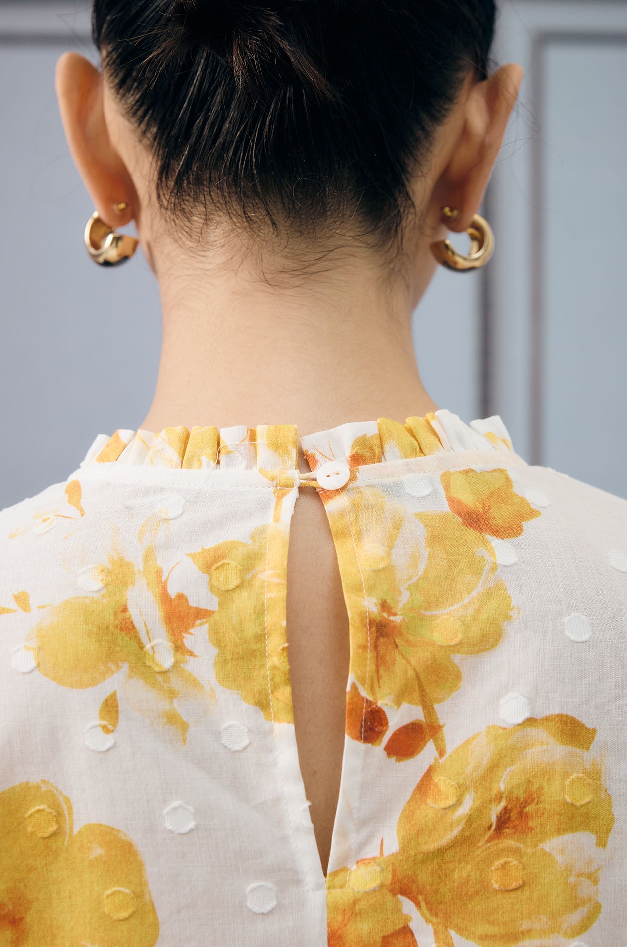 Long-sleeved blouse in lightweight jacquard with dot pattern. Relaxed fit with floral print, flounce detail, and elastic cuffs. Back loop button closure. Available in white/yellow.