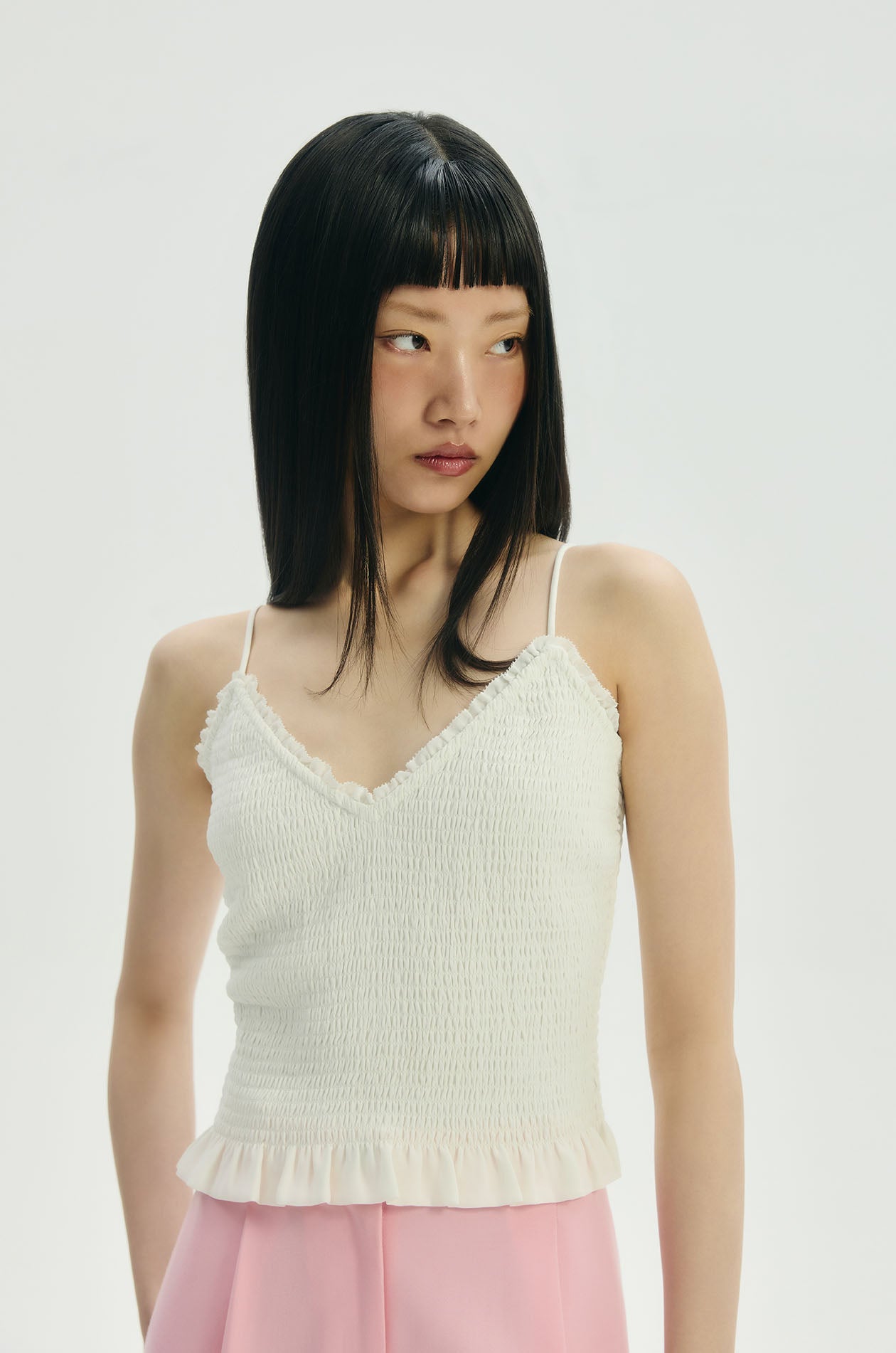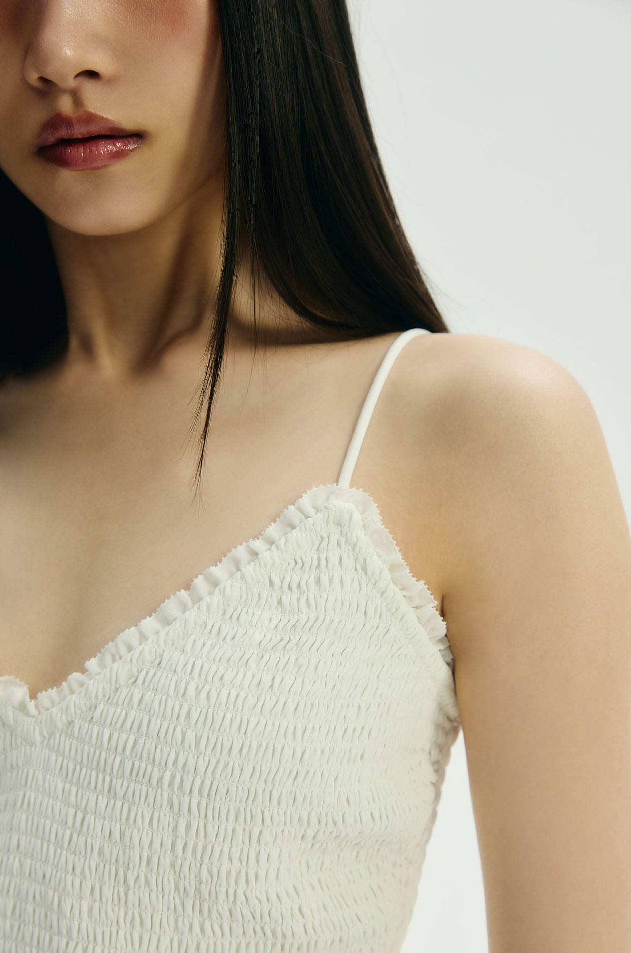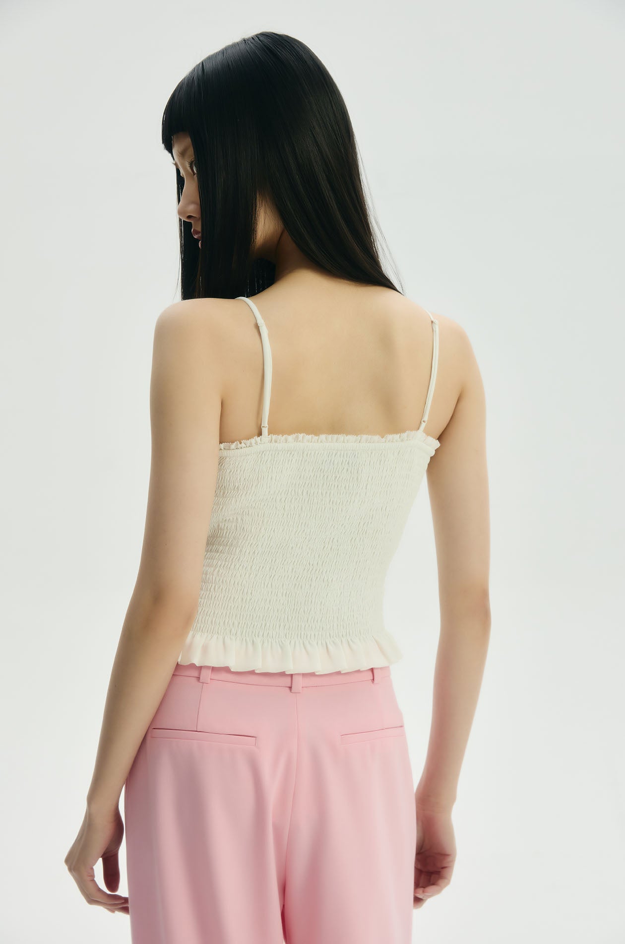 Strappy cami top in chiffon. Featured a smocked bodice with ruffle-trimmed edges and adjustable camisole straps. Available in off-white.