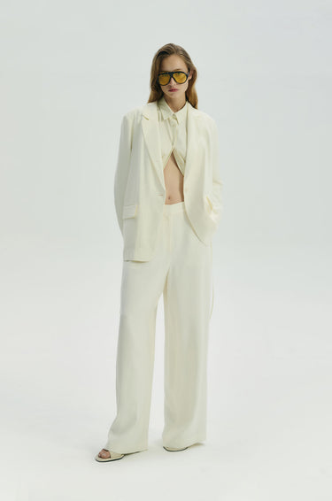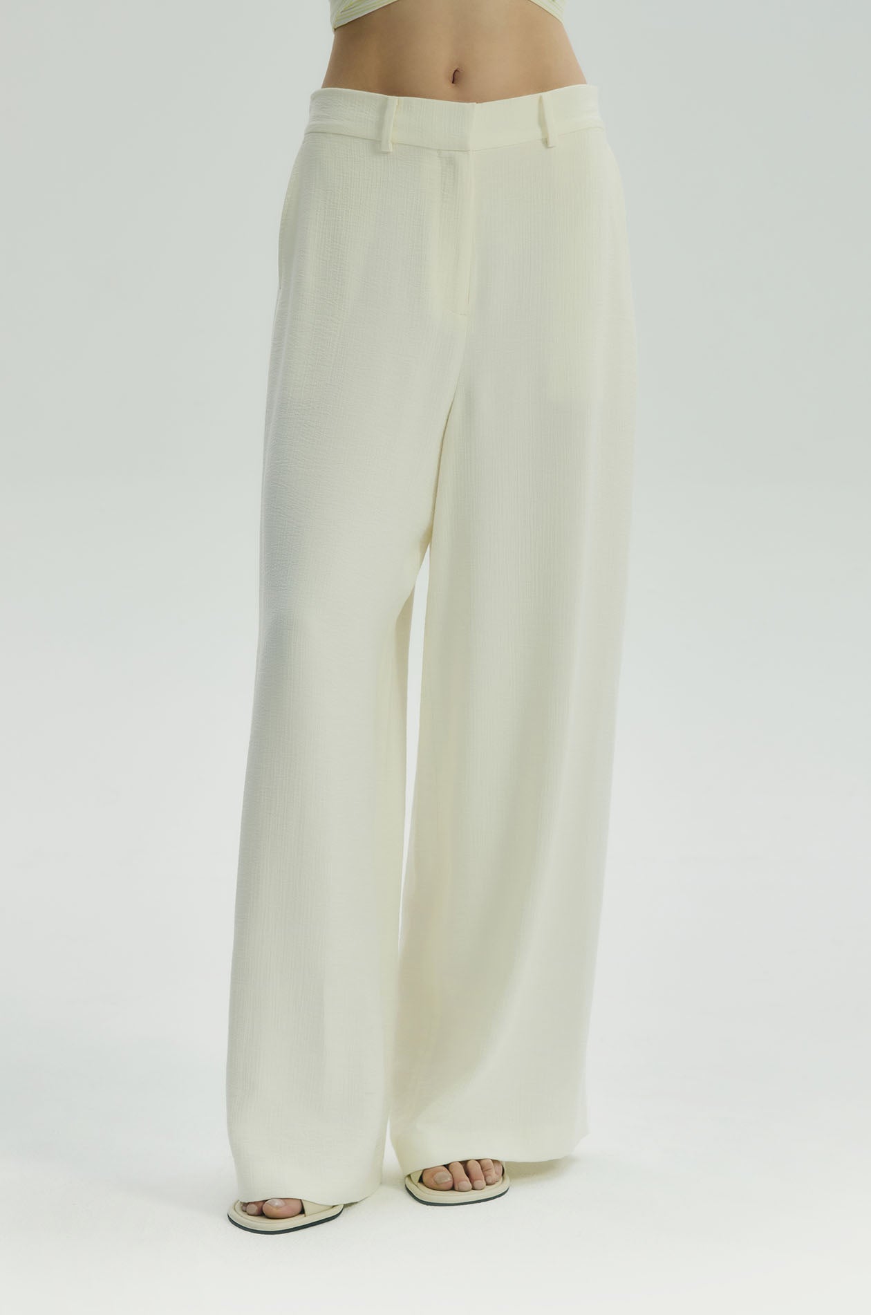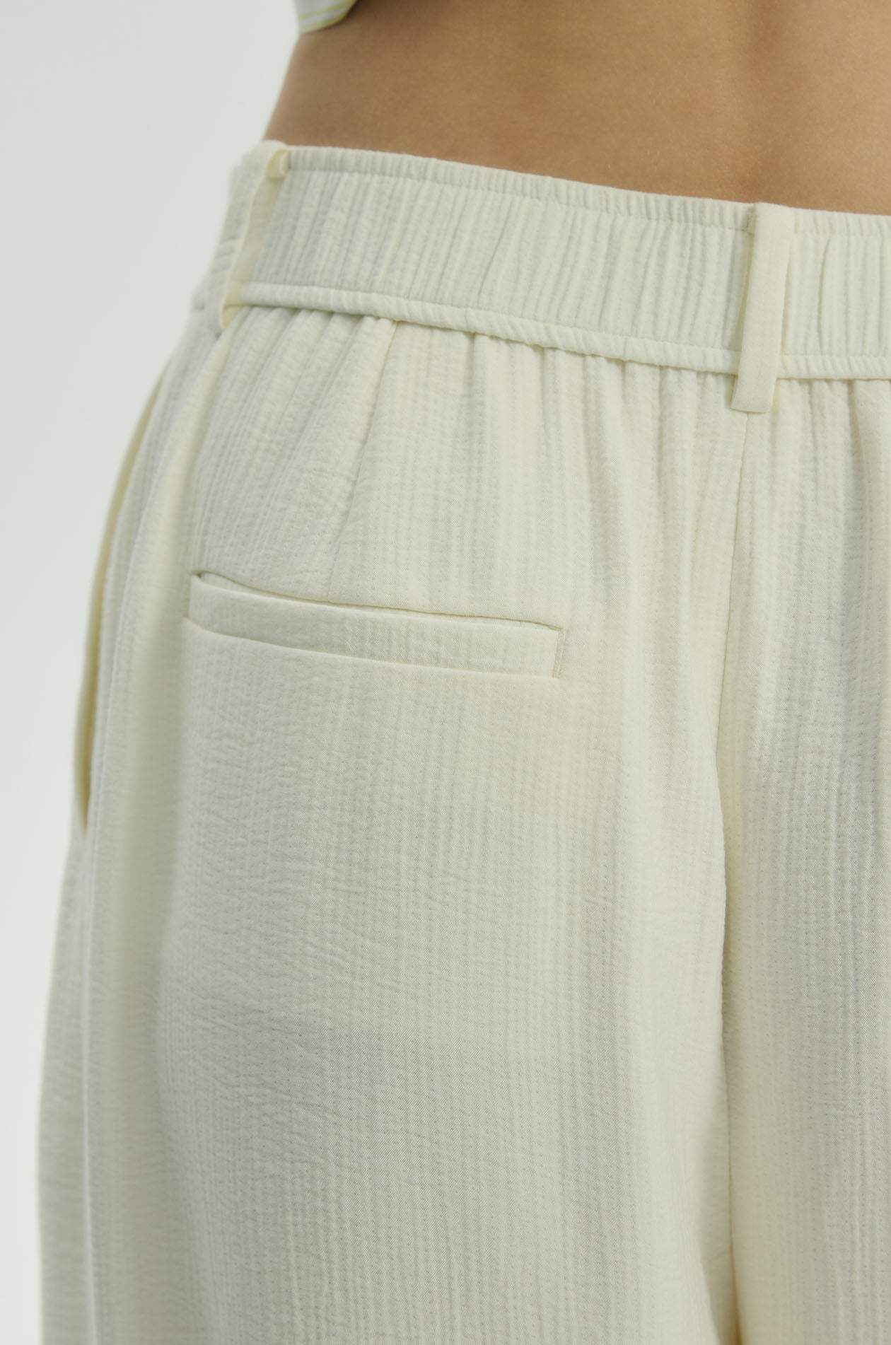 Mid-rise pants in crinkled lightweight fabric. Wide legs with side and back pockets. Elastic back waistband. Front hook and zip closure. Available in off-white.