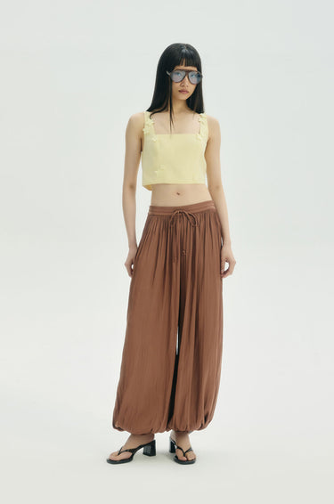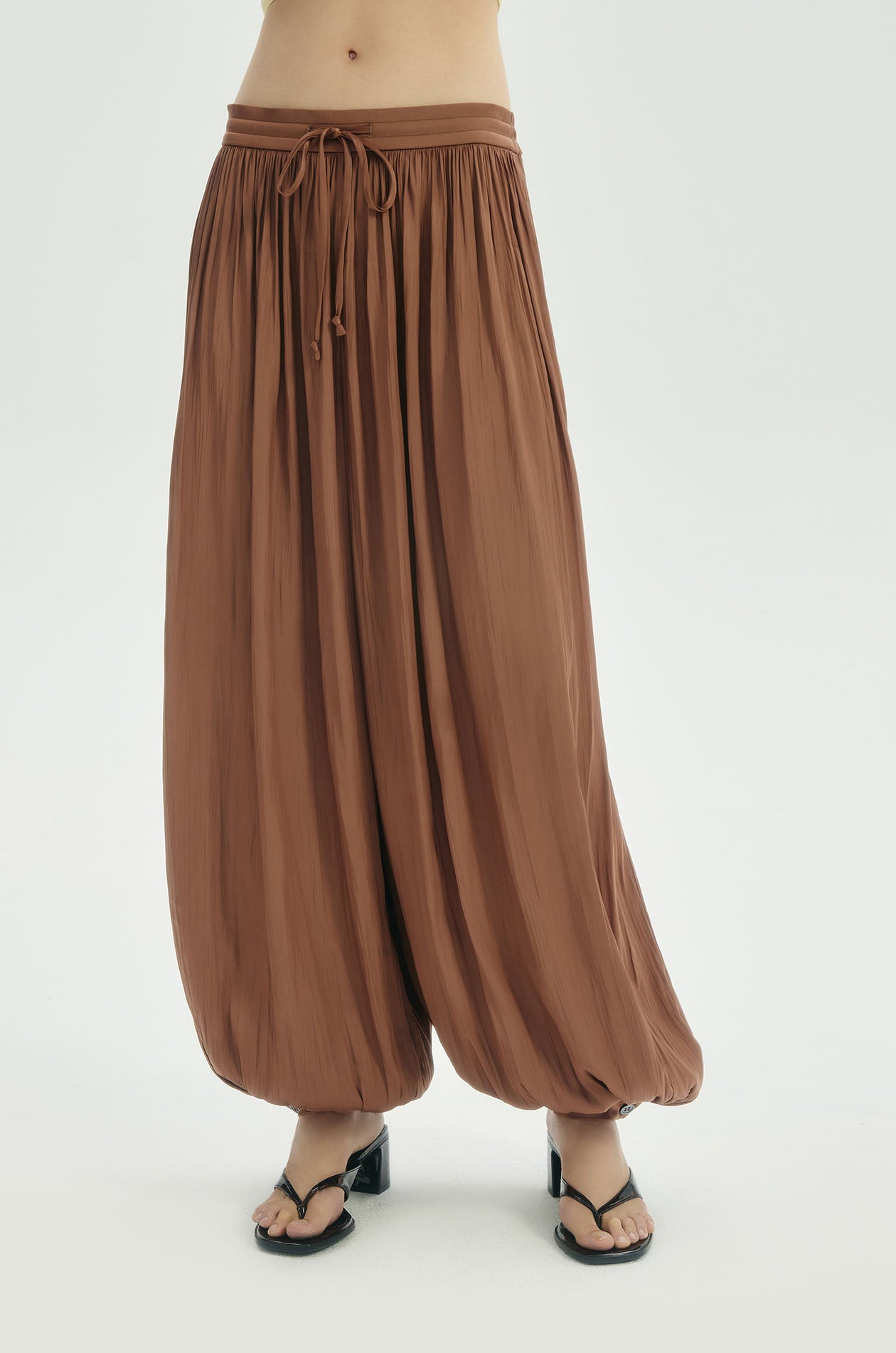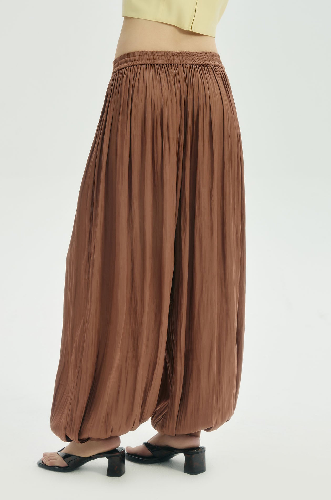 Mid-rise pants in crinkled plisse satin. Balloon legs with elastic drawstring waistband and buttoned hems. Available in Chocolate Brown.