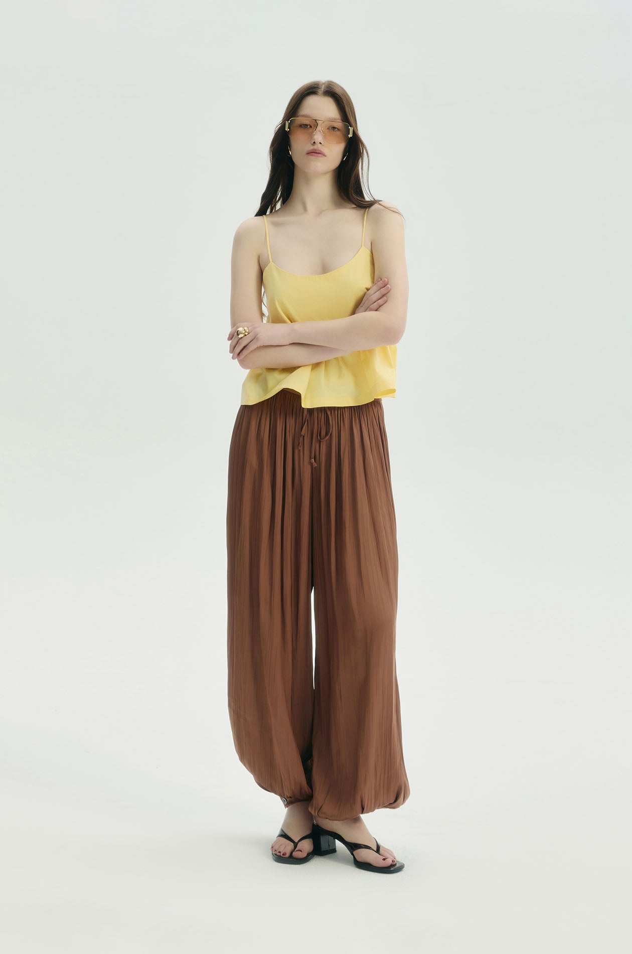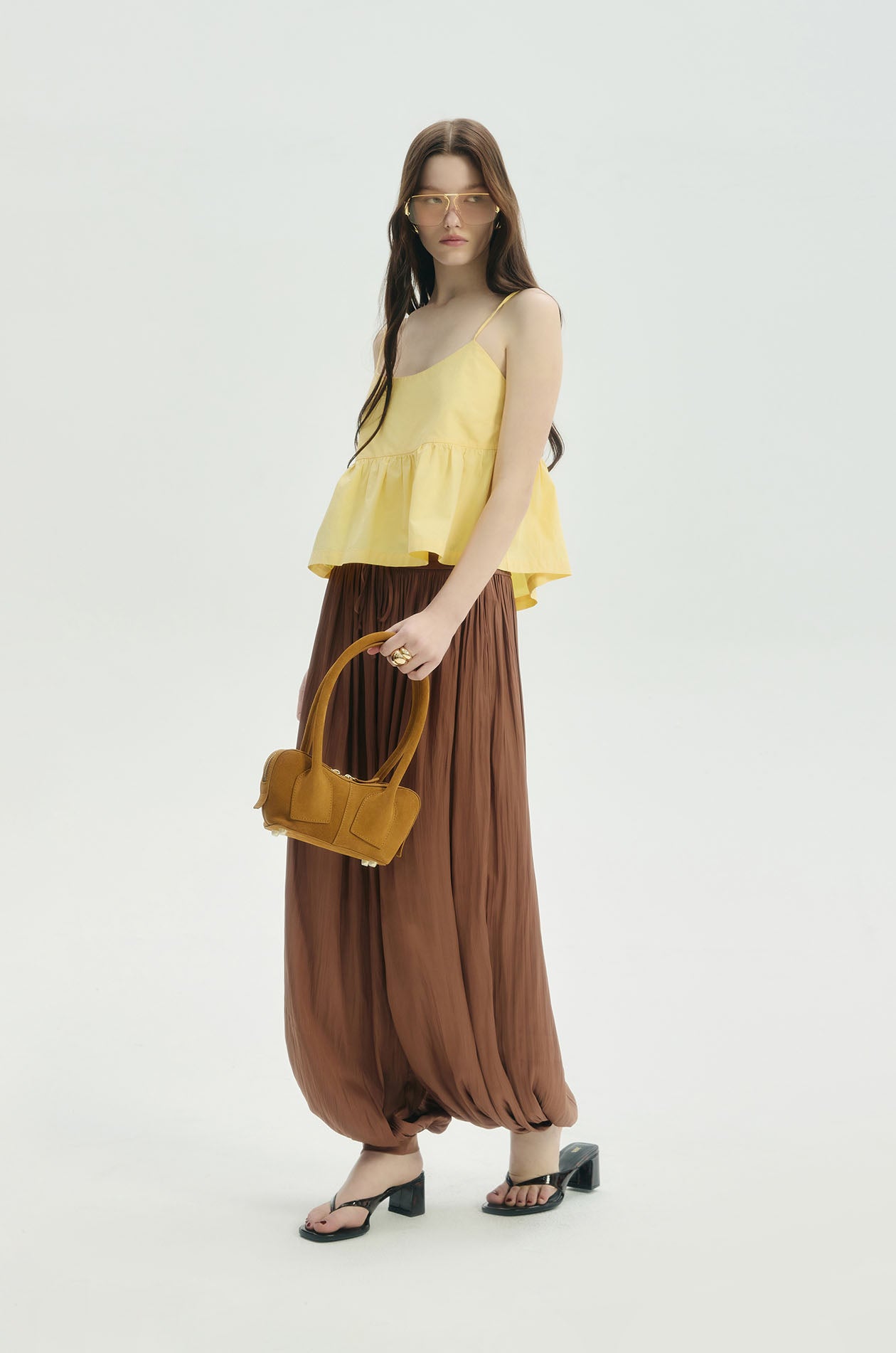 Strappy crop top in poplin. Camisole straps and flounce hem. Back lace-up closure. Available in yellow.
