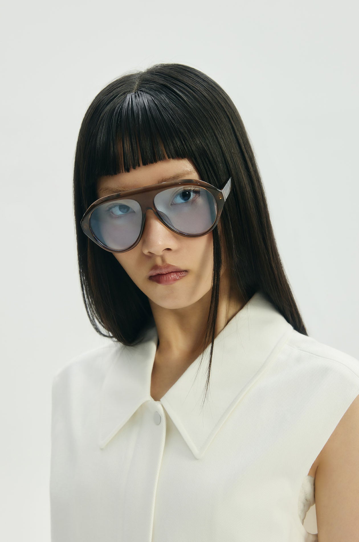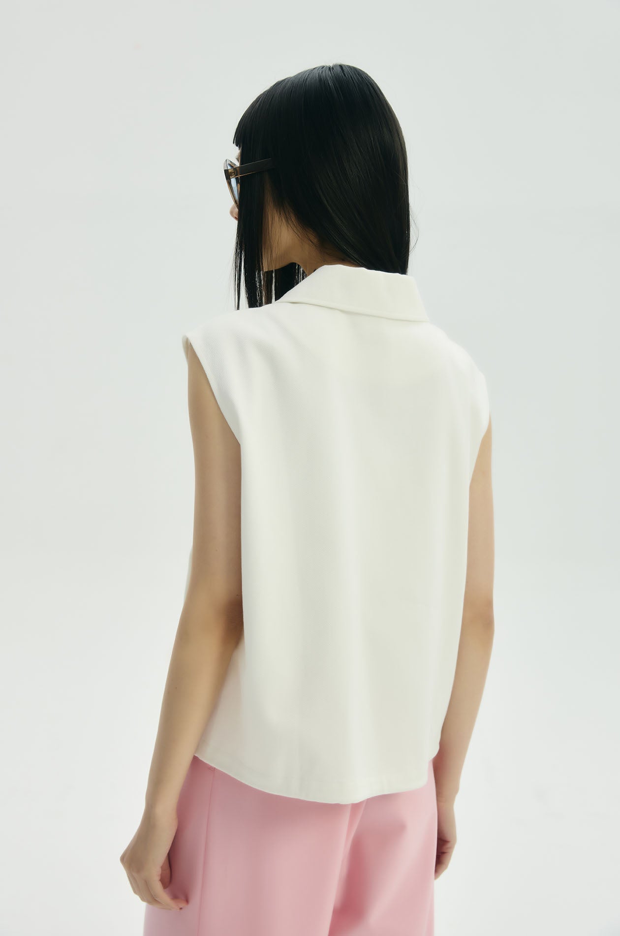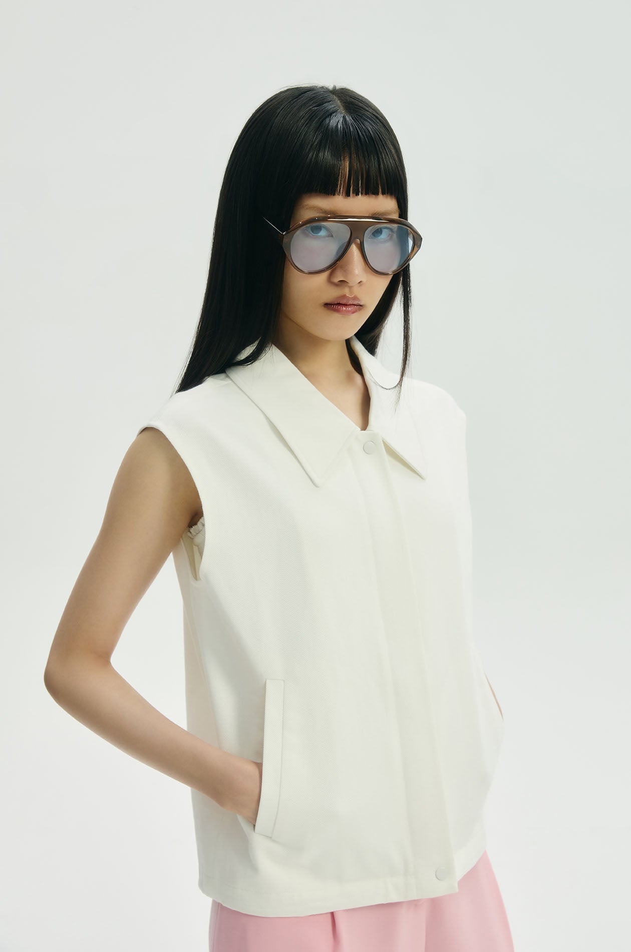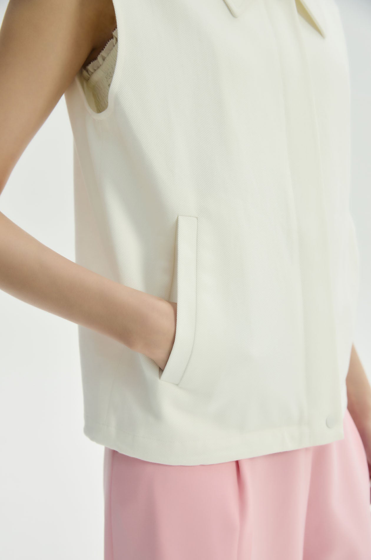 Vest jacket in twill fabric. Regular fit with classic collar and front pockets. Front zip and button closure. Available in white.