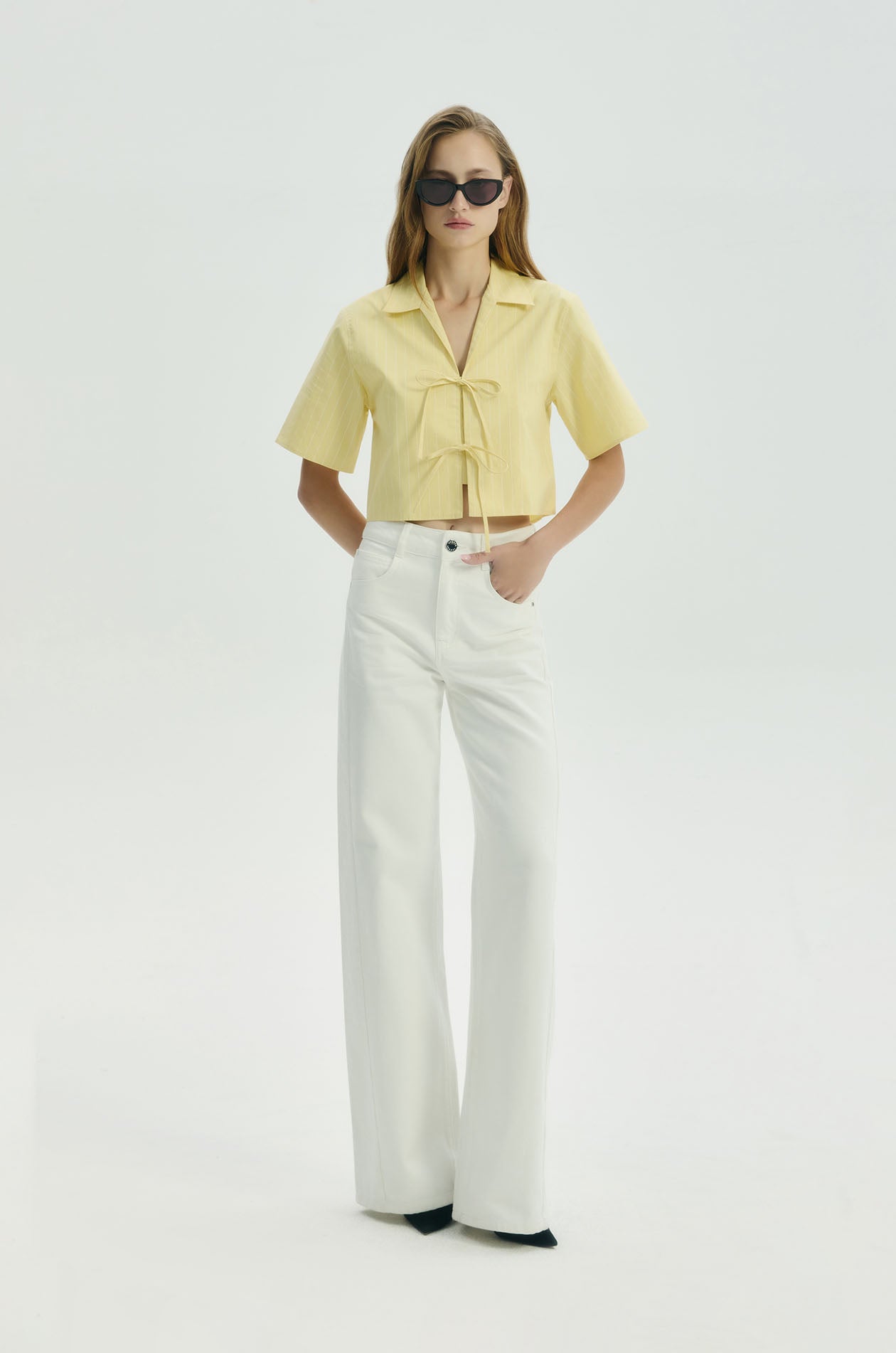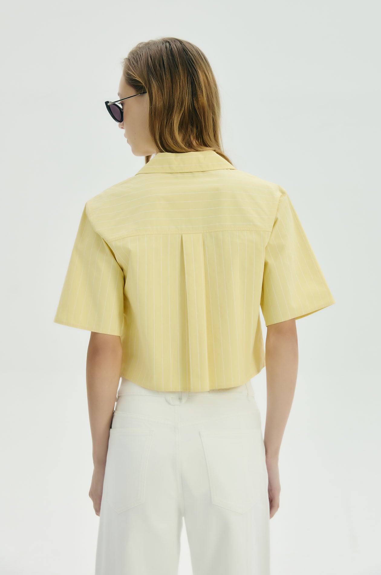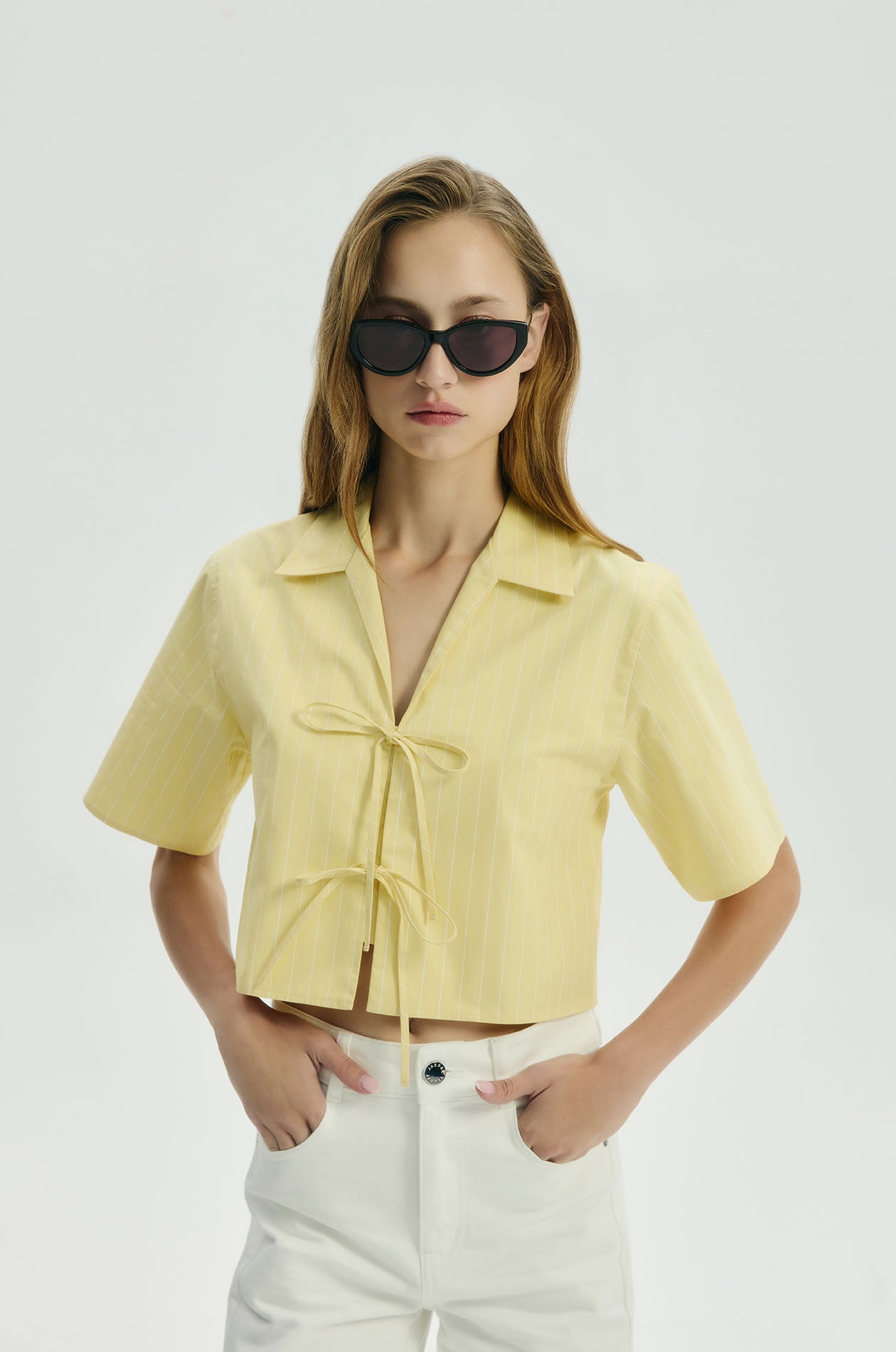 Short-sleeved cropped blouse in peach-finish poplin with stripes. Regular fit with spread collar and deep V-neck. Front tie closure. Available in yellow.