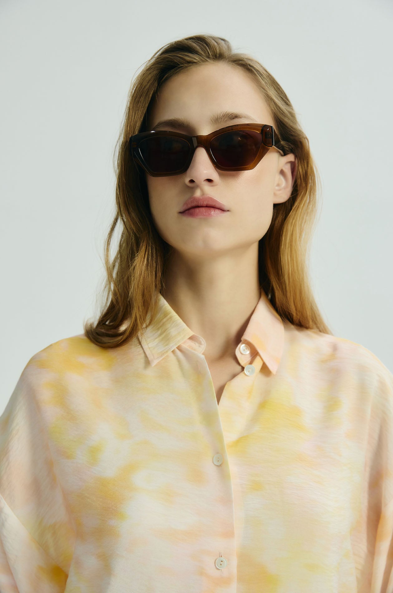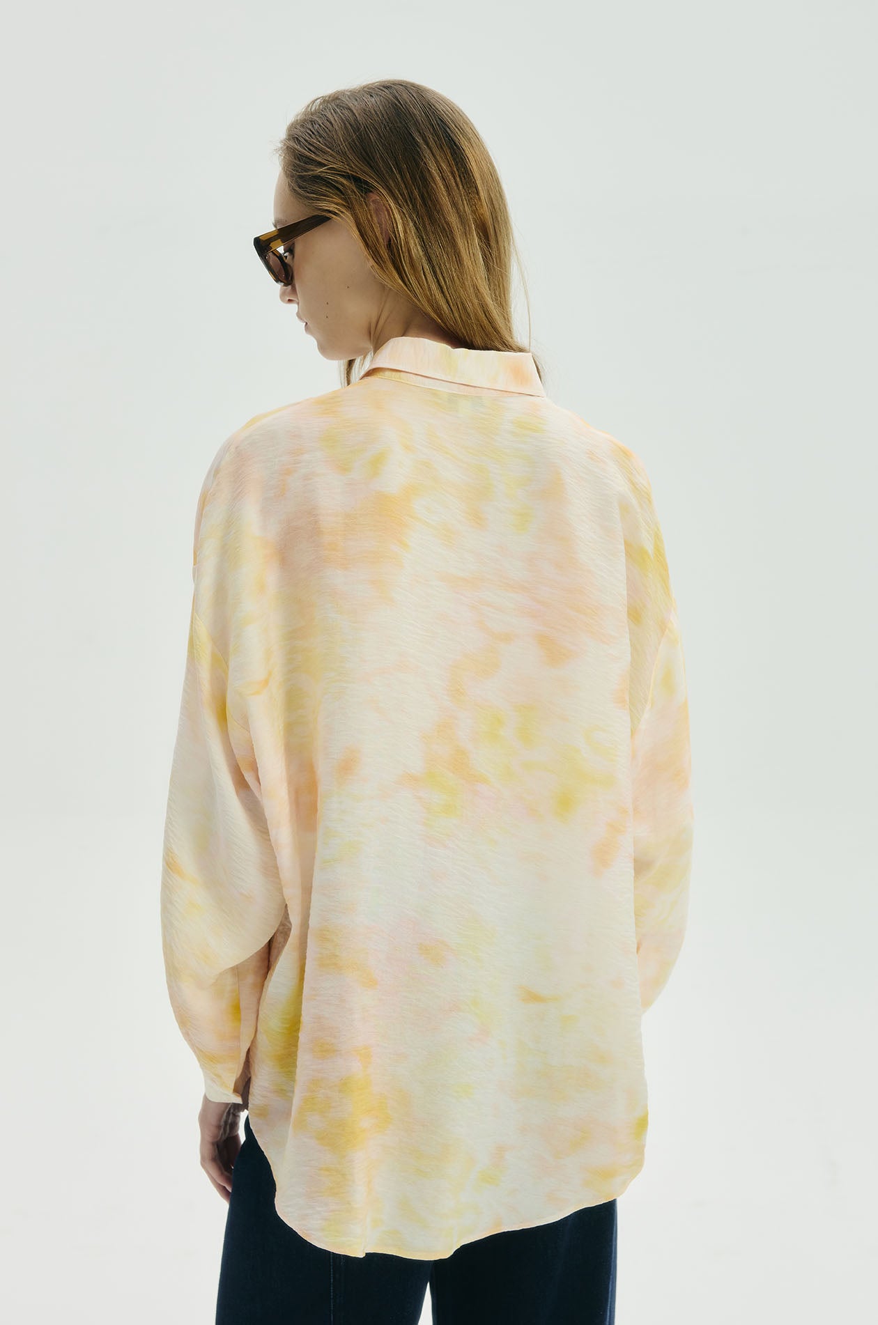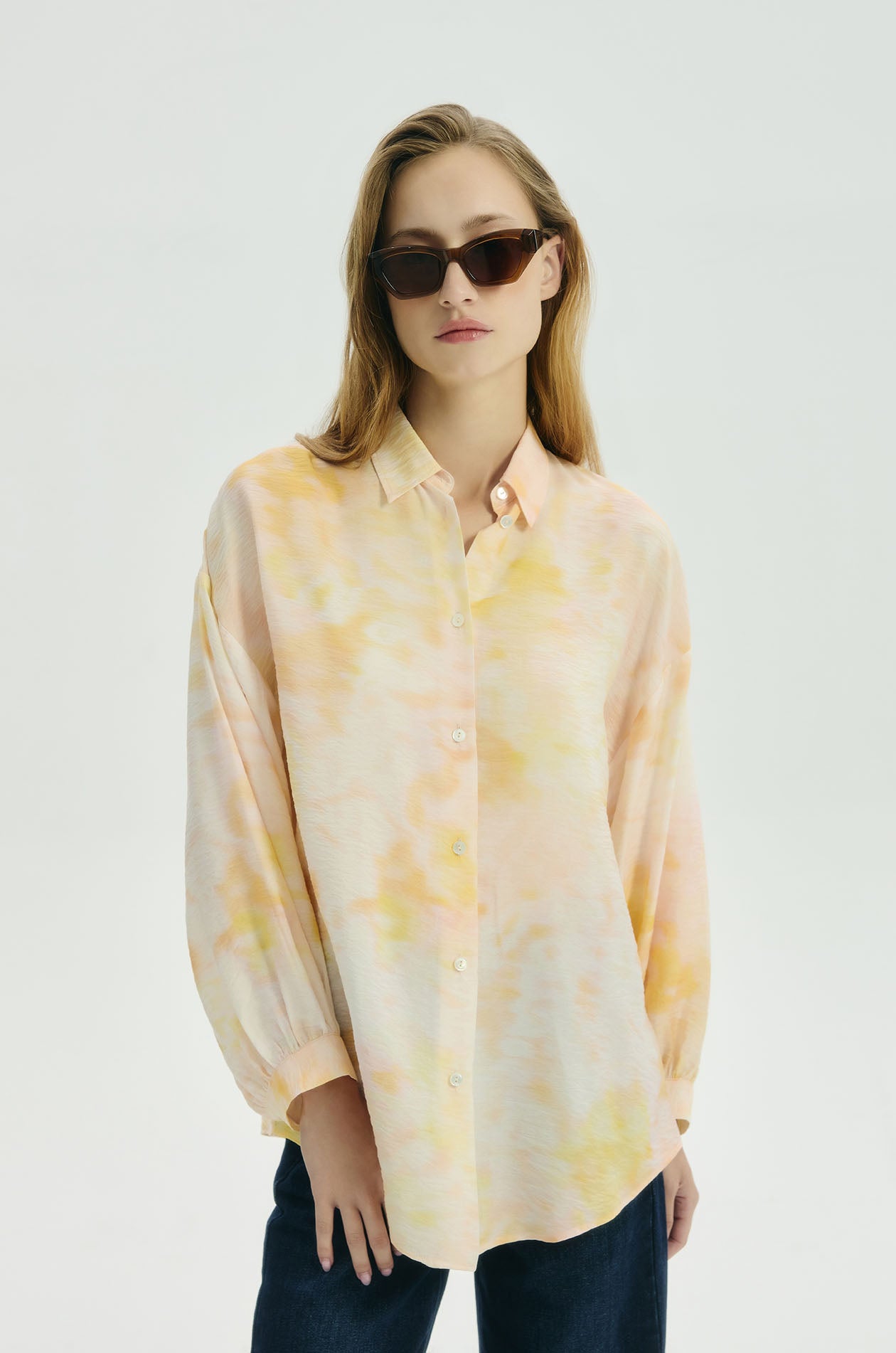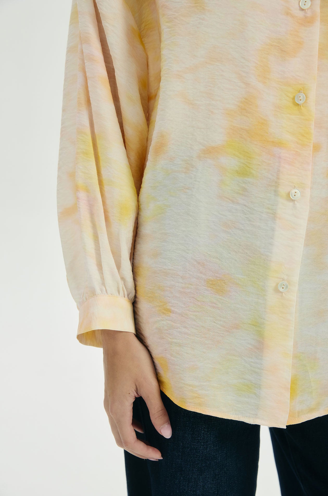 Long-sleeved shirt in crinkled lightweight fabric. Drop shoulder silhouette with classic collar and bishop sleeves. Front button closure. Available in Sunrise Sky.