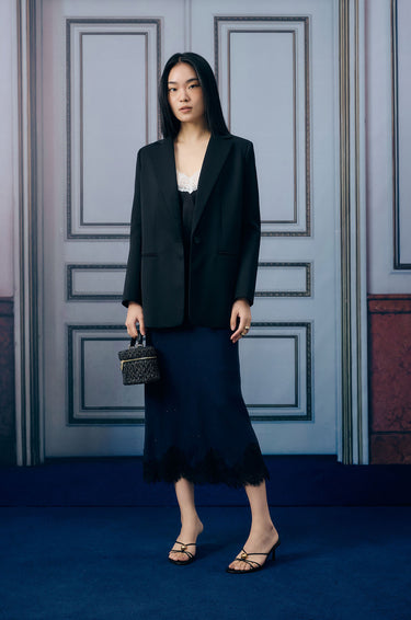 Mid-rise midi skirt in lightweight fabric with floral lace trim. Column silhouette with side zip closure. Available in black and blue.