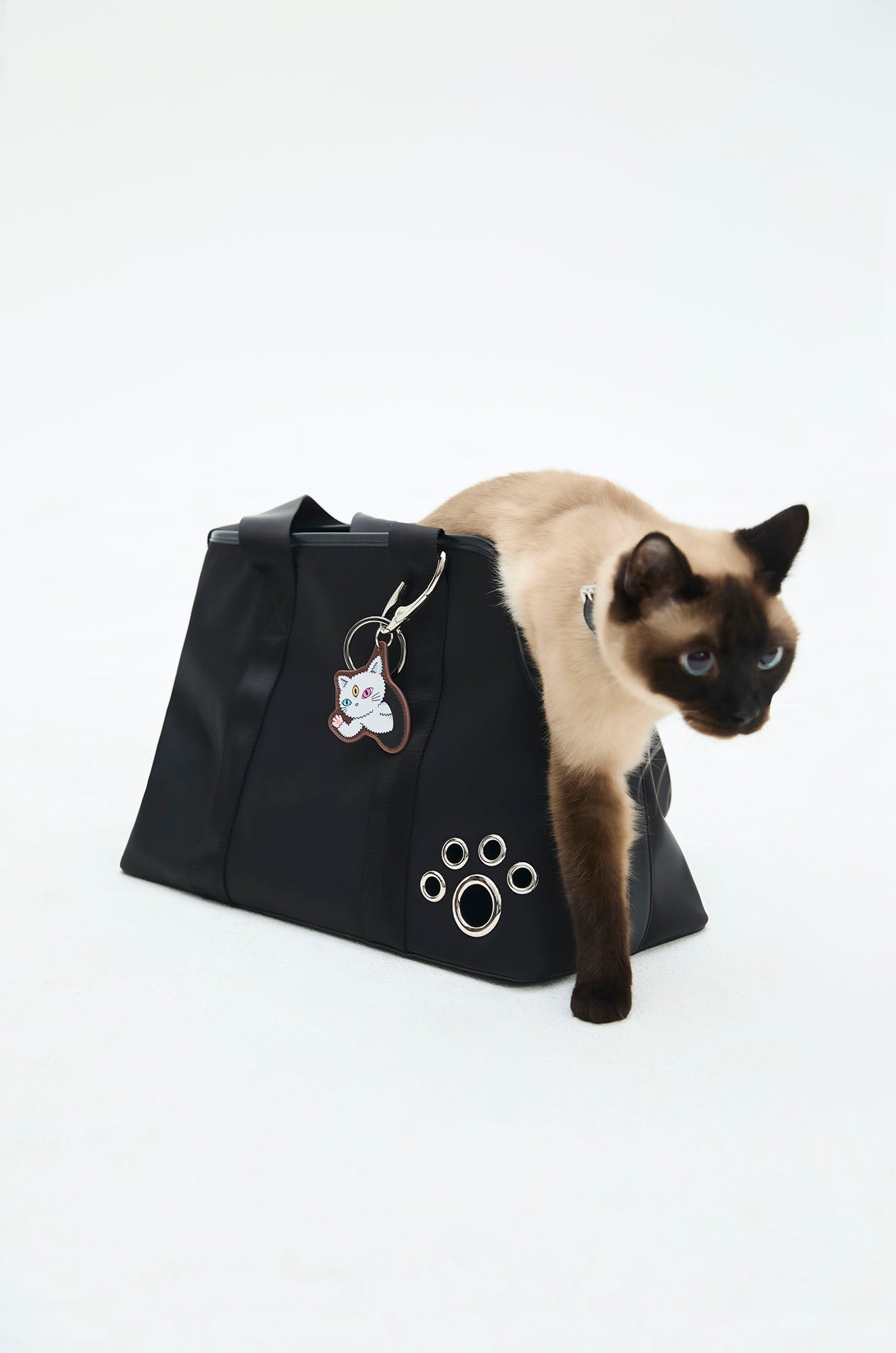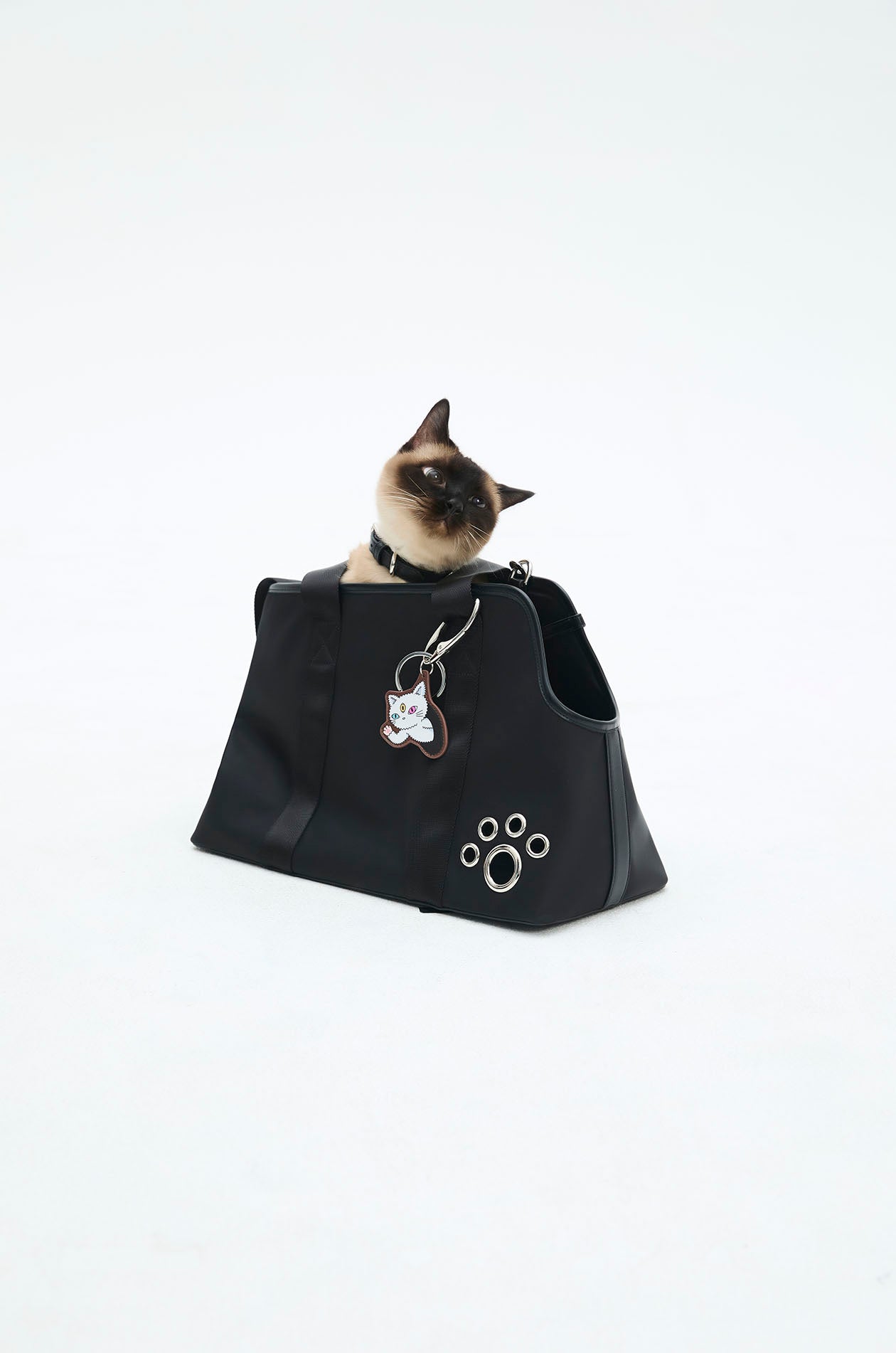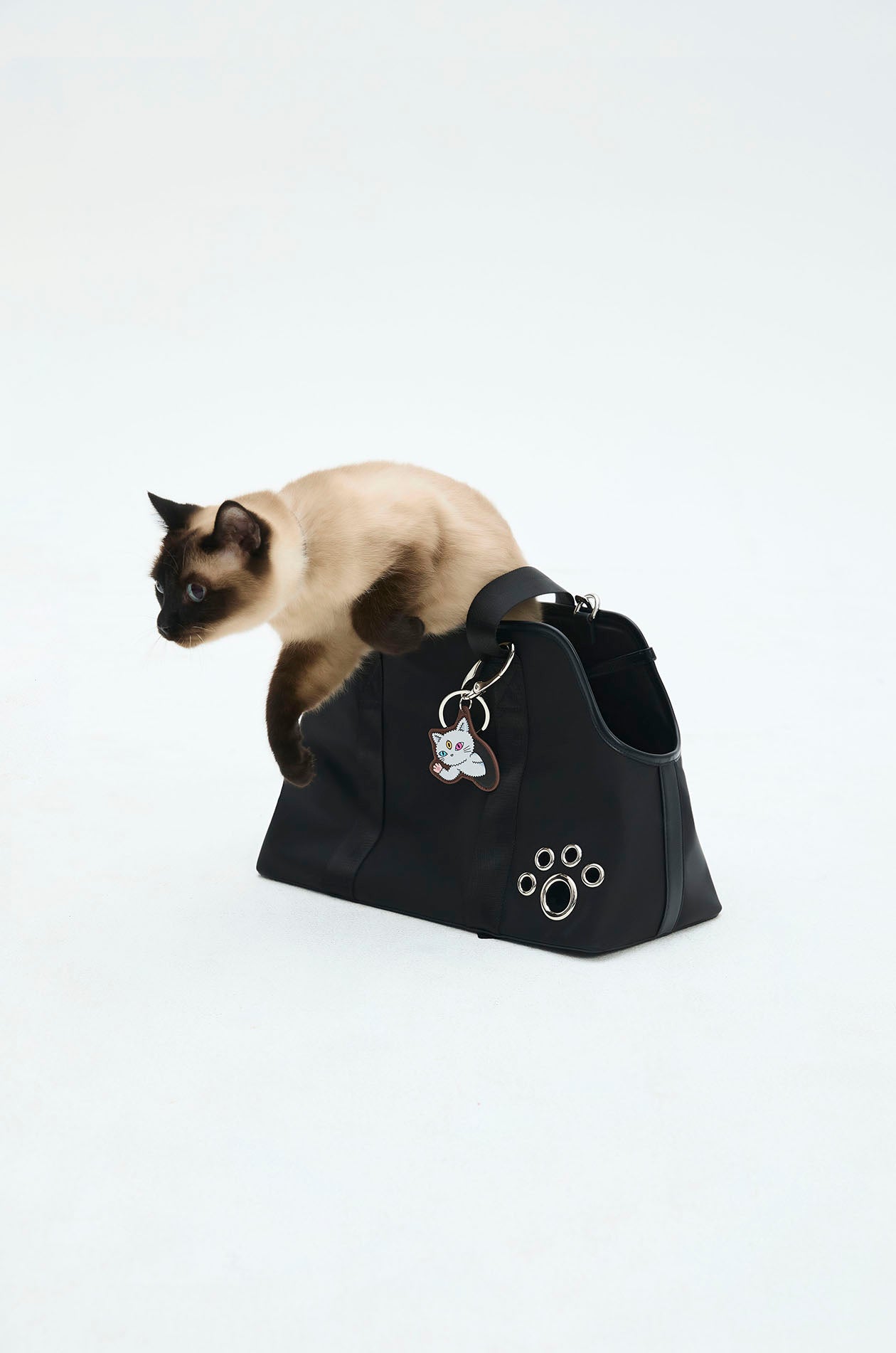 Gongkan x Jaspal | Pet carrier bag in faux leather with nylon straps. Adorned with metal O-rings, inspired by Gongkan’s signature teleport-hole artwork. Available in black.