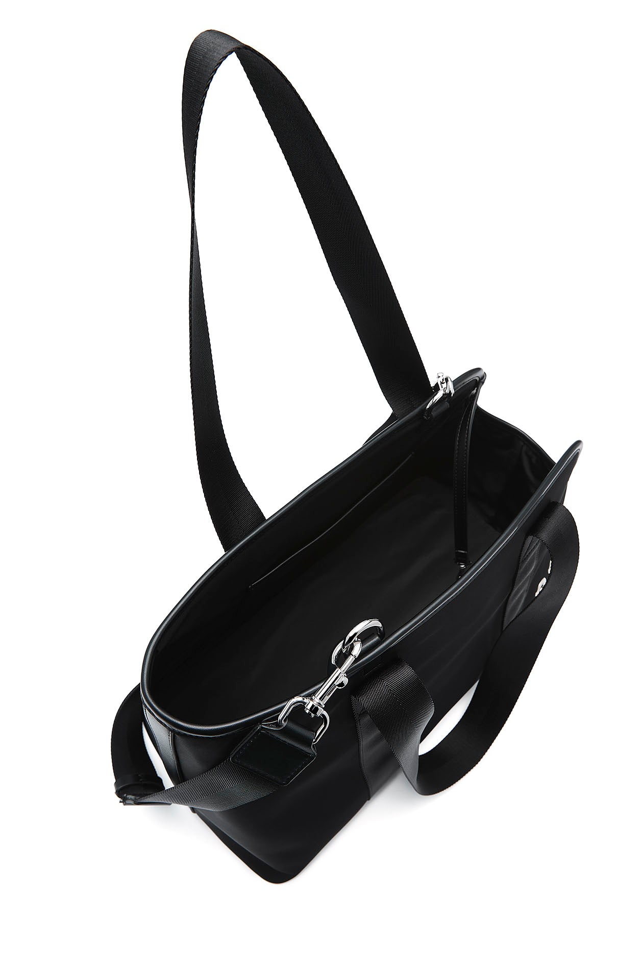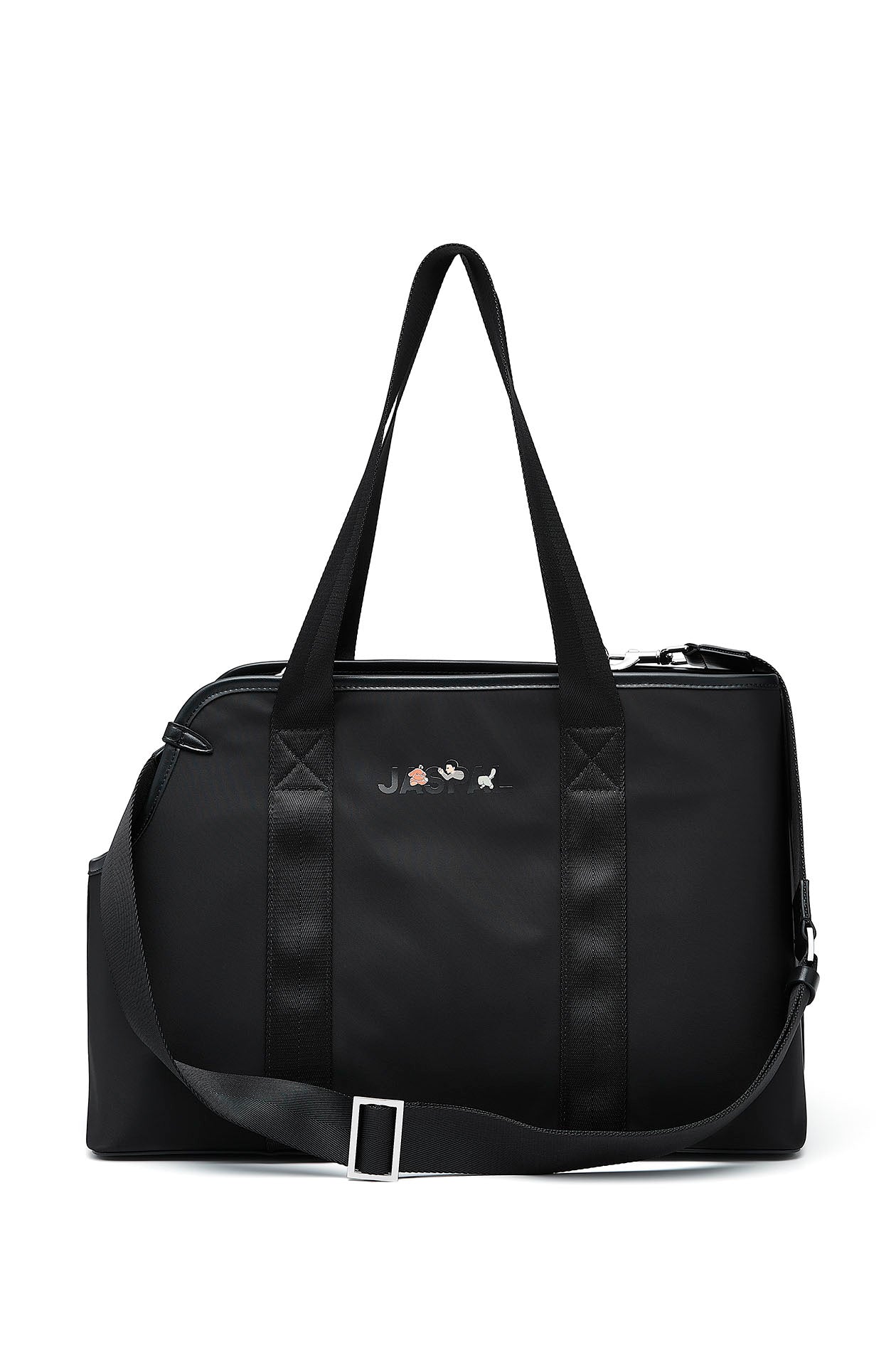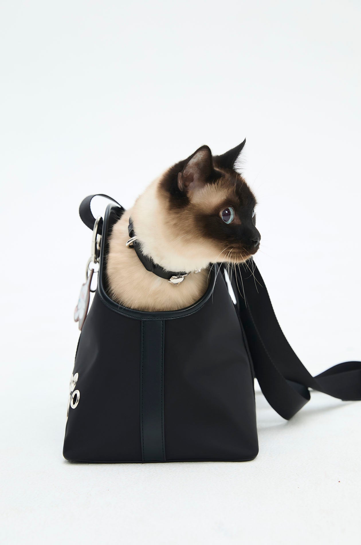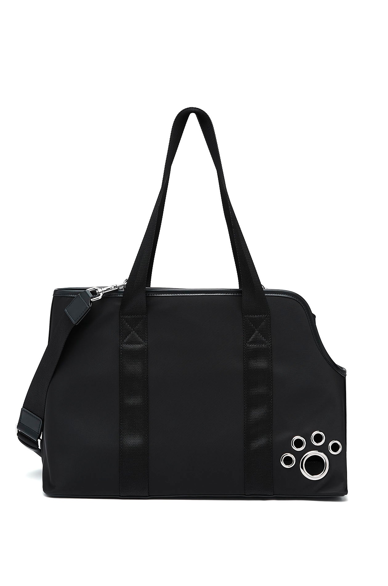 Gongkan x Jaspal | Pet carrier bag in faux leather with nylon straps. Adorned with metal O-rings, inspired by Gongkan’s signature teleport-hole artwork. Available in black.