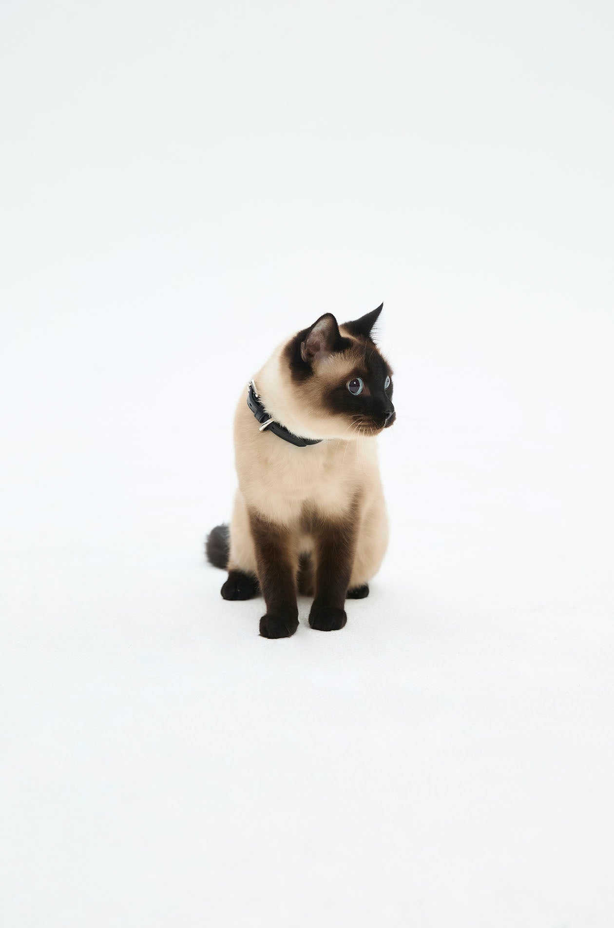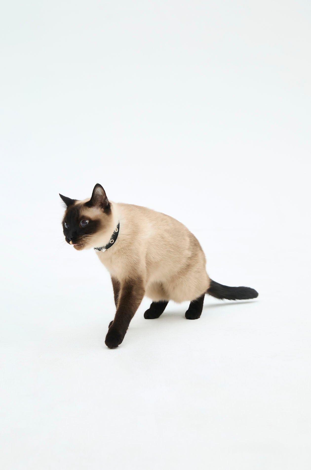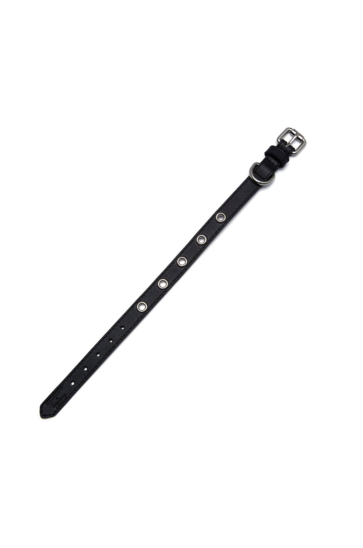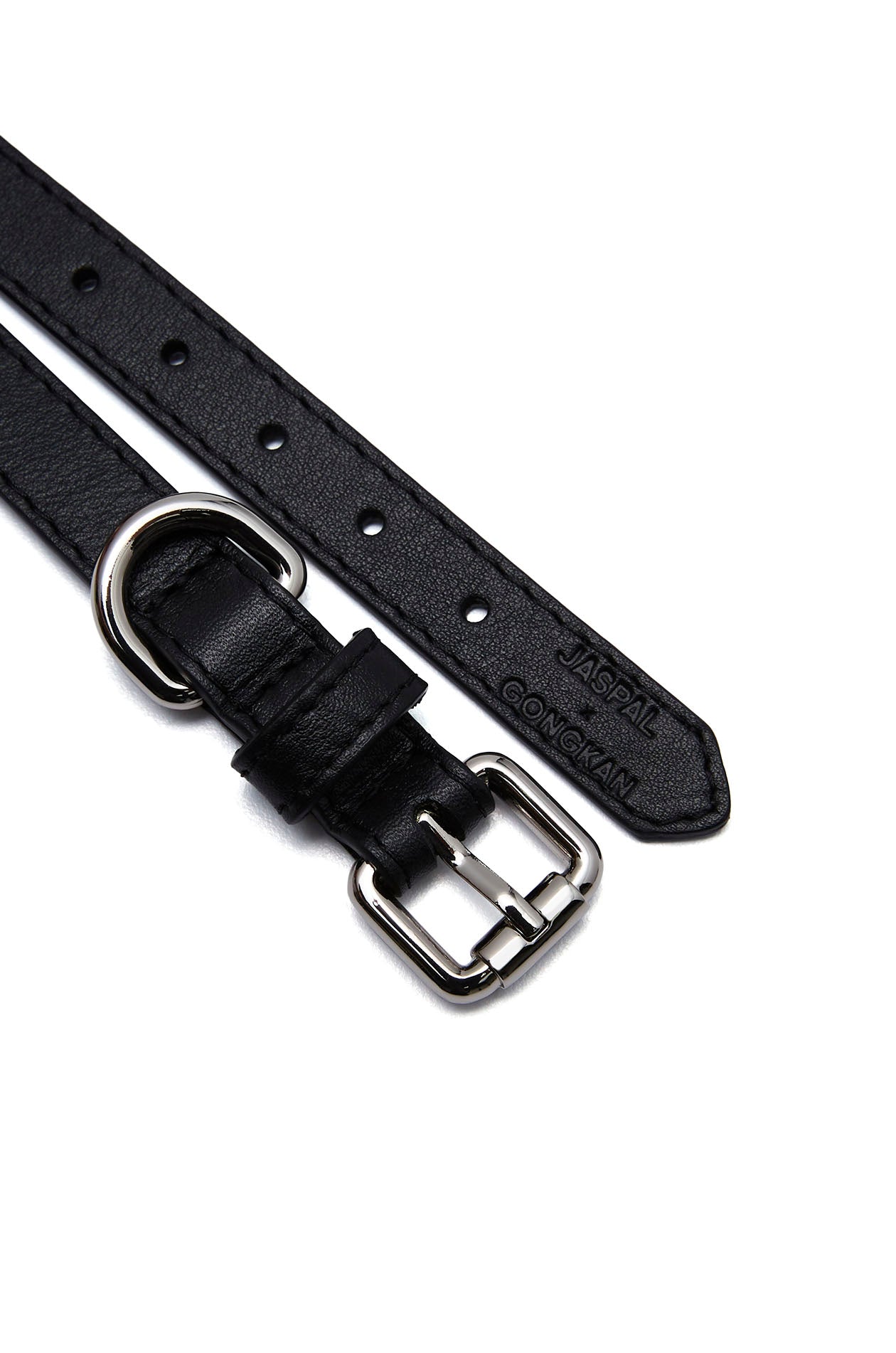 Gongkan x Jaspal | Cat collar in cow leather. Adorned with metal D-rings, inspired by Gongkan’s signature teleport-hole artwork. Available in black.