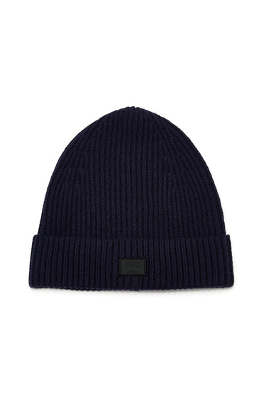 Beanie hat in ribbed knit. Faux leather badge applique. Available in navy and brown.