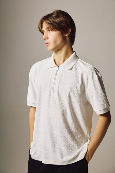 Short-sleeved polo shirt in jacquard. Allover embossed JJ diamond monogram motif creates an eye-catching relief effect. Relax fit with spread collar and silver hardware applique at hem. Available in black and white.