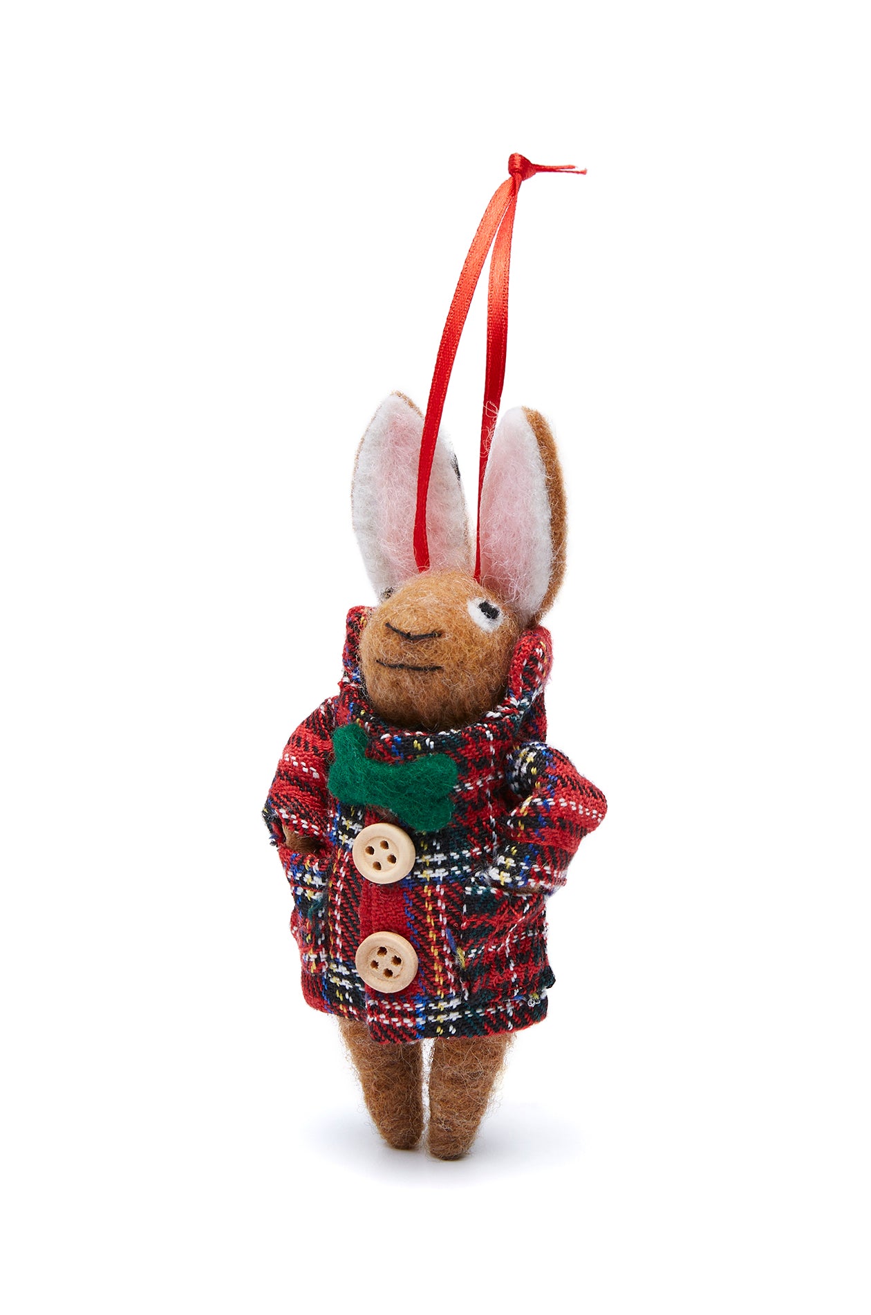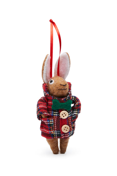 The charming Christmas ornament featuring a brown bunny in a playful pose with the delightful details including a green beret and a cozy knit scarf. Available in brown.