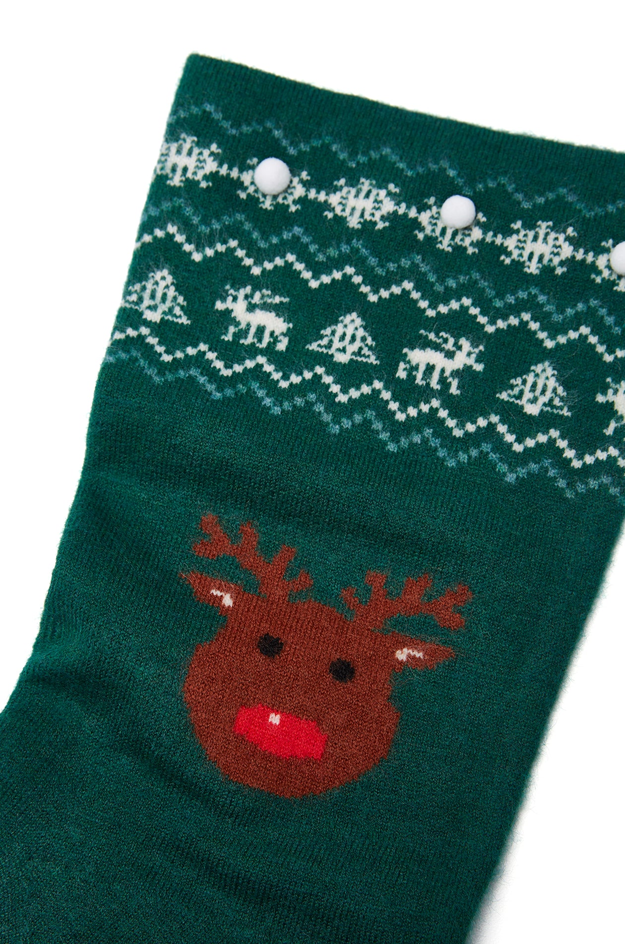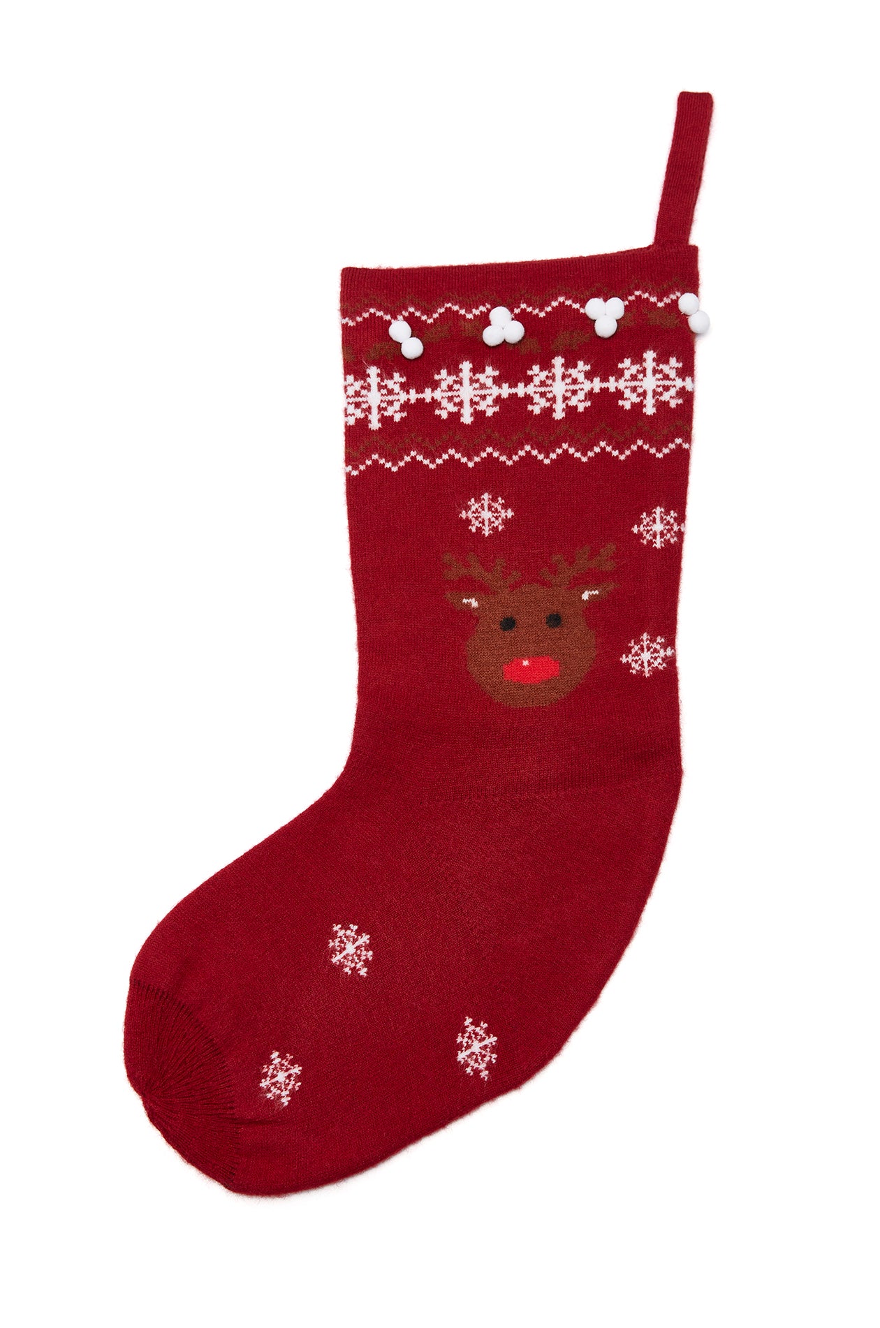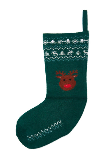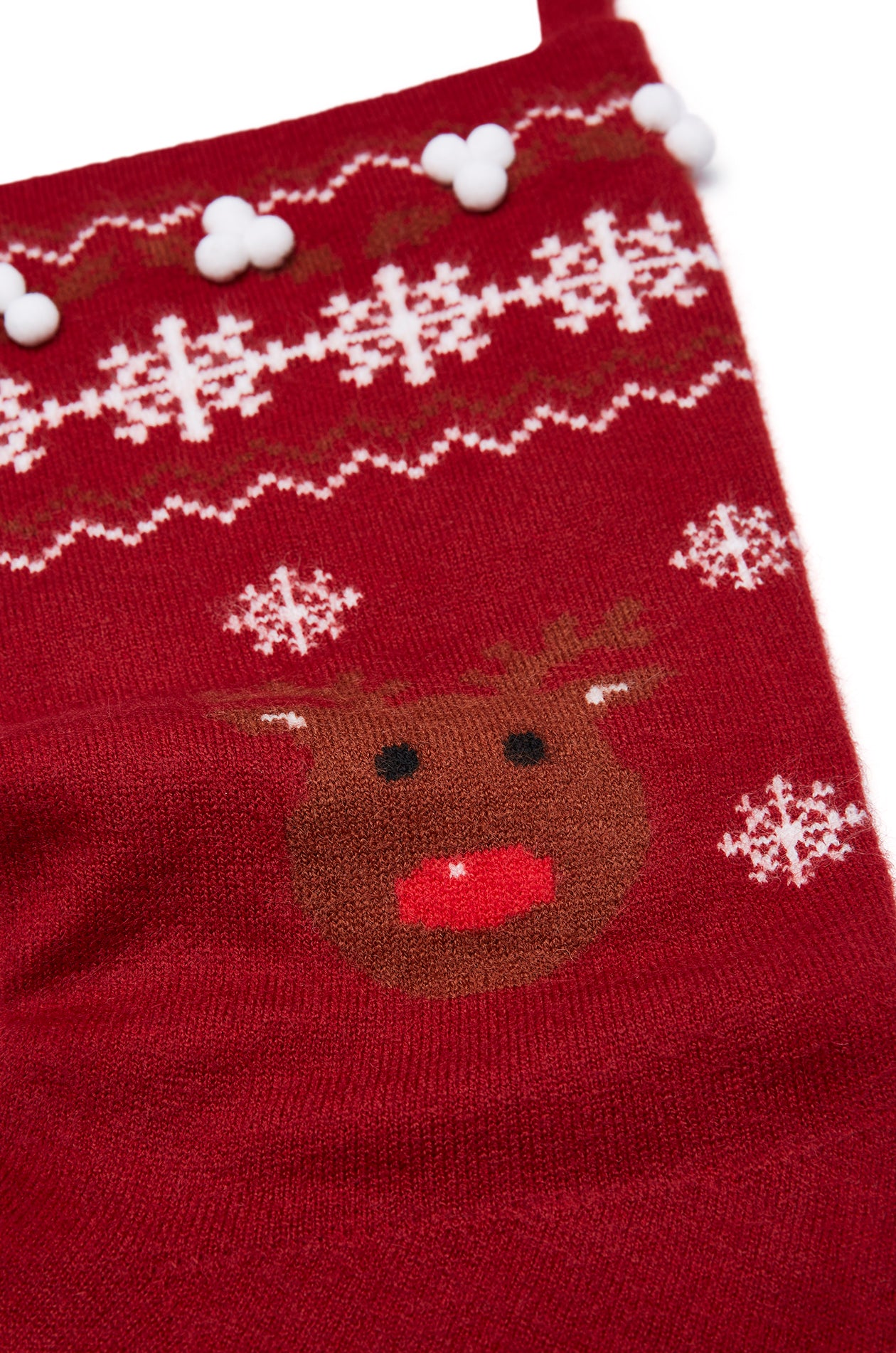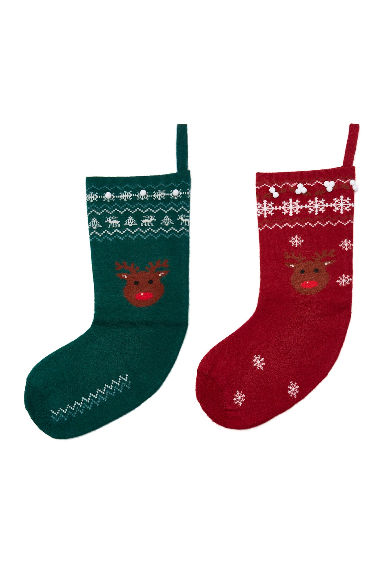 The Christmas stockings crafted from knit fabric. Each stocking features a cheerful reindeer face at the center, surrounded by classic holiday patterns. Available in green and red.
