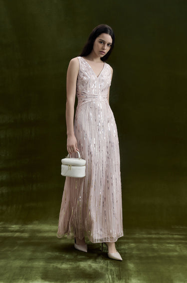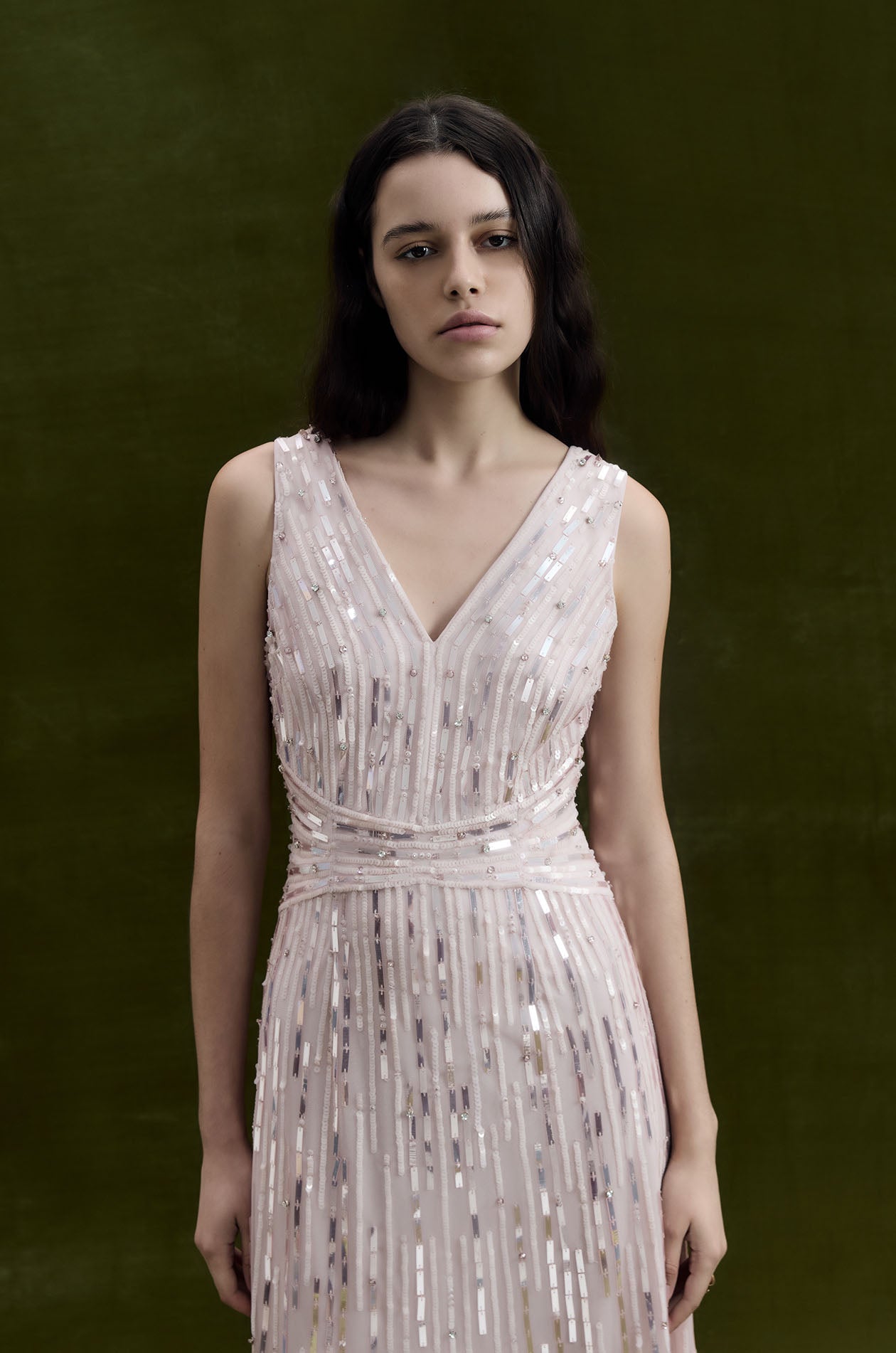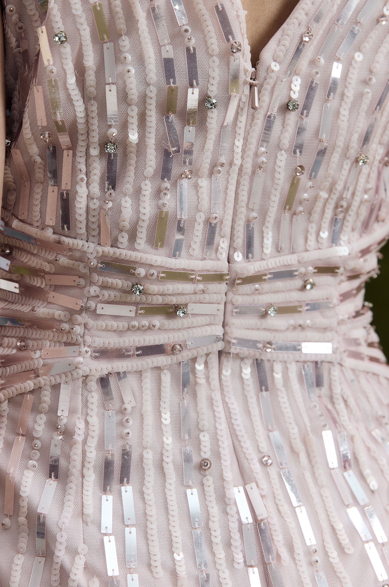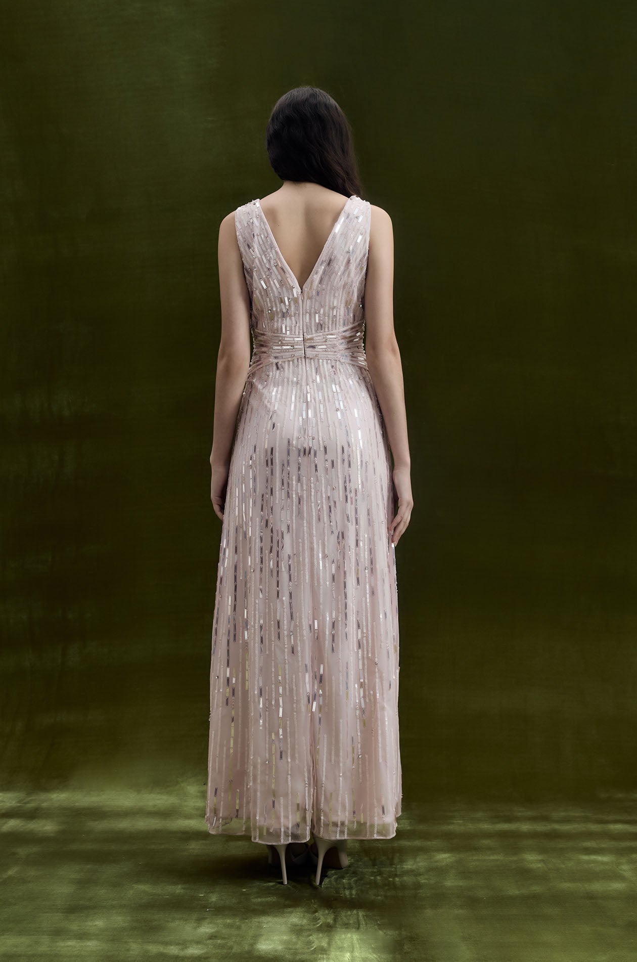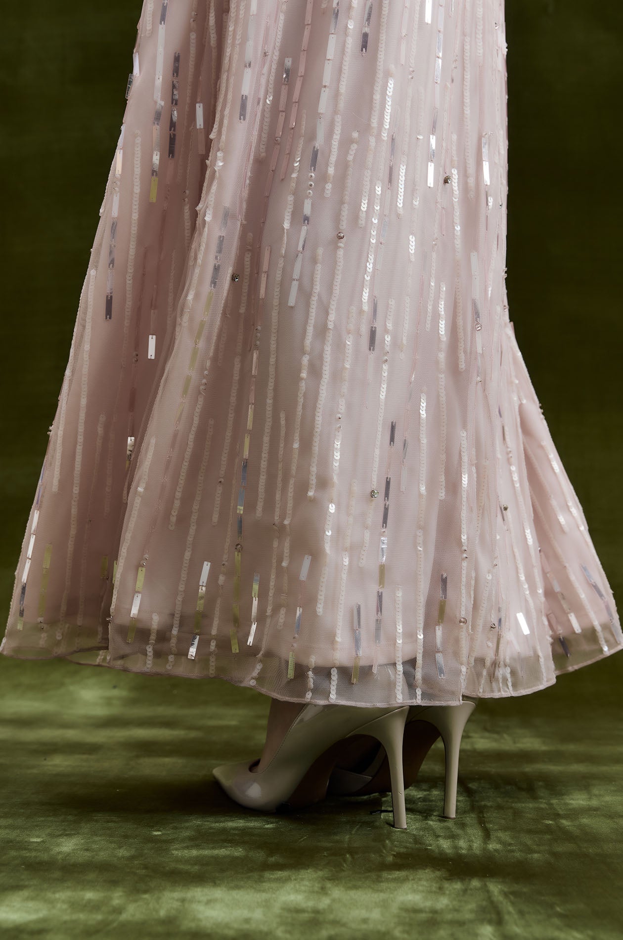 Sleeveless maxi dress in mesh with full lining. Handcrafted embellishment in traditional Indian style with shimmering sequins, beads, and rhinestones. Empire silhouette with plunging neckline. Back zip closure. Available in light pink.