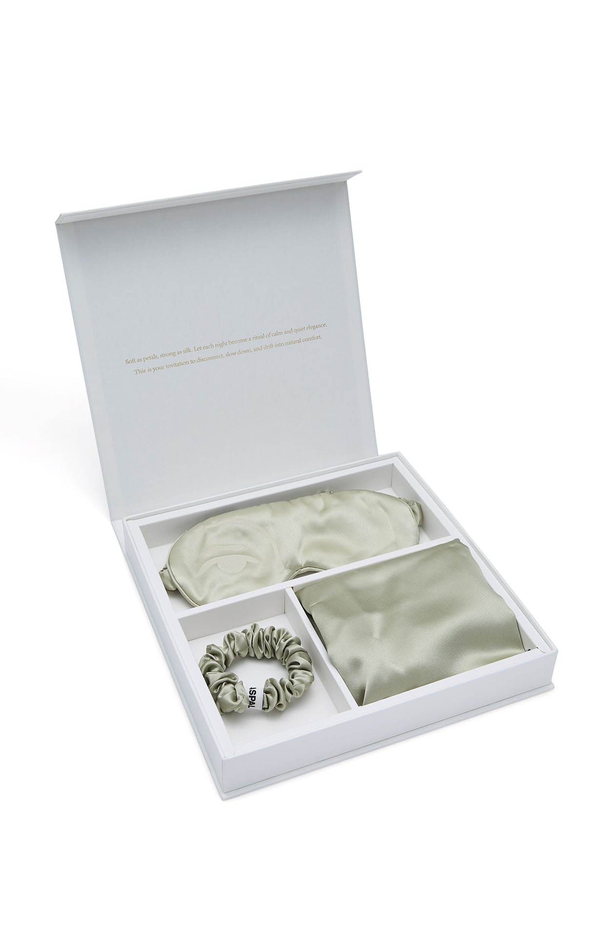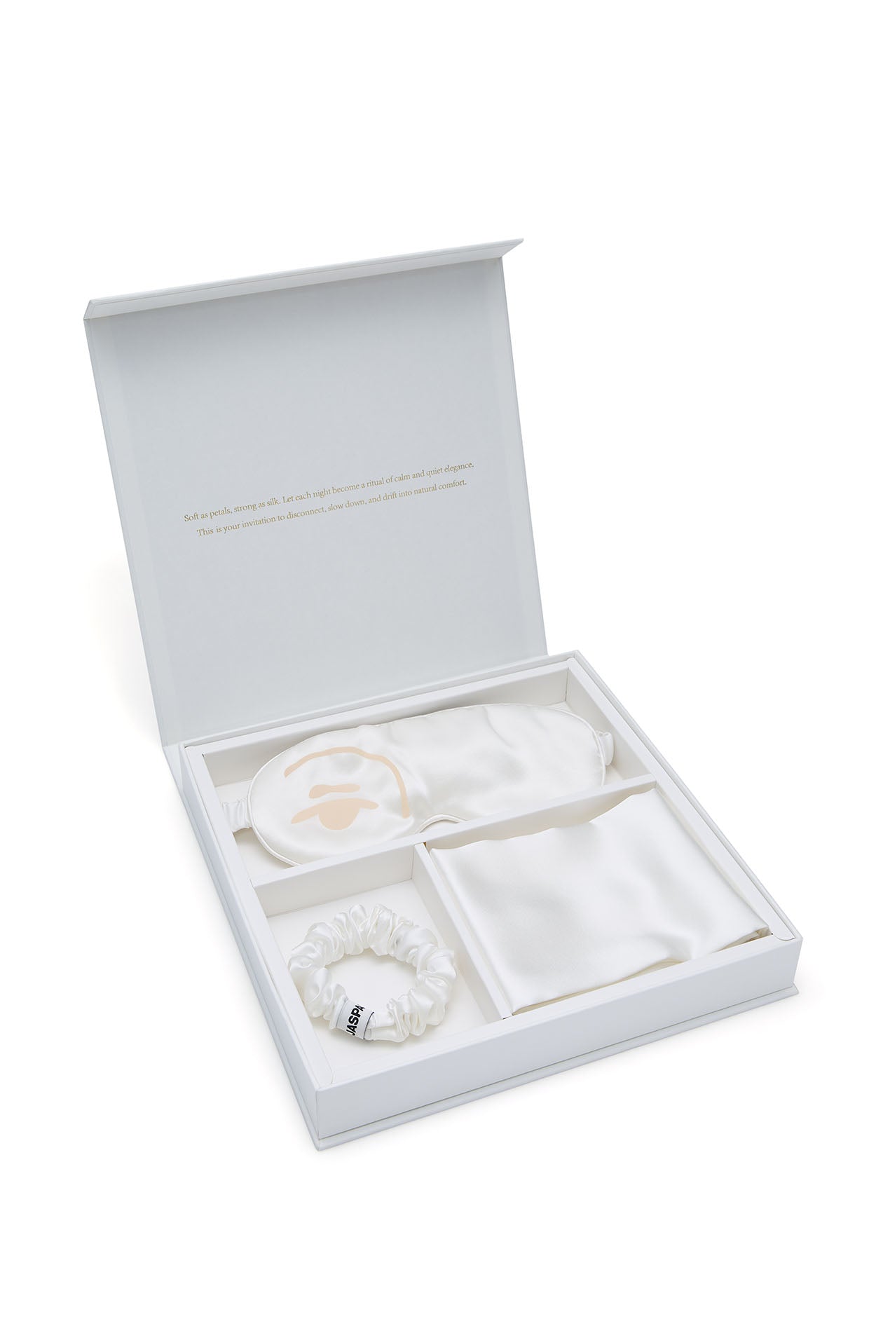Luxurious sleeping set crafted from smooth silk. Includes essential sleep accessories designed to elevate nightly routines with a refined, calming aesthetic. Available in off-white.
