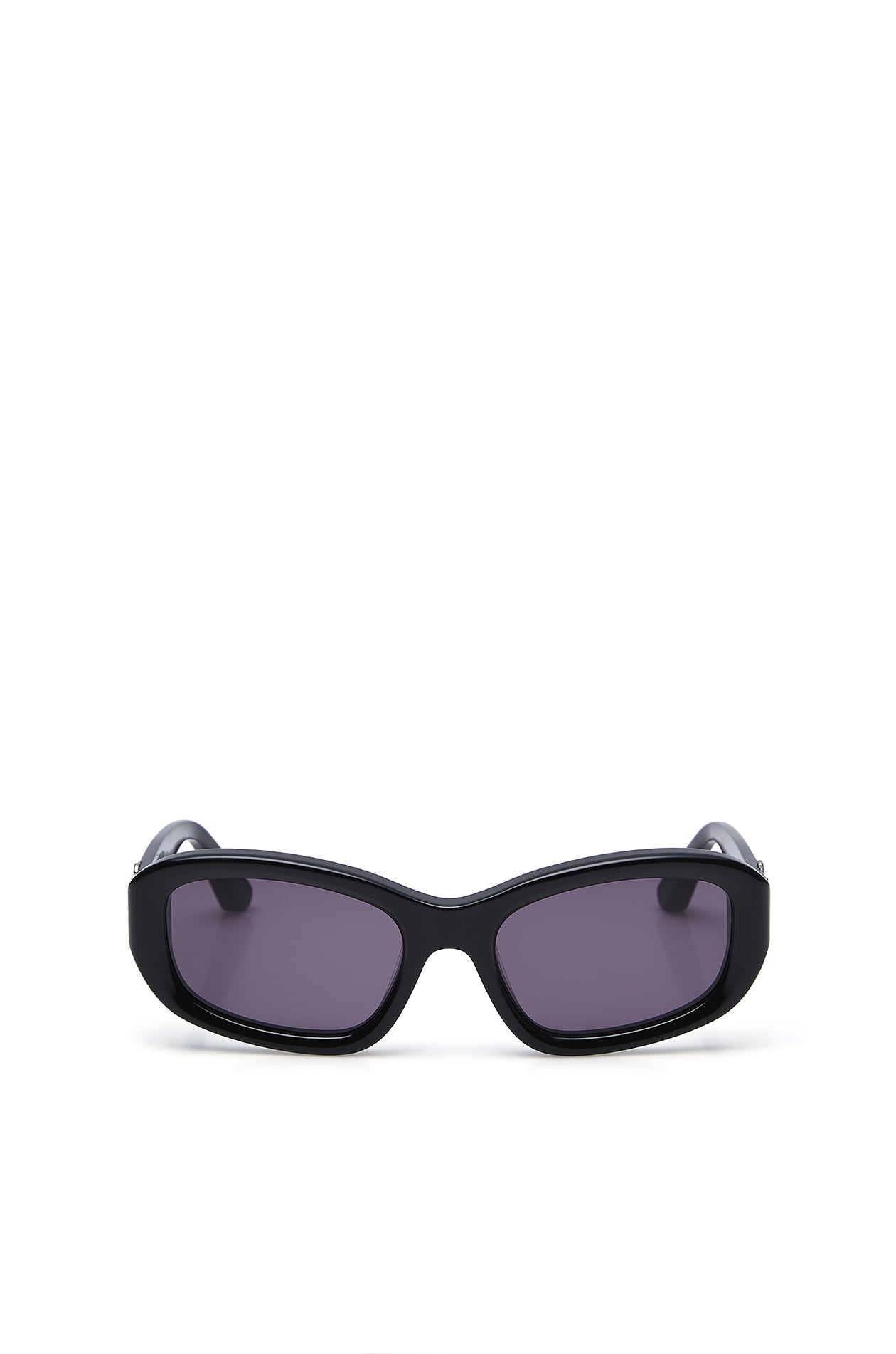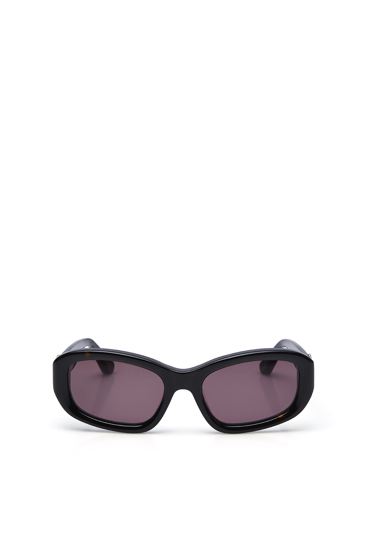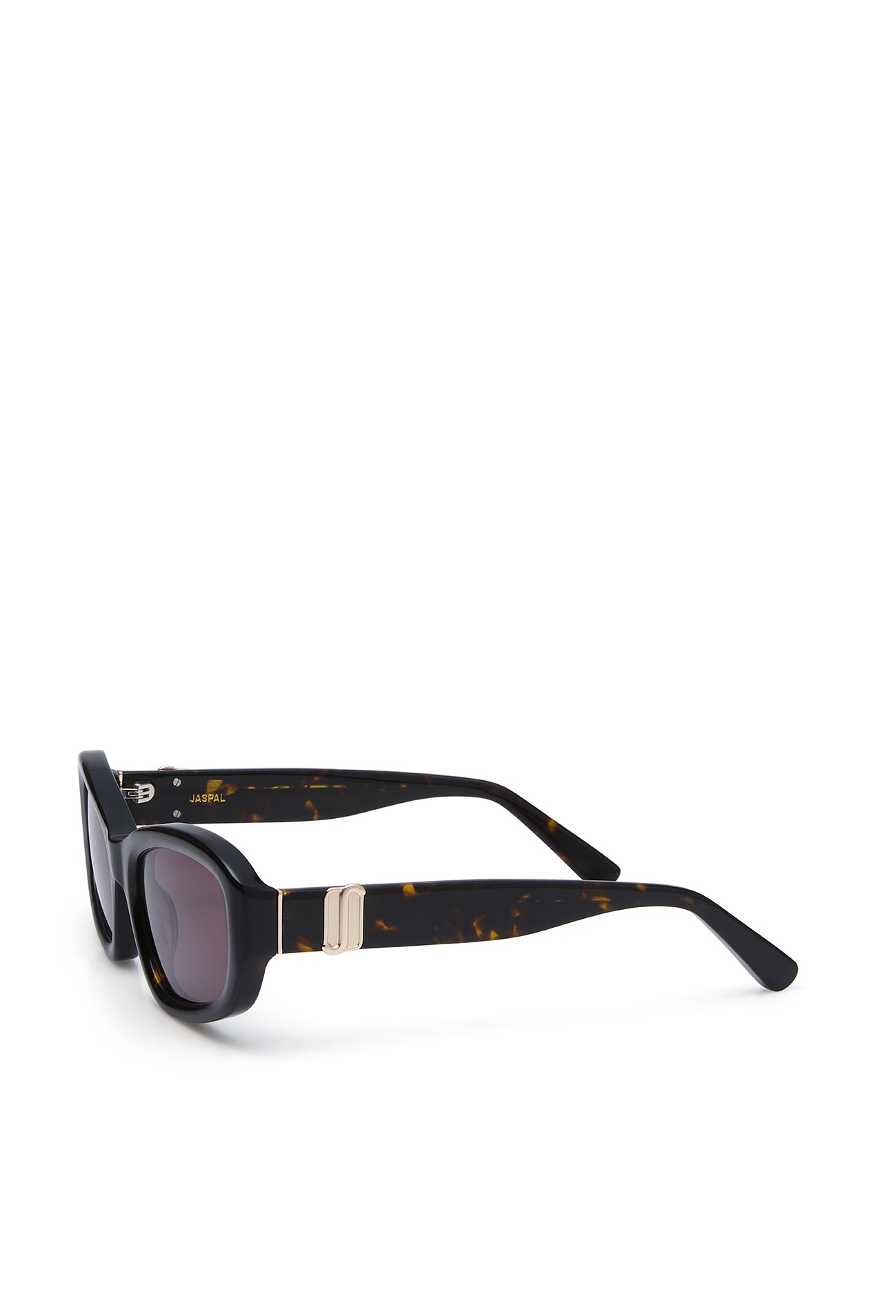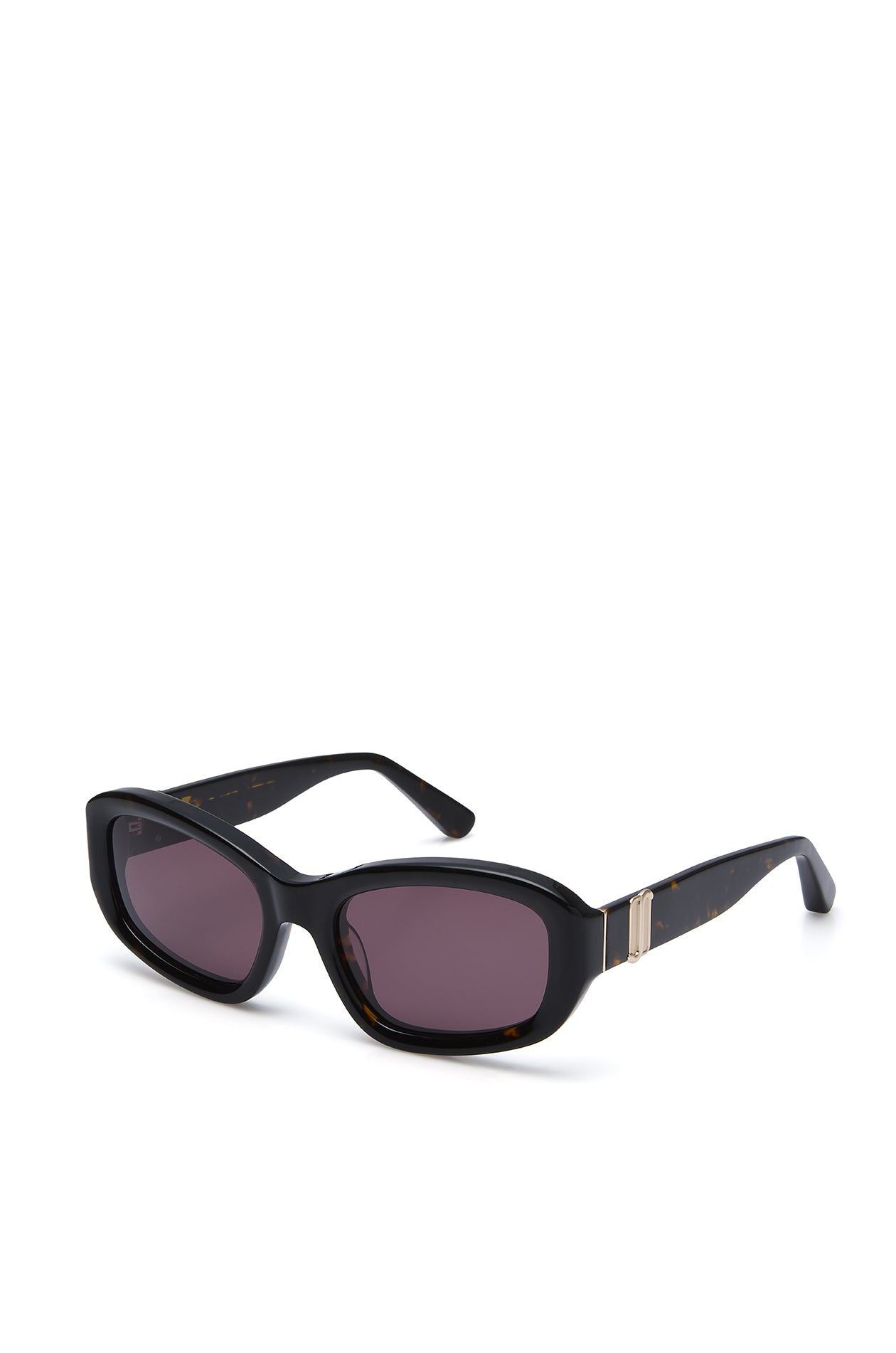 Slightly angled rectangular sunglasses in acetate frame with chunky temples. Available in black and dark brown.