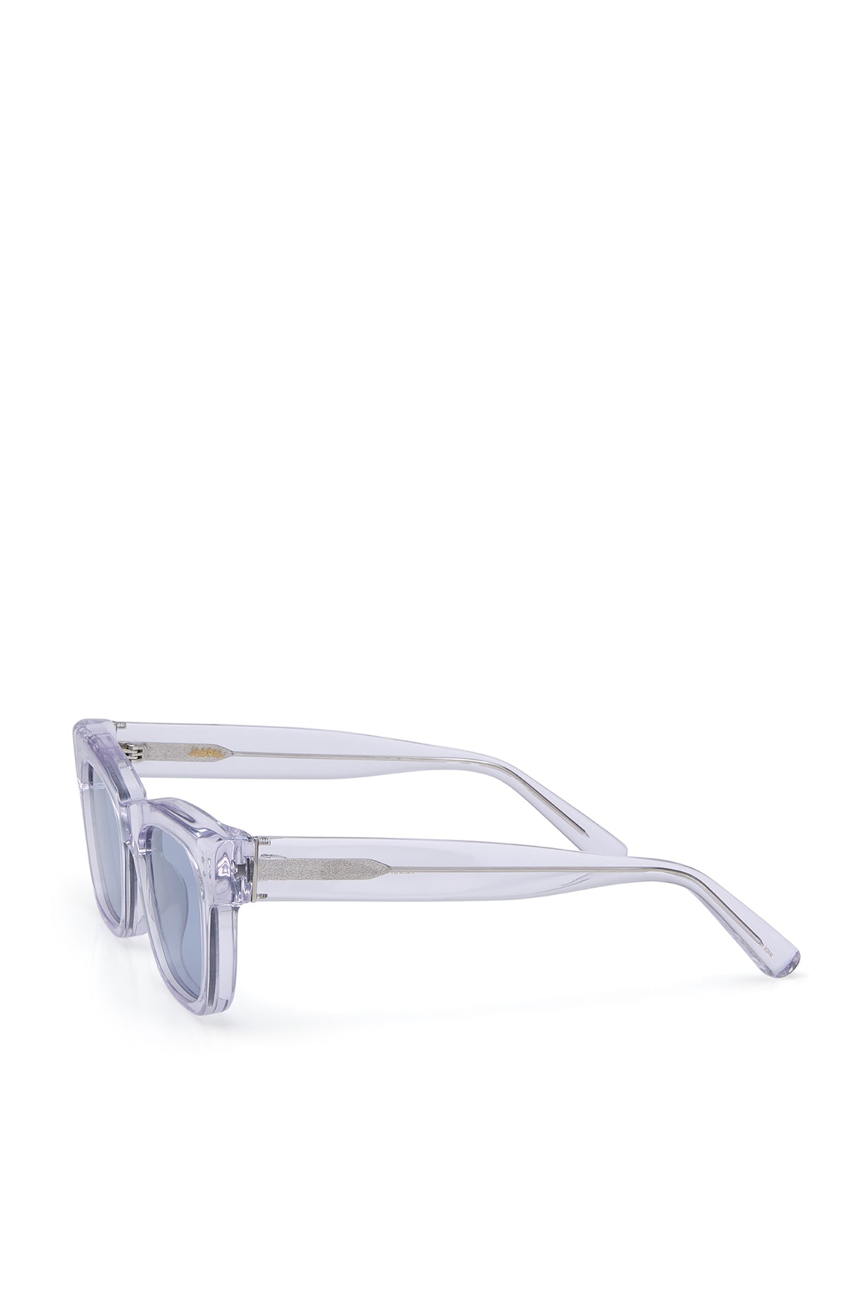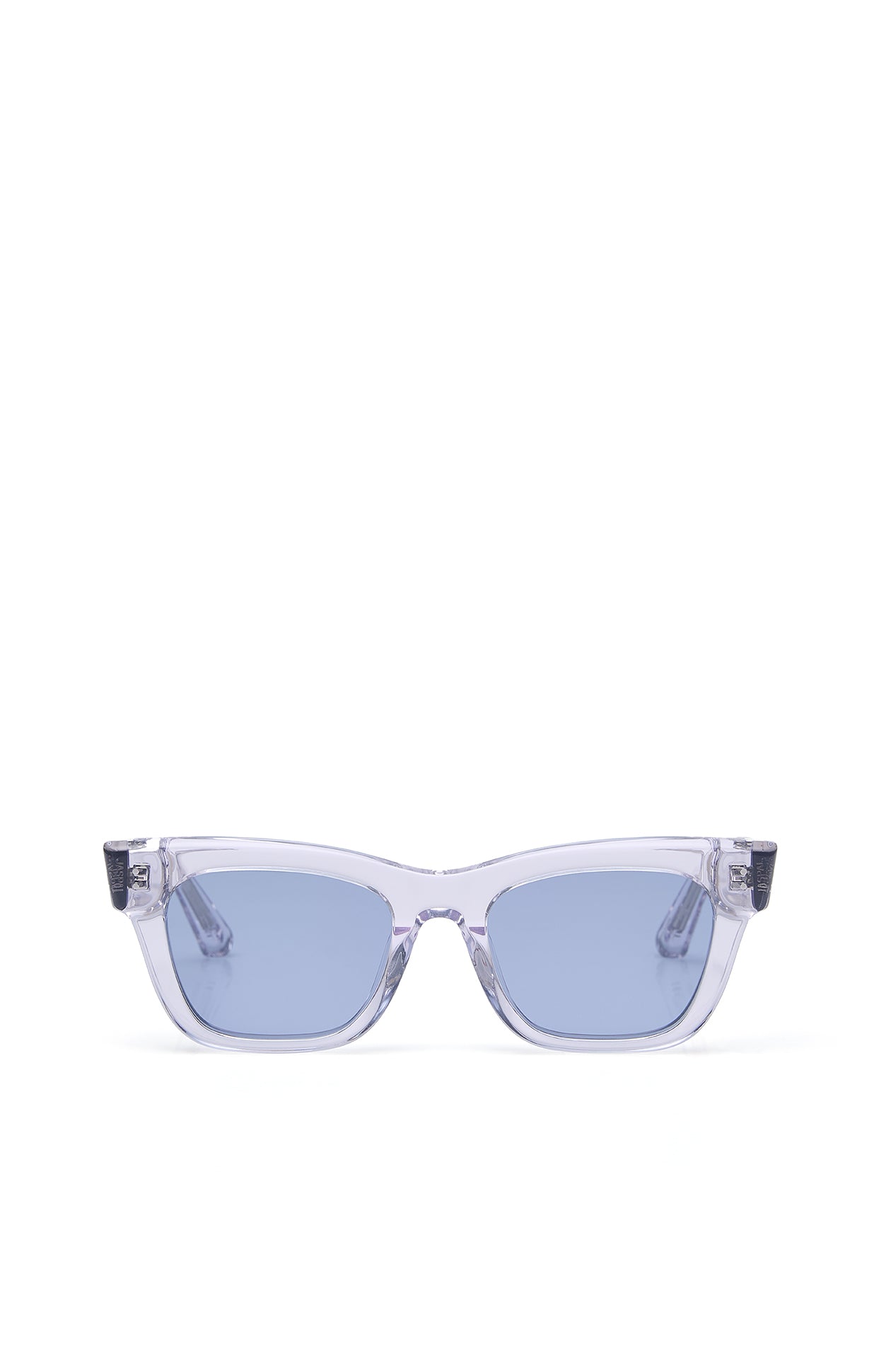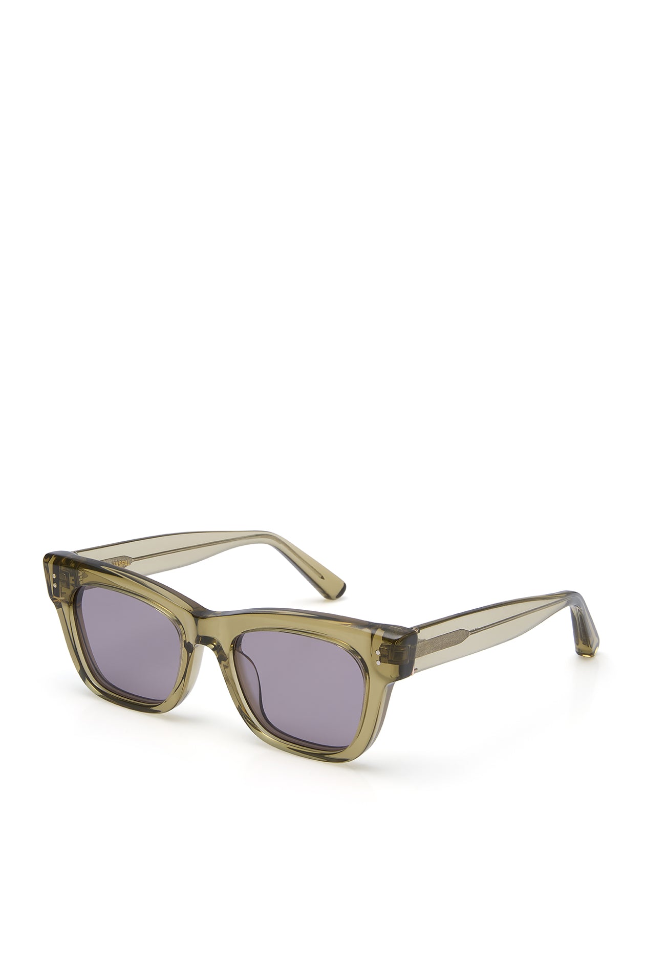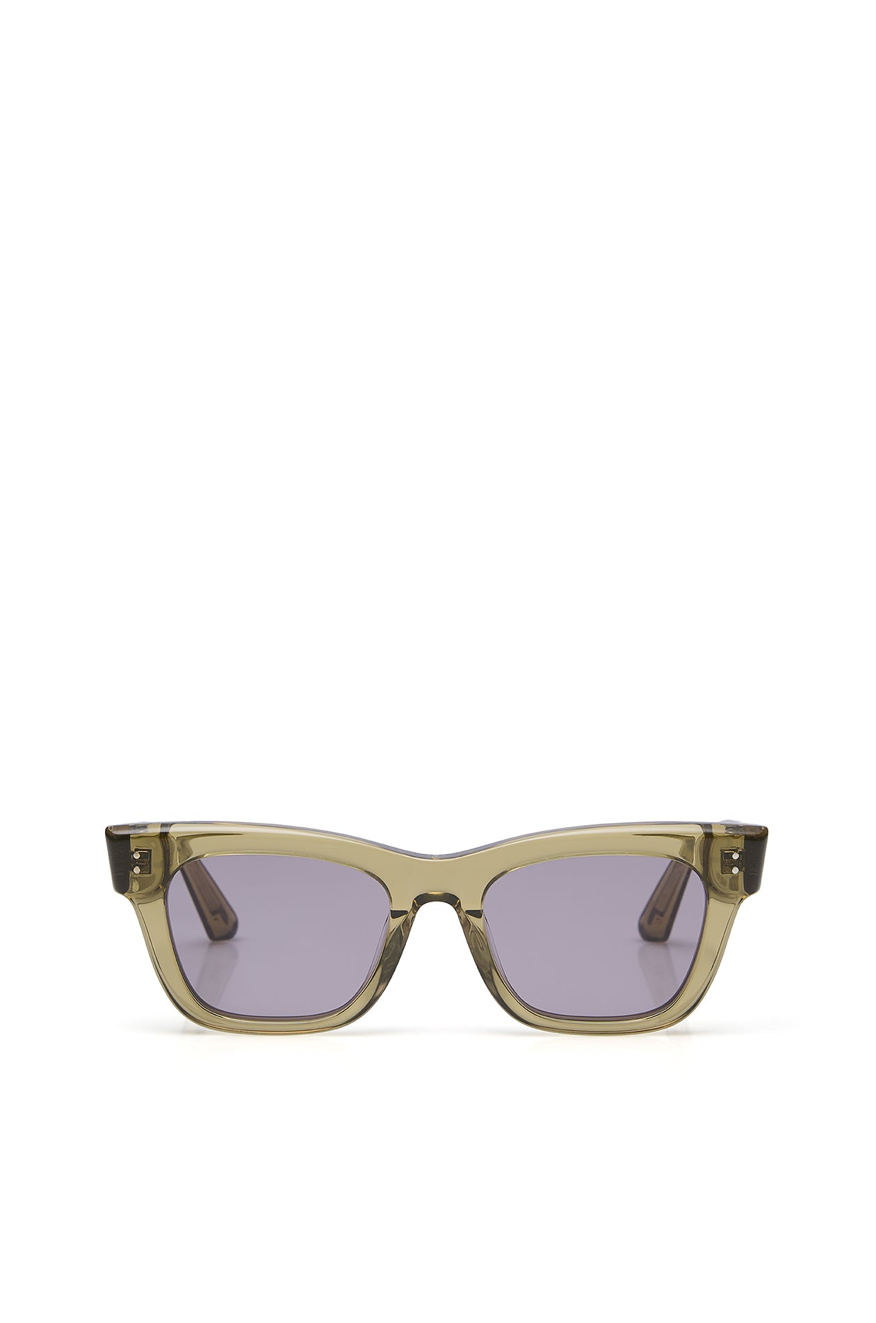 Square sunglasses in acetate frame with chunky temples. Available in black, khaki green, and clear.