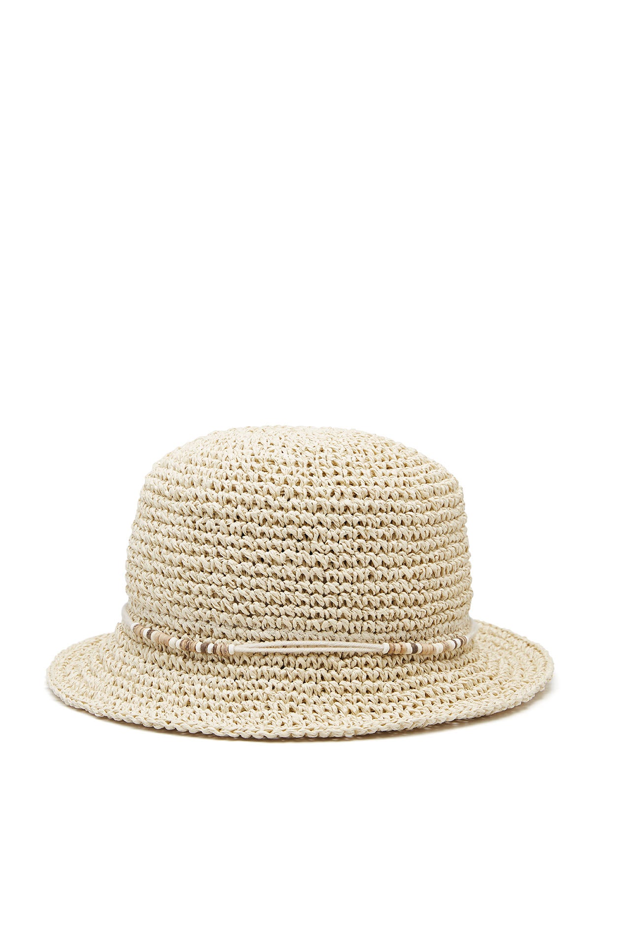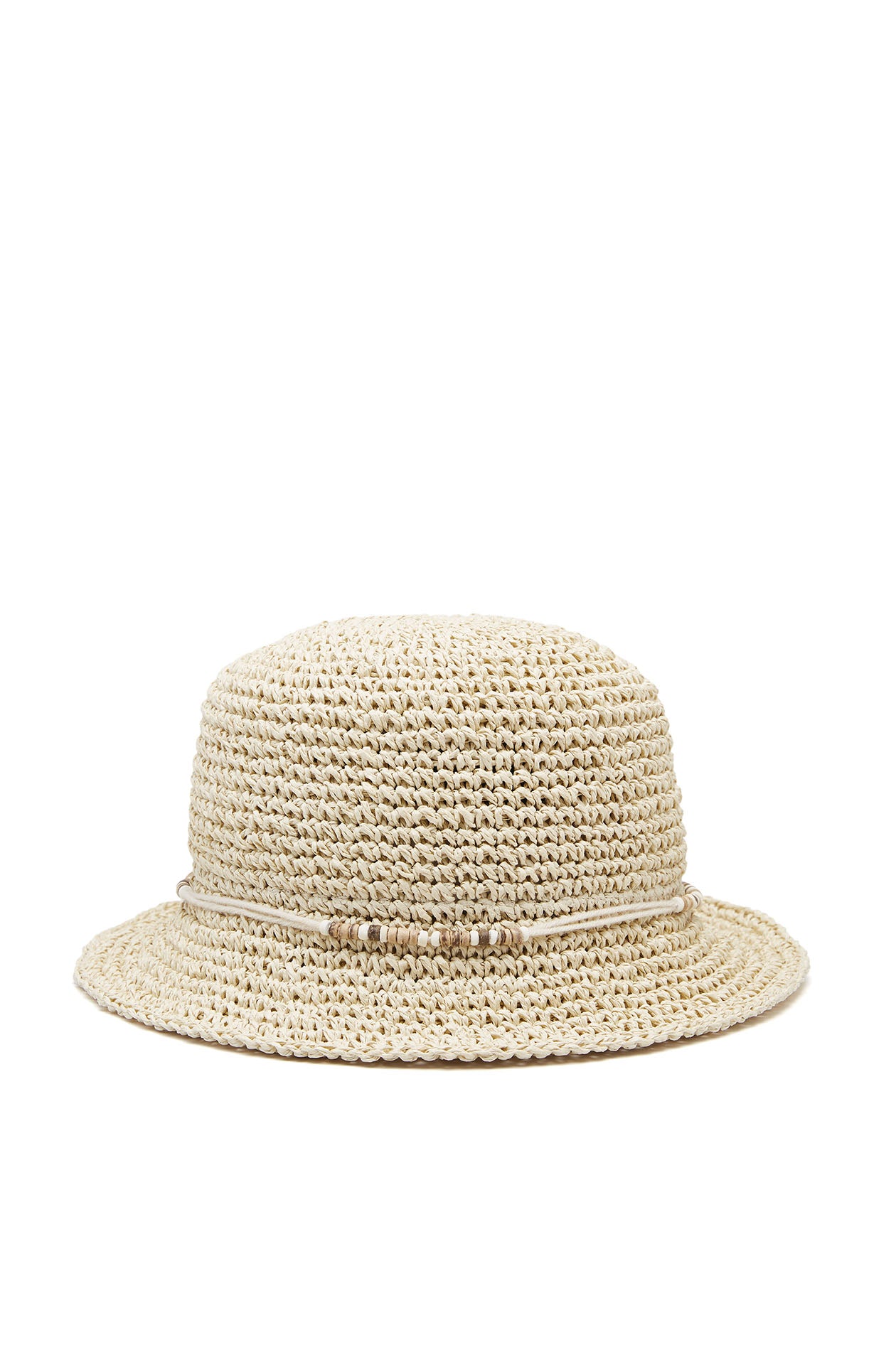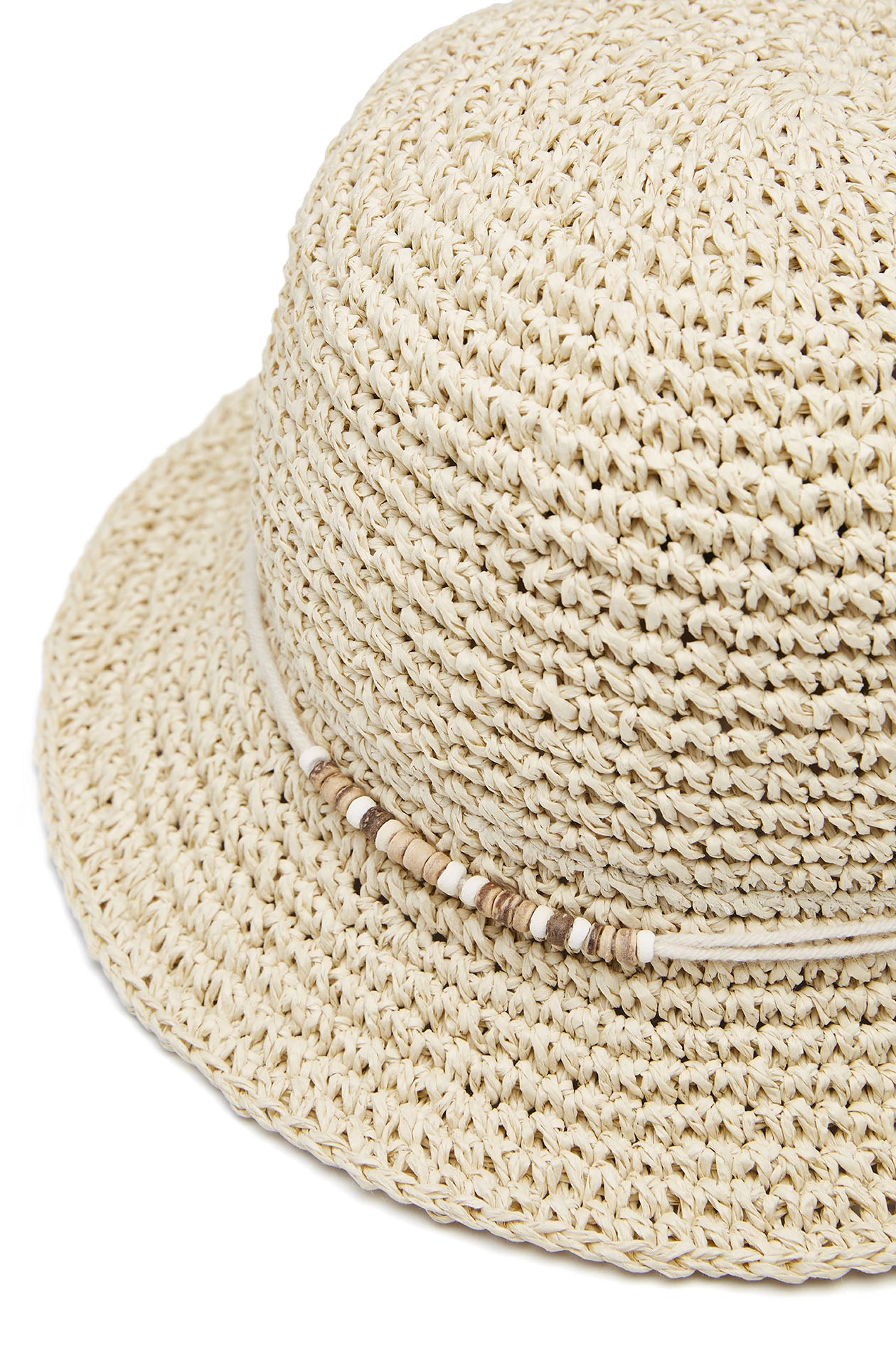 Bucket hat in paper raffia with bead and rope decoration. Available in beige.