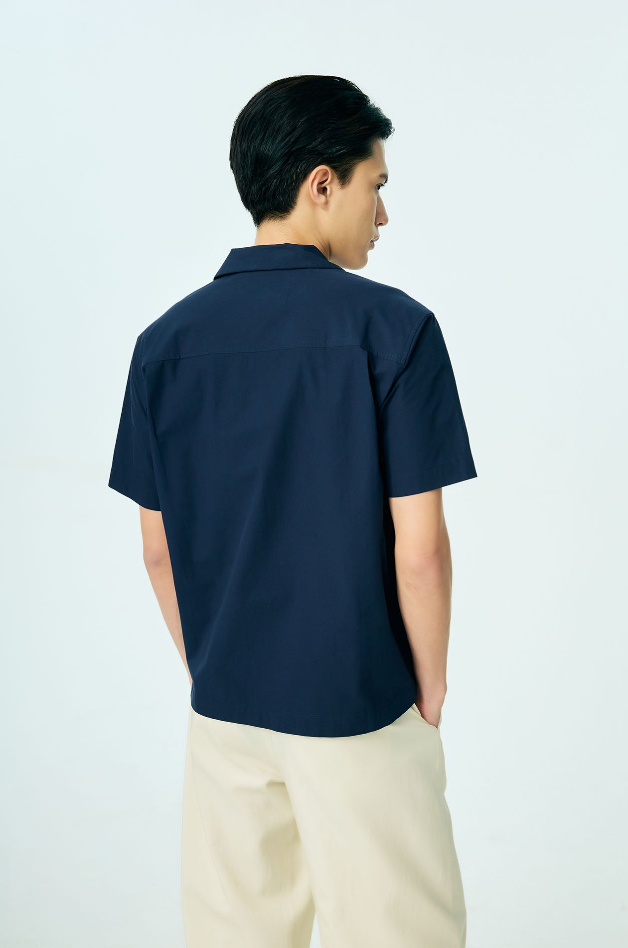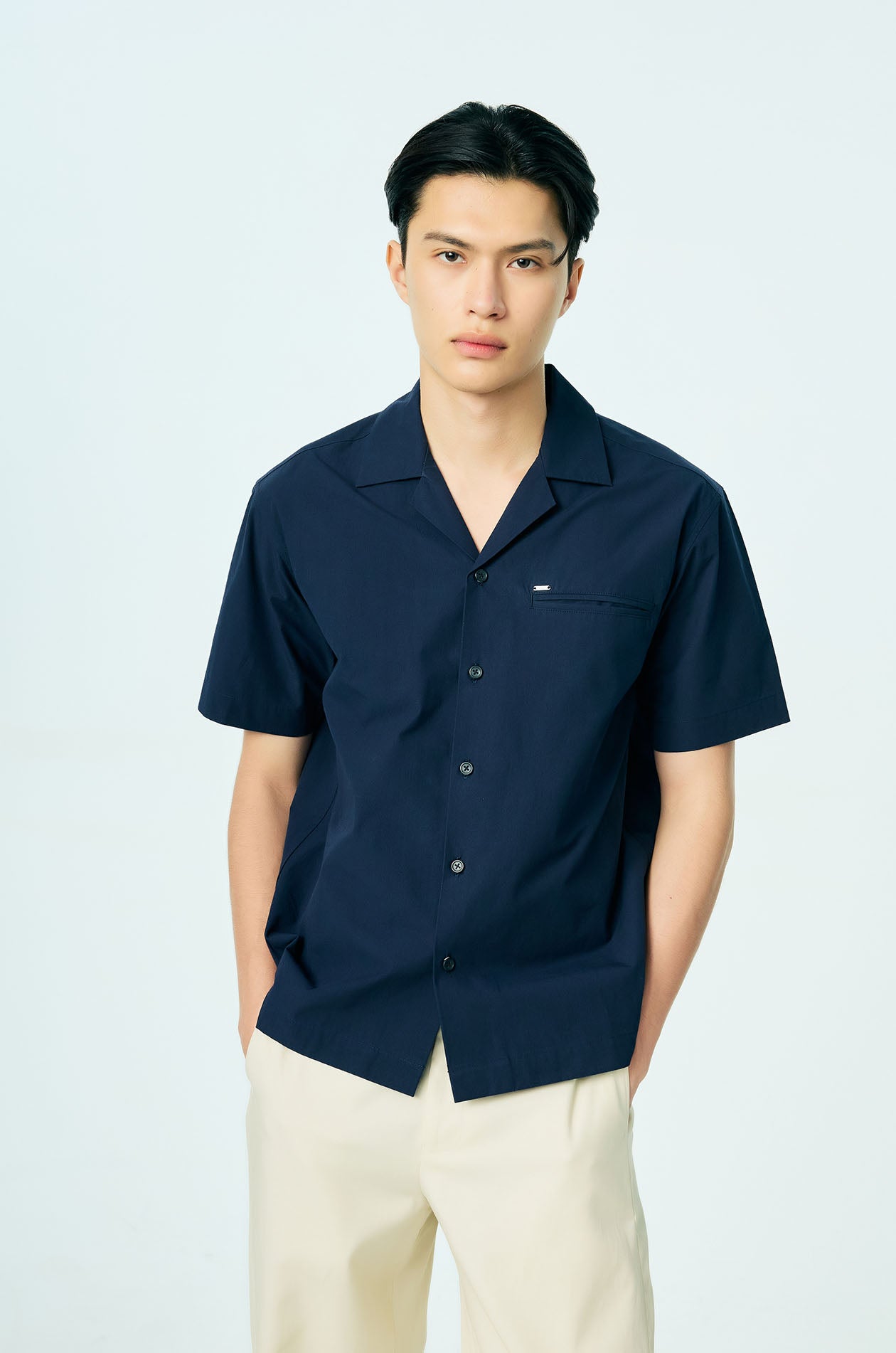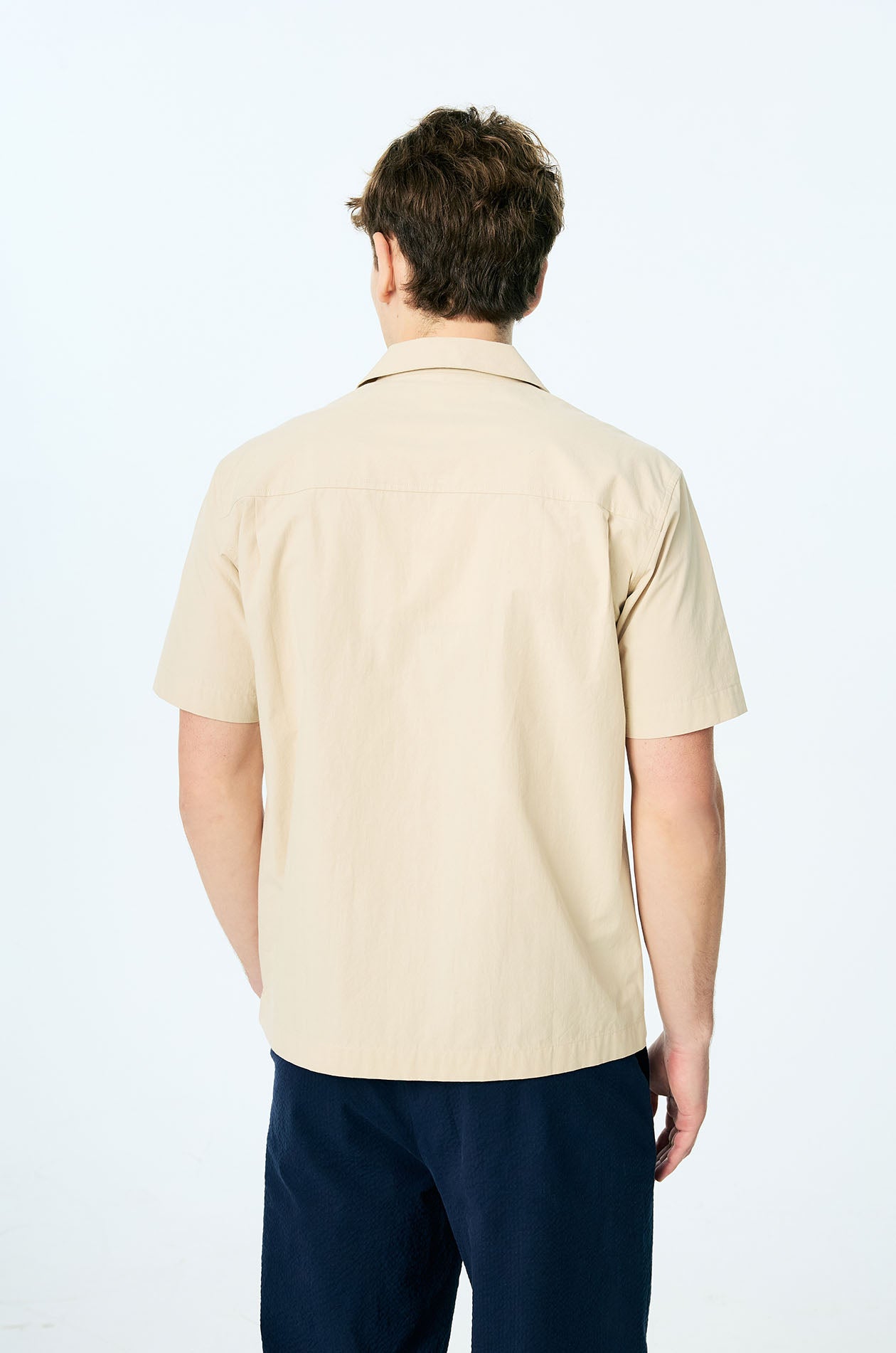 Short-sleeved resort shirt crafted from breathable cotton. Designed in a relaxed fit with a camp collar and finished with a clean chest pocket for an easy, everyday look. Front button closure. Available in beige and navy.