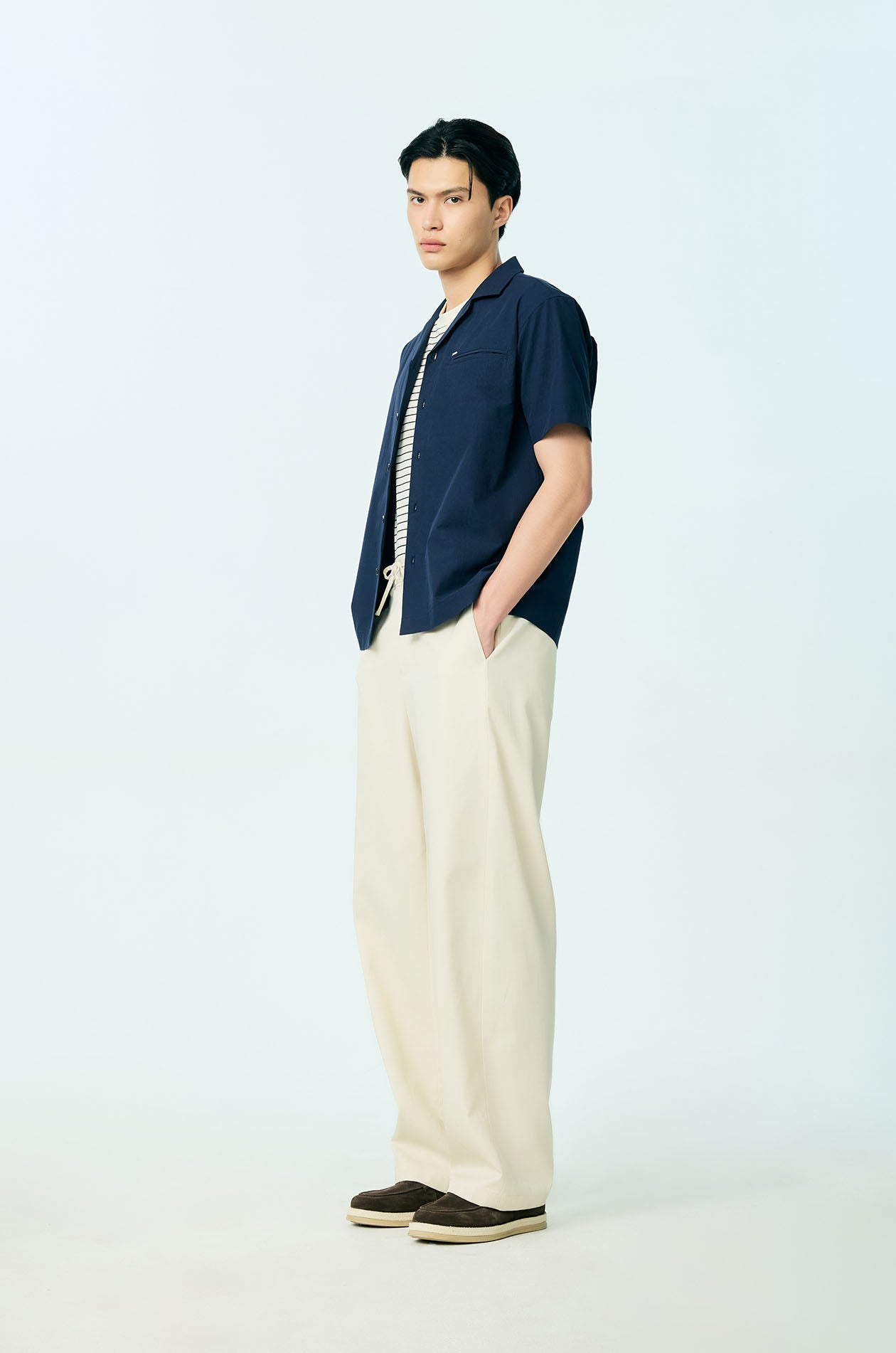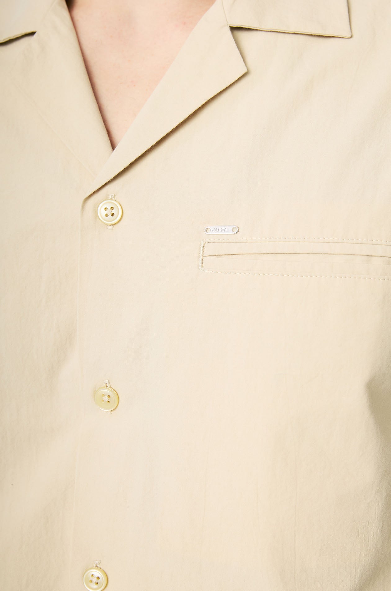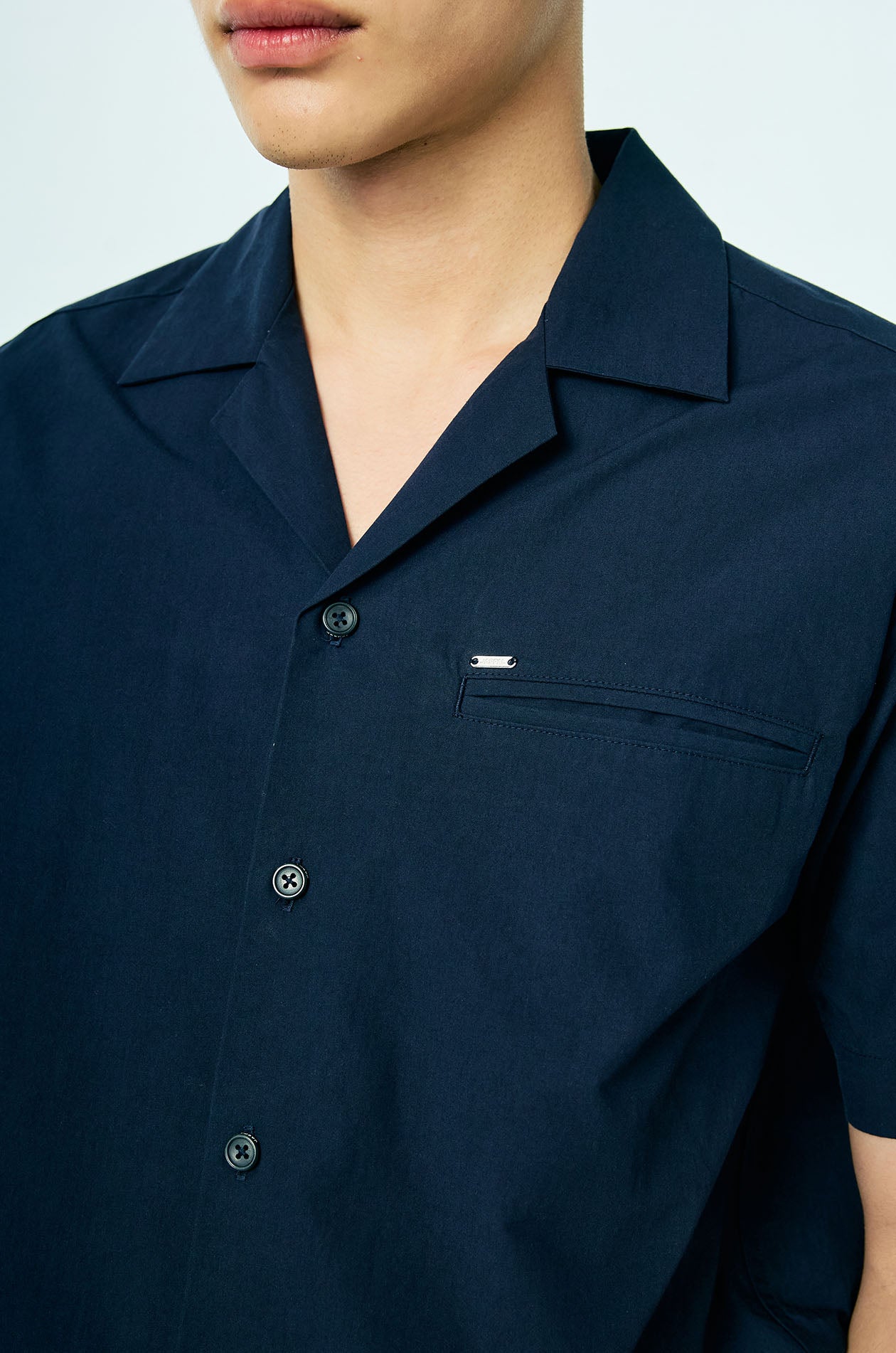 Short-sleeved resort shirt crafted from breathable cotton. Designed in a relaxed fit with a camp collar and finished with a clean chest pocket for an easy, everyday look. Front button closure. Available in beige and navy.