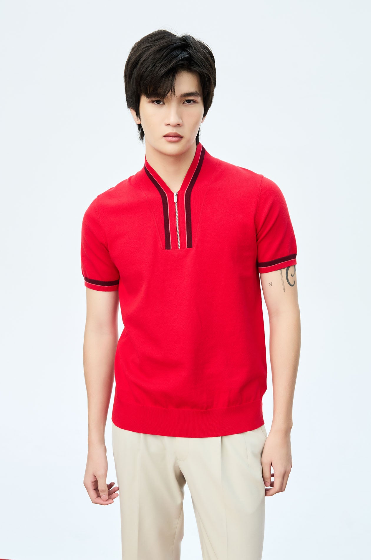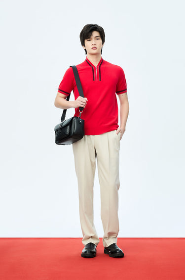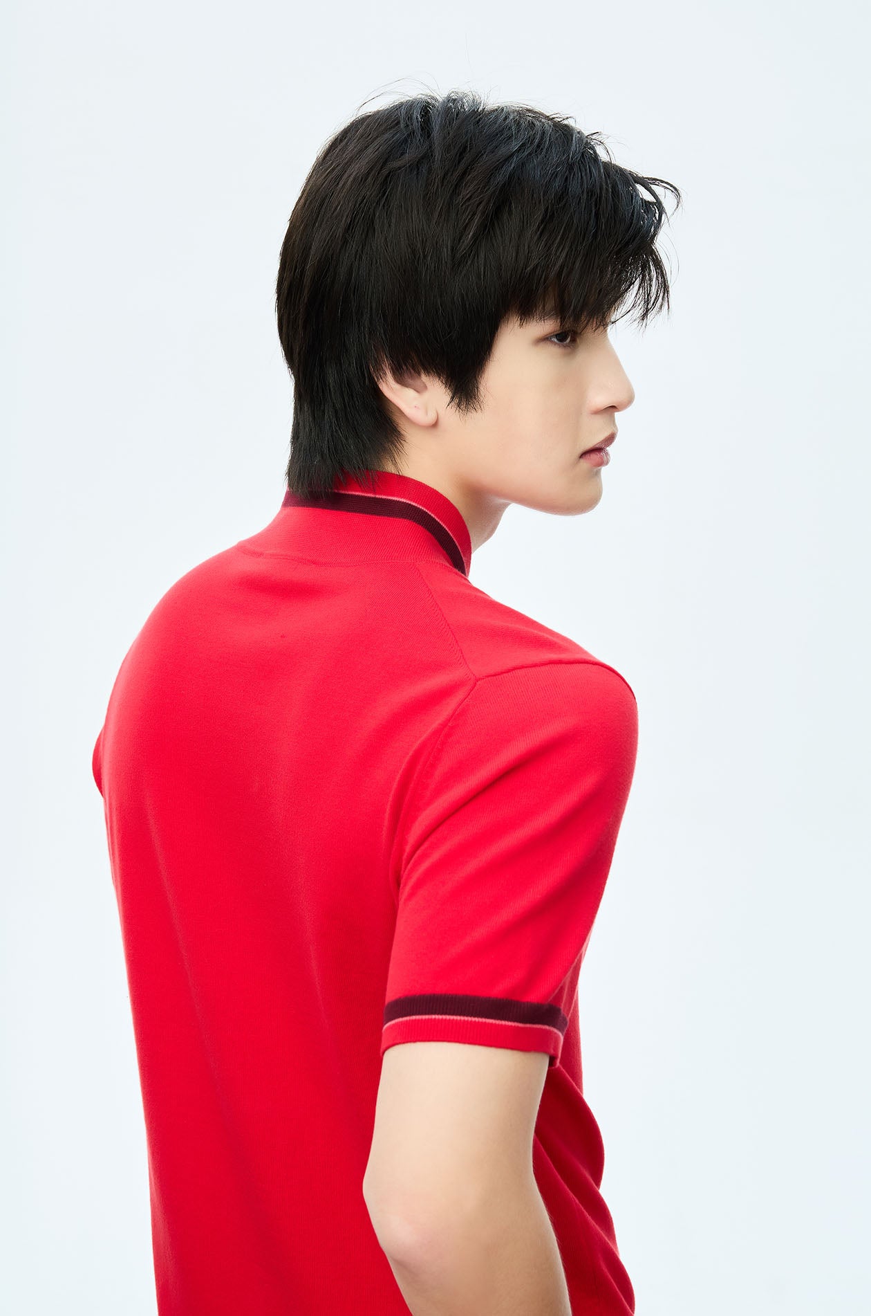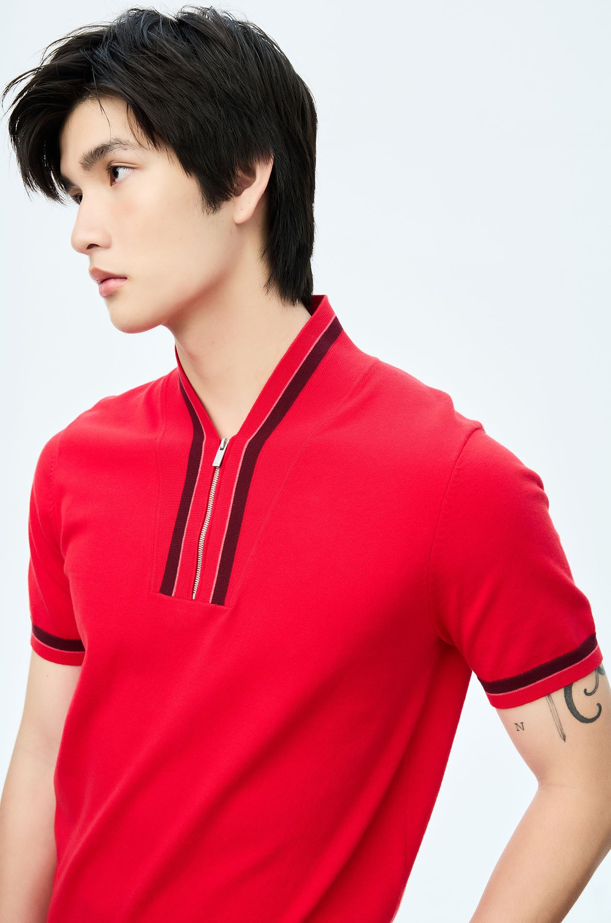 Jaspal x nussdaydream for Luna New Year | Short-sleeved polo shirt in knit fabric. Regular fit with strand-up collar and striped inlay detailing. Front zip closure. Available in Chinese Red.