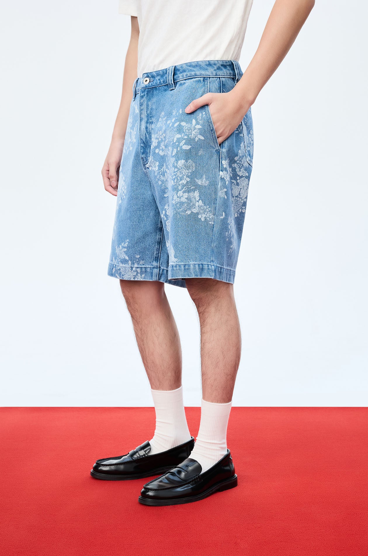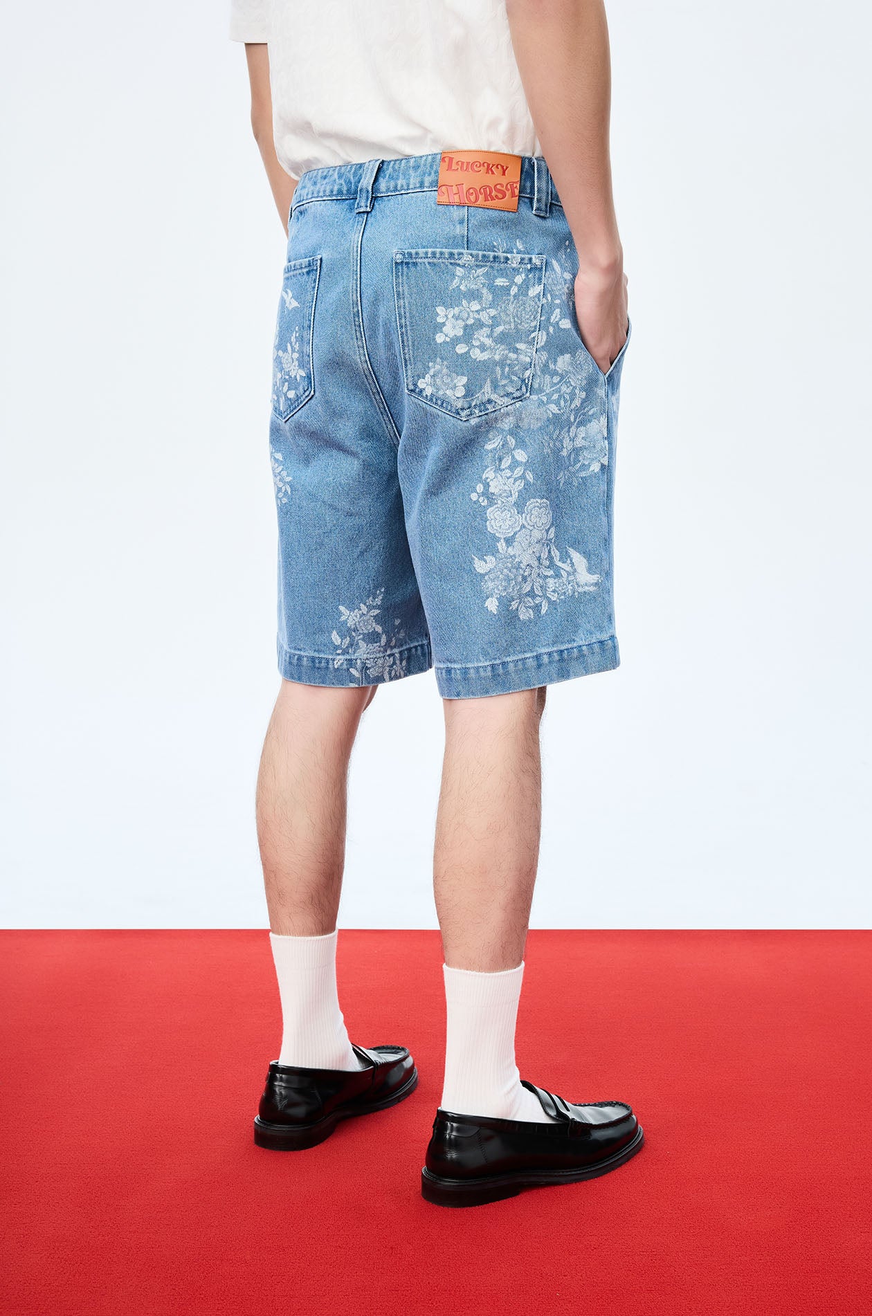 Jaspal x nussdaydream for Luna New Year | Mid-rise shorts in denim. Floral & Horse motif print. Knee length with side and back pockets. Front button and zip closure. Available in blue.