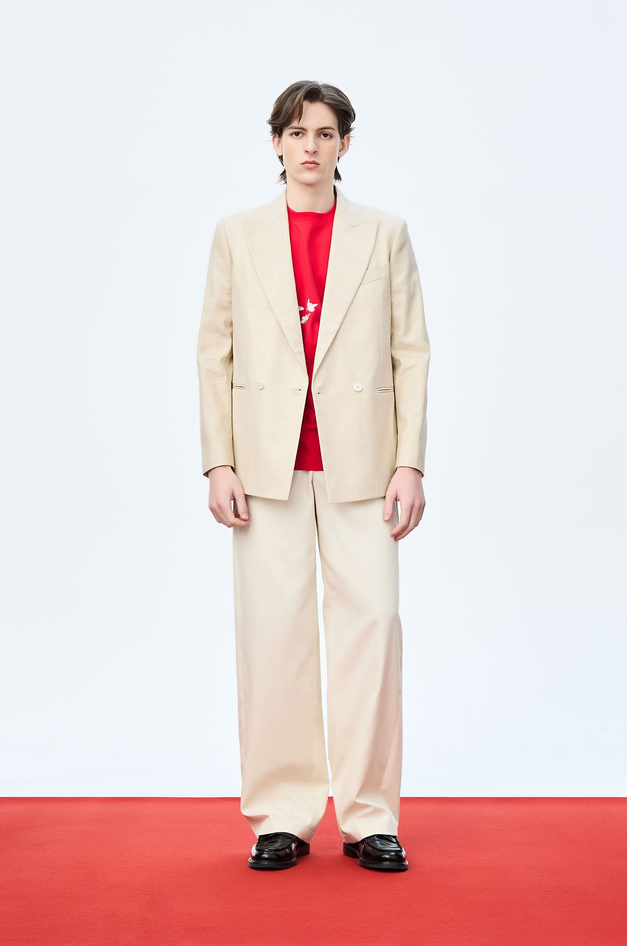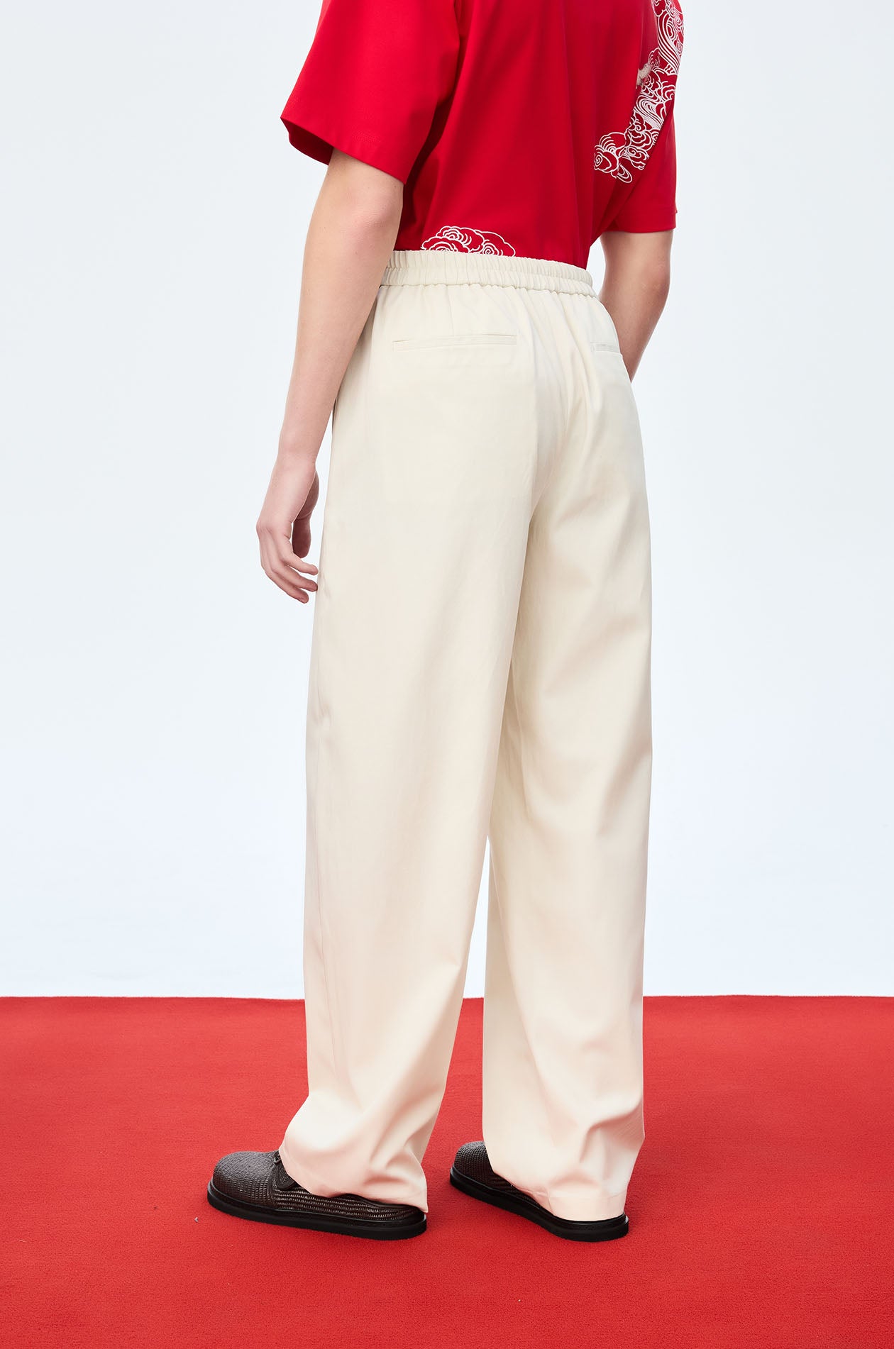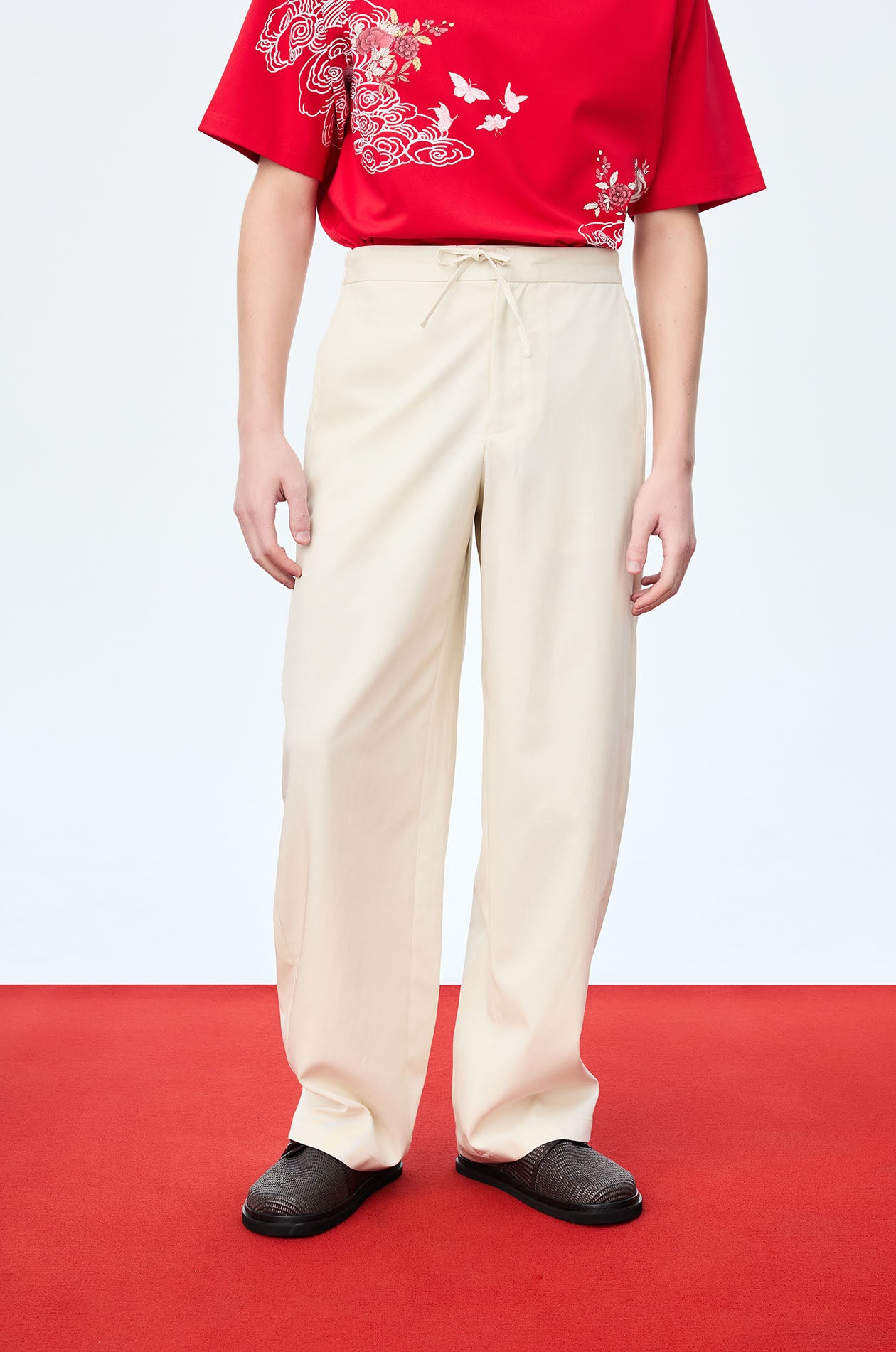 Jaspal x nussdaydream for Luna New Year | Mid-rise easy pants in comb twill. Loose-straight legs with side pockets. Drawstring and elastic back waistband. Front button and zip closure. Available in beige.