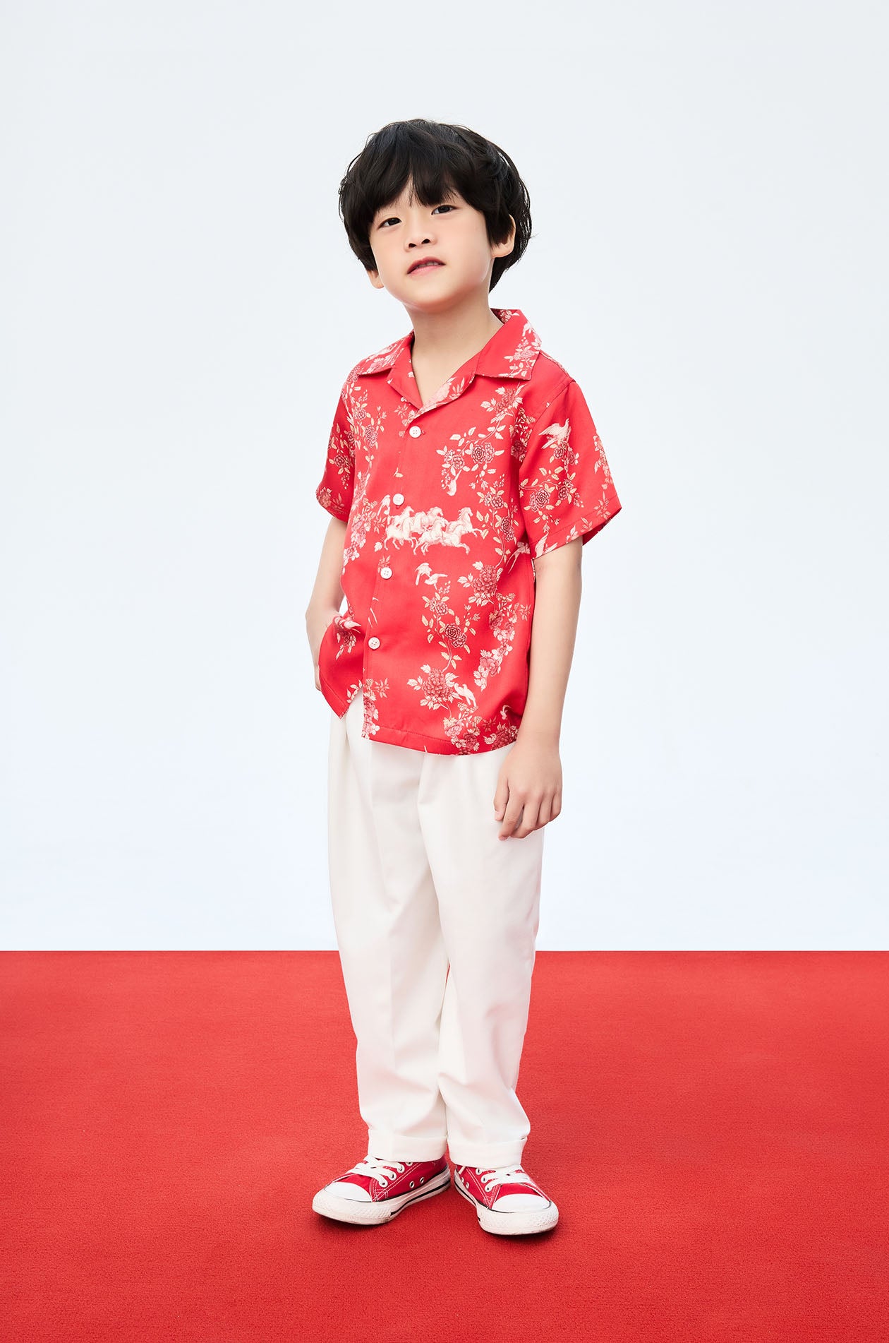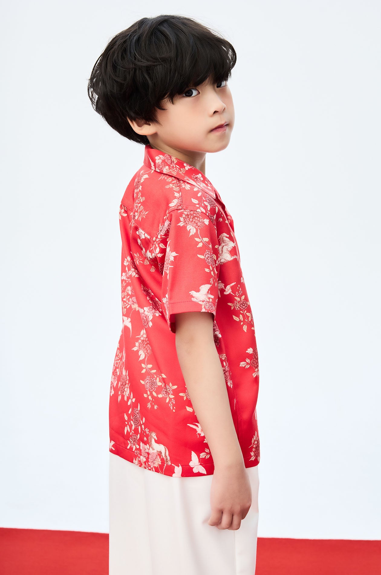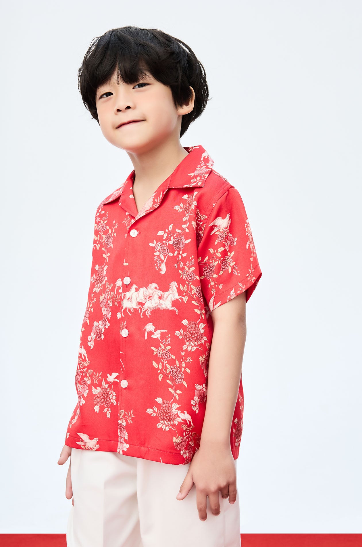 Jaspal X nussdaydream for Luna New Year | Short-sleeved shirt in satin. Regular fit with auspicious motif print. Camp collar. Front button closure. Available in Chinese Red.