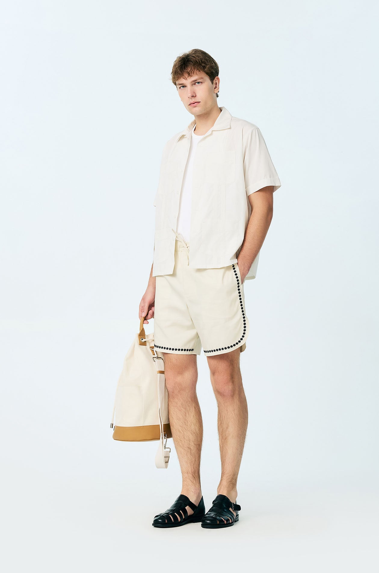 This short-sleeved resort shirt is crafted from a lightweight fabric that offers an airy, comfortable feel for warm-weather wear. Cut in a relaxed fit, it features a classic camp collar and a front button closure for an effortless, laid-back silhouette. Refined pintuck detailing runs through the bodice, adding subtle structure and visual interest, while front and chest pockets complete the design with a functional yet polished finish. A versatile piece that balances relaxed elegance with thoughtful craftsmanship. Available in beige.