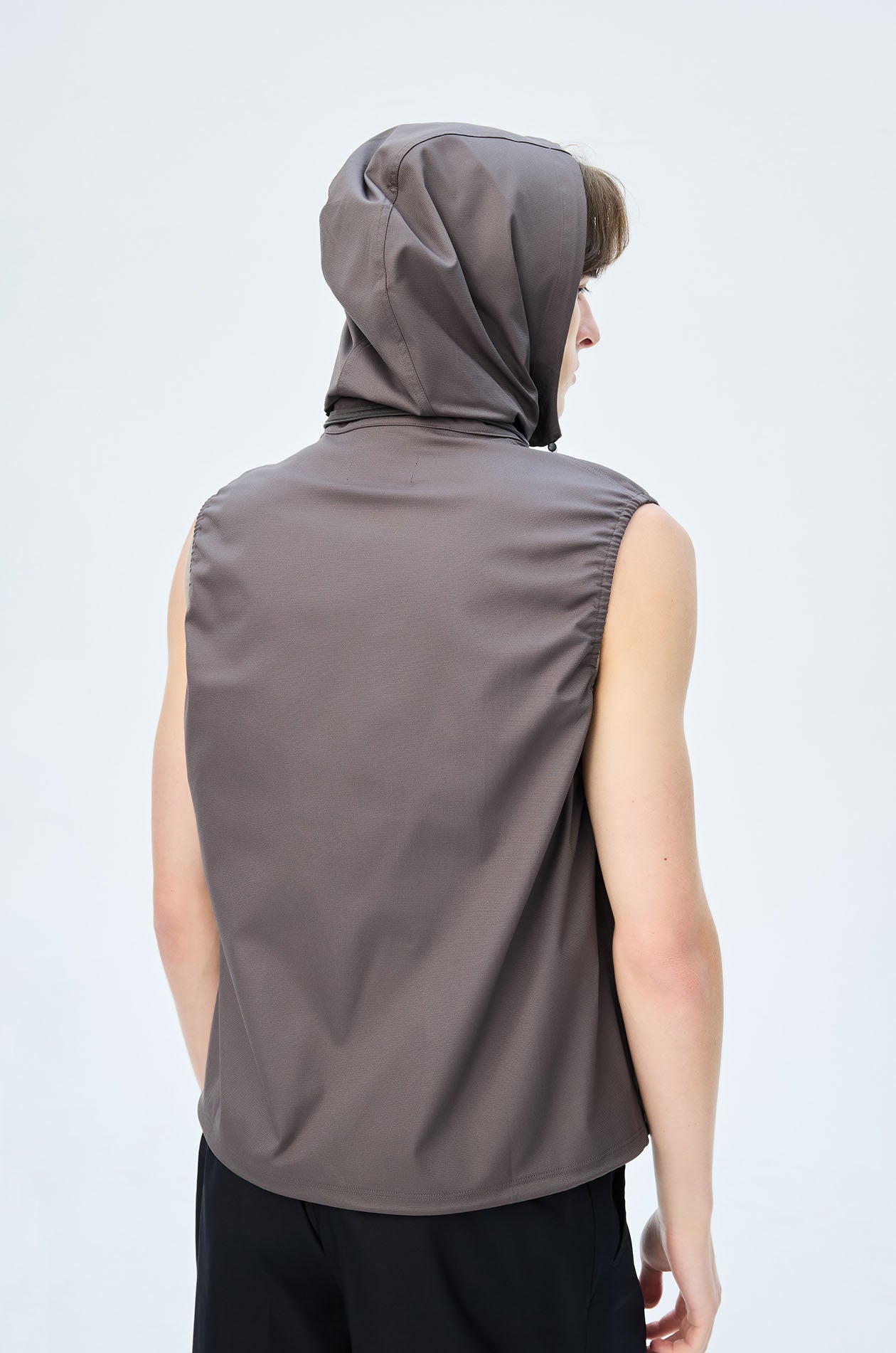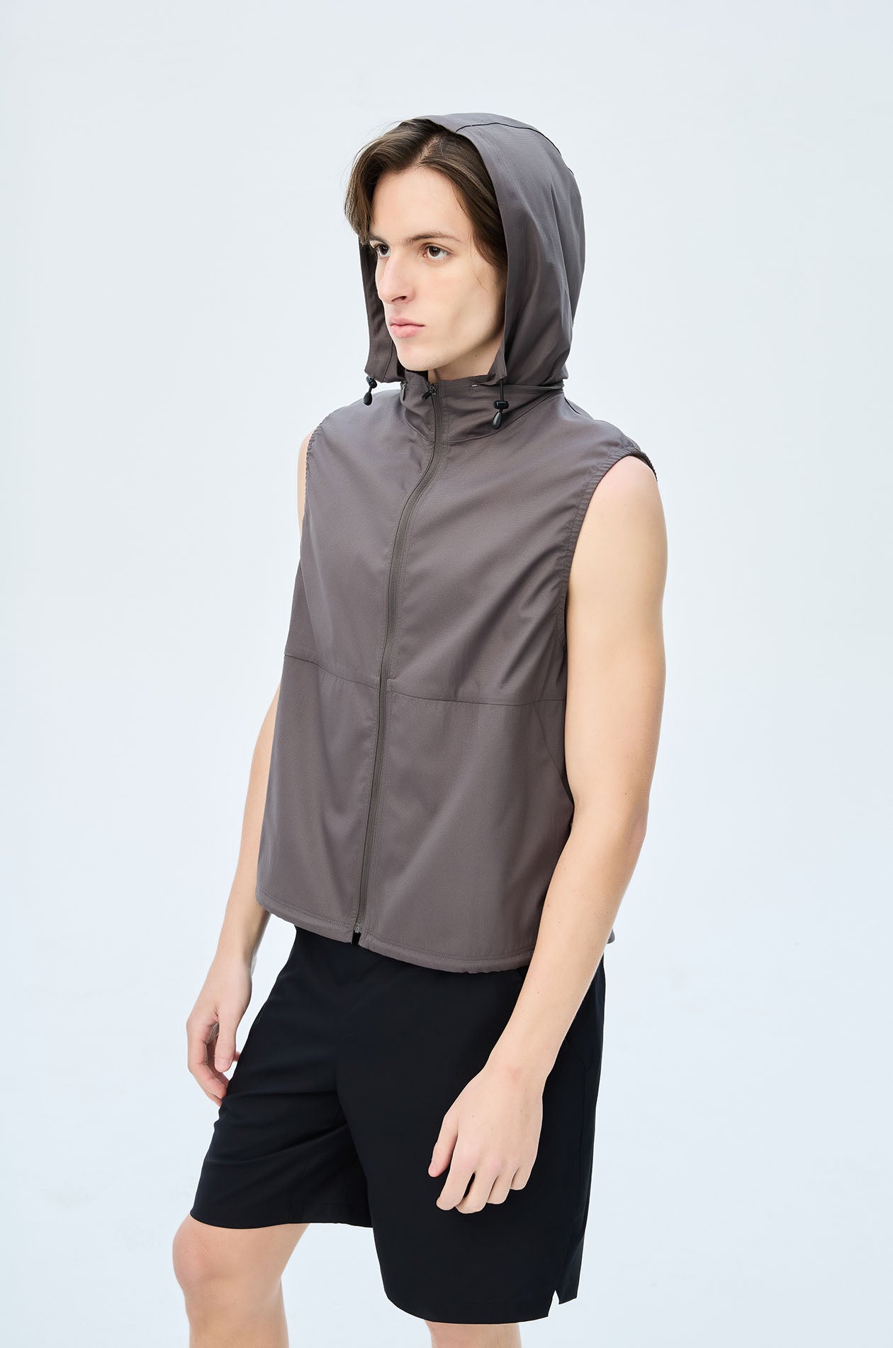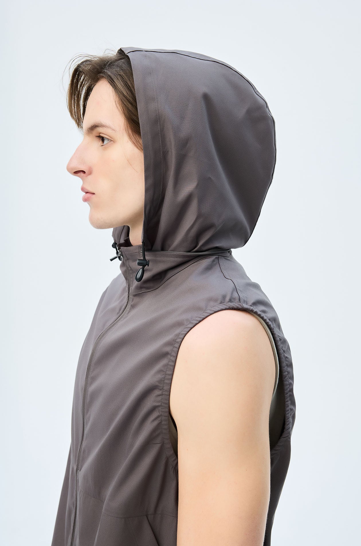 Sports vest jacket in lightweight fabric. Regular fit with funnel neck, hidden hood, side pockets, and drawstring hem. Front zip closure. Available in grey.