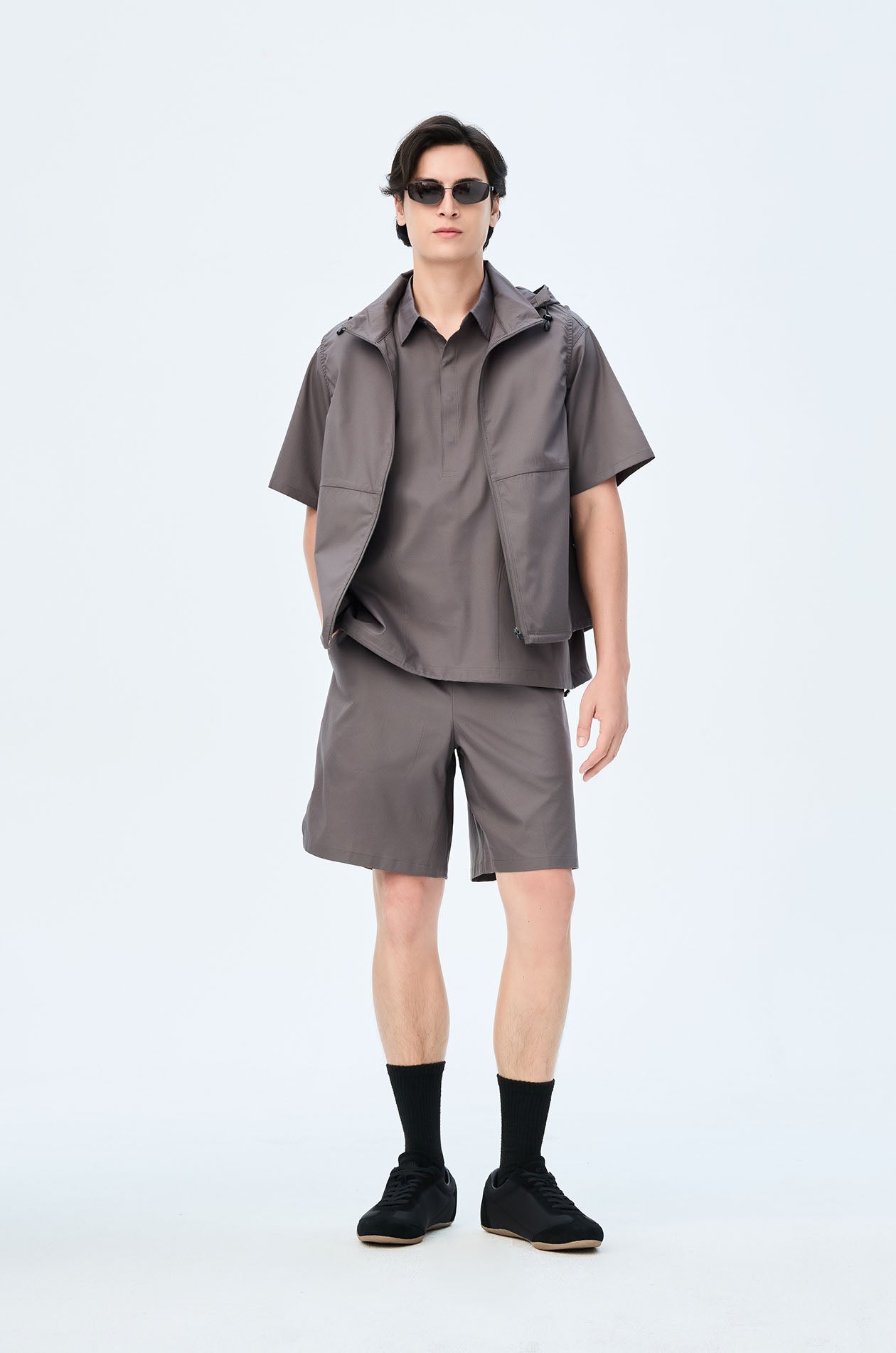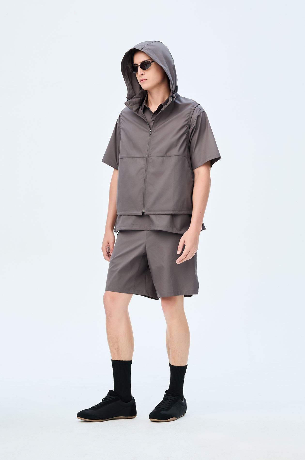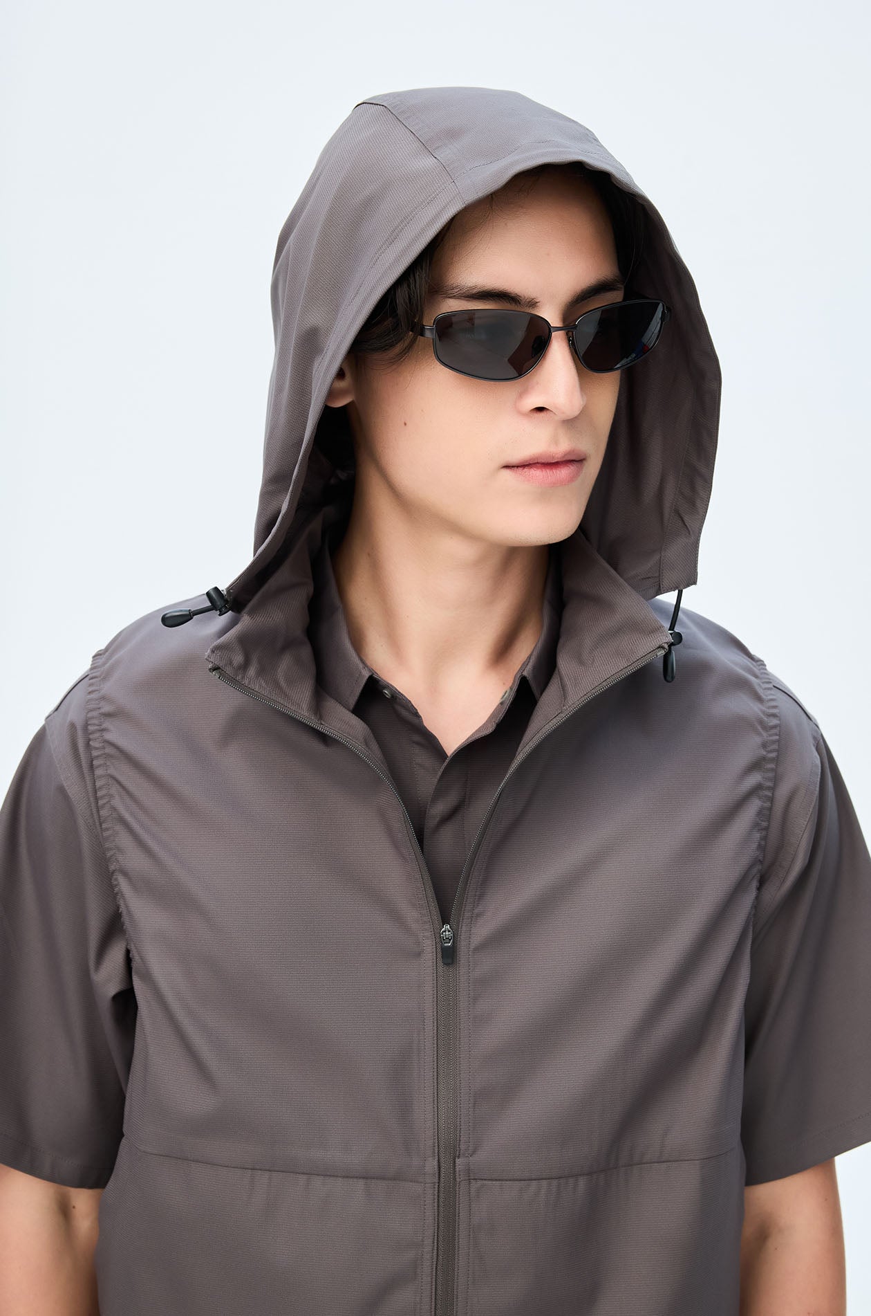 Sports vest jacket in lightweight fabric. Regular fit with funnel neck, hidden hood, side pockets, and drawstring hem. Front zip closure. Available in grey.