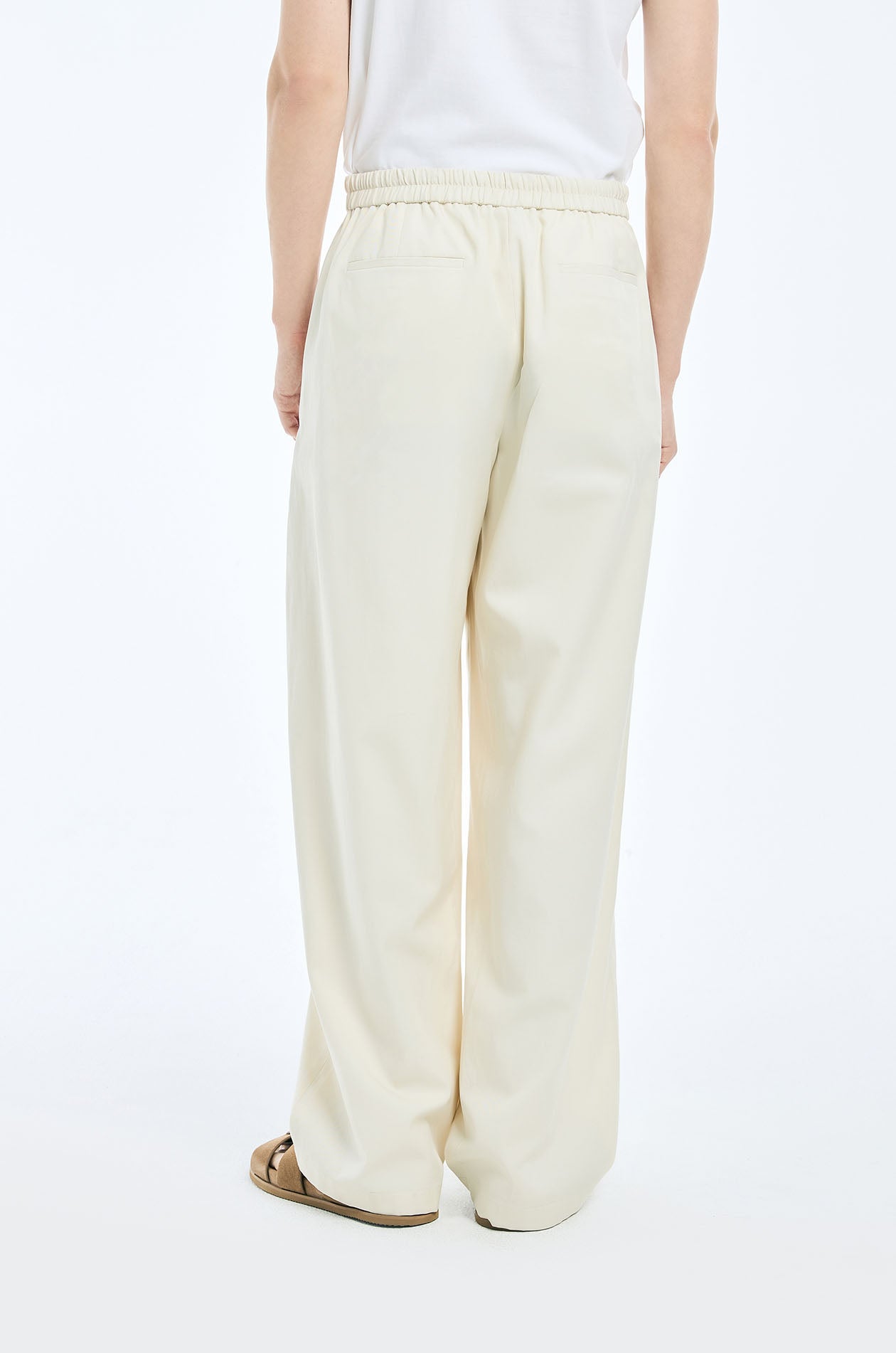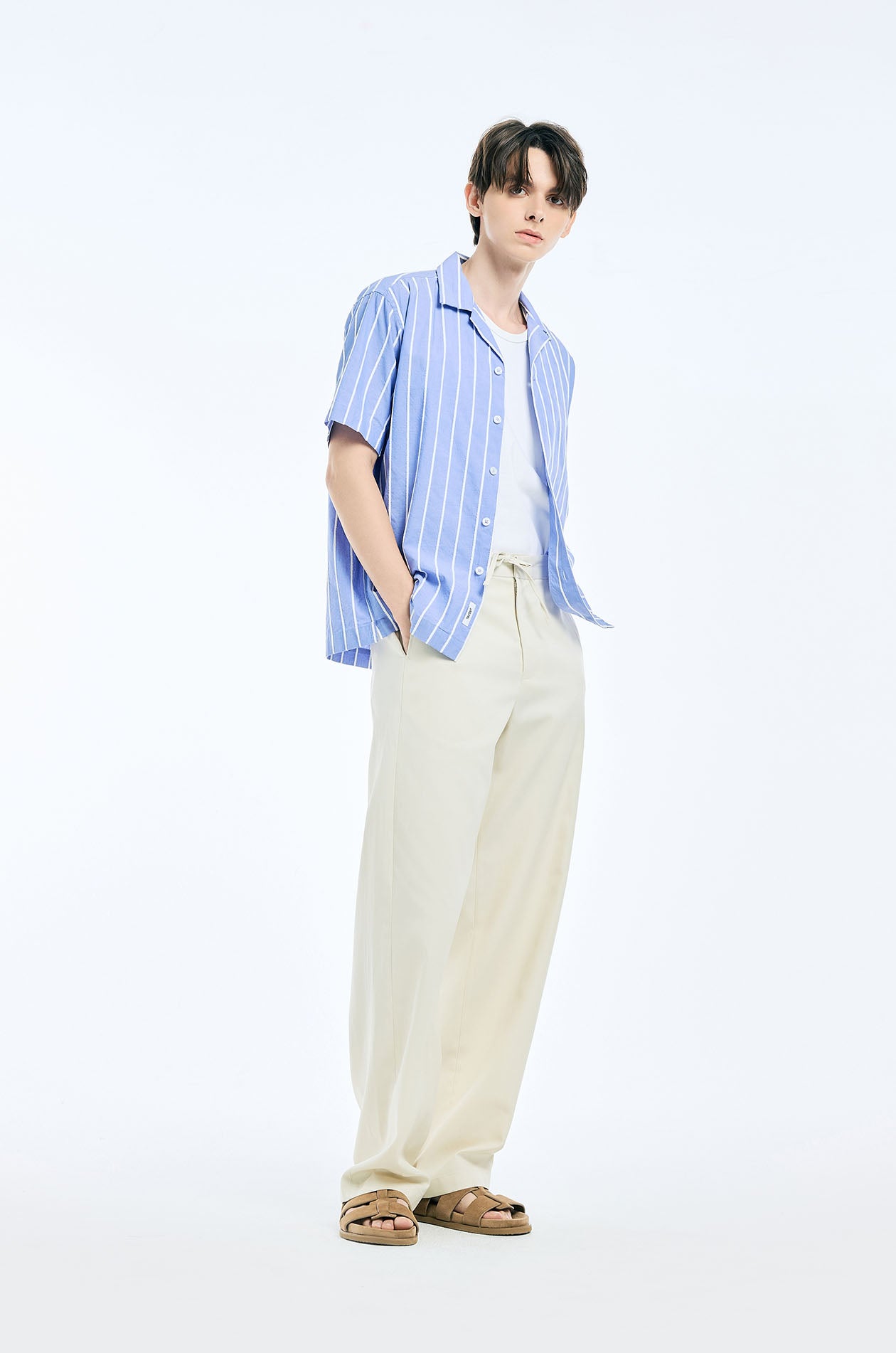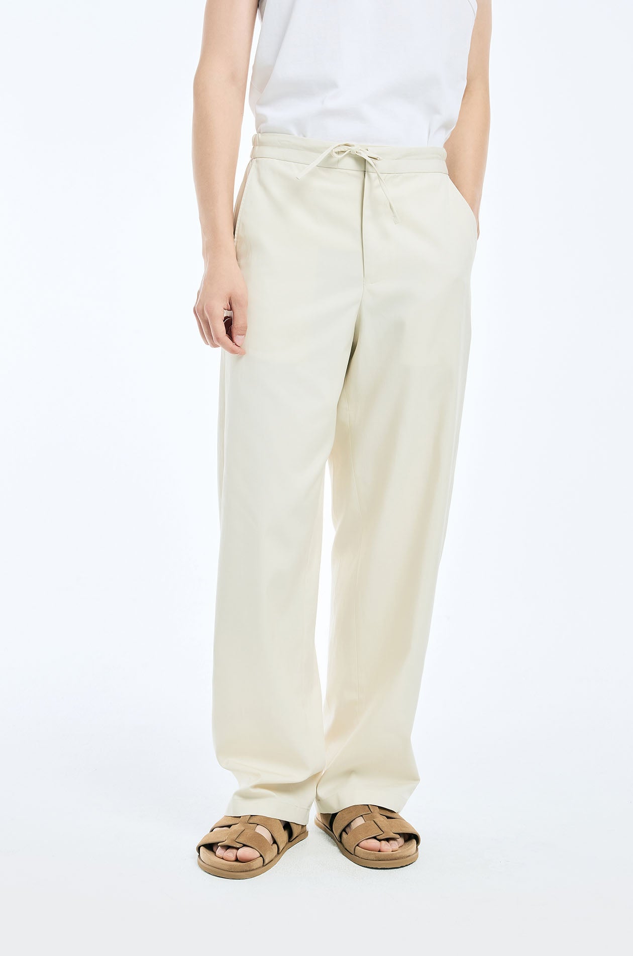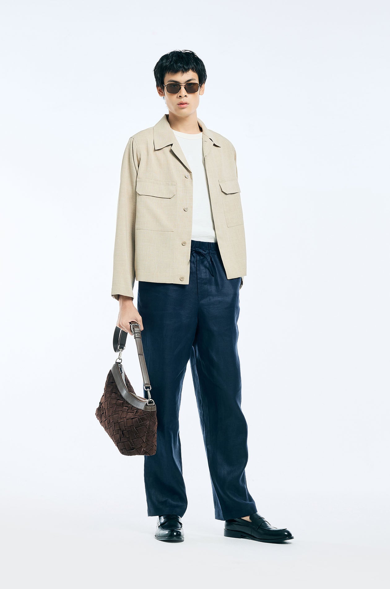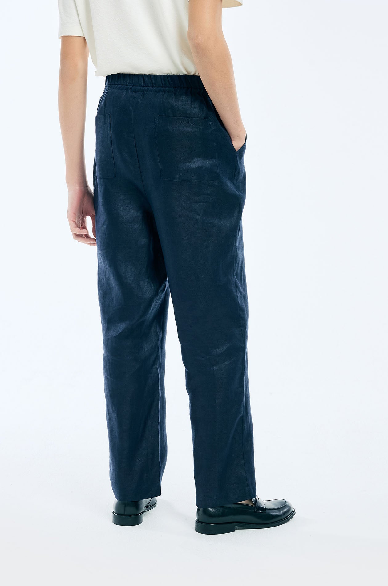 Mid-rise easy pants in linen twill fabric. Straight legs with side and back pockets. Elastic drawstring waistband. Front zip closure. Available in light brown and navy.