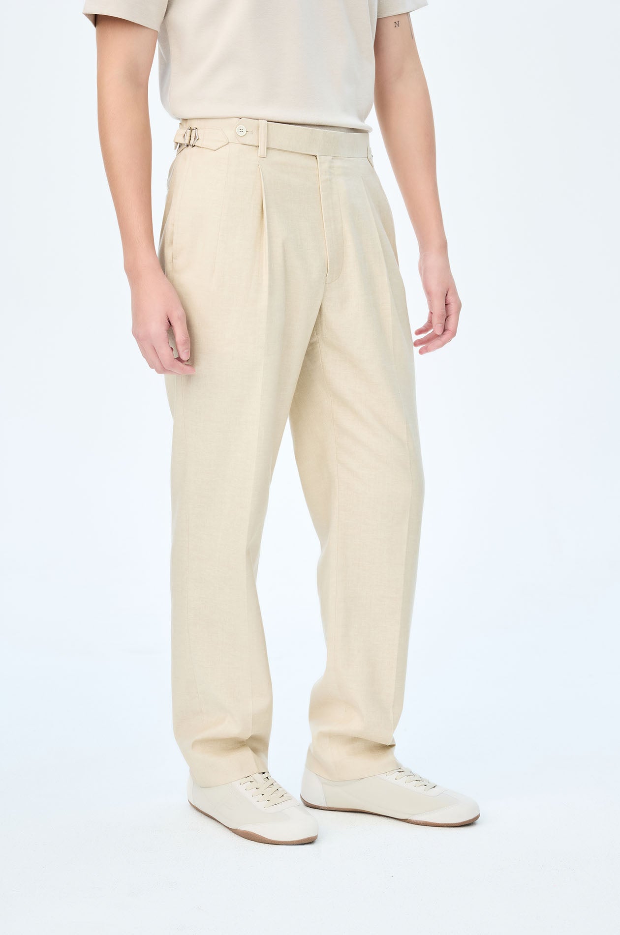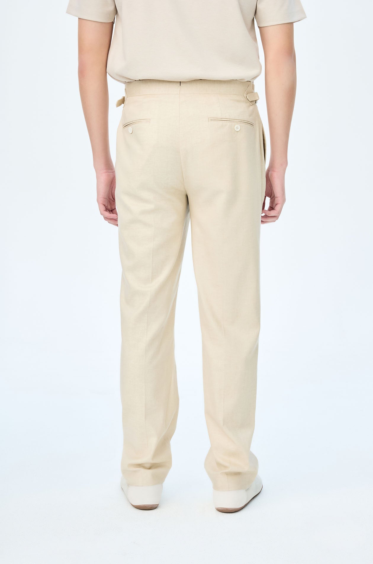 Mid-rise tailored pants in linen blend. Straight legs with front pleats, side and back pockets. Overlap waistband with waist adjusters. Front button and zip closure. Available in light beige.