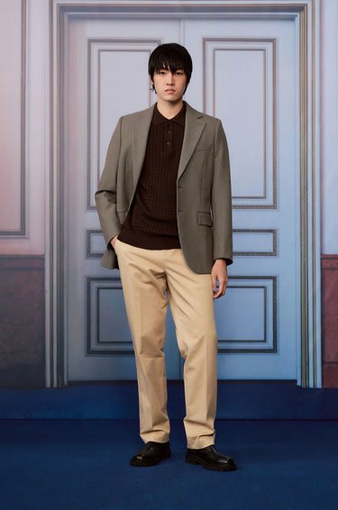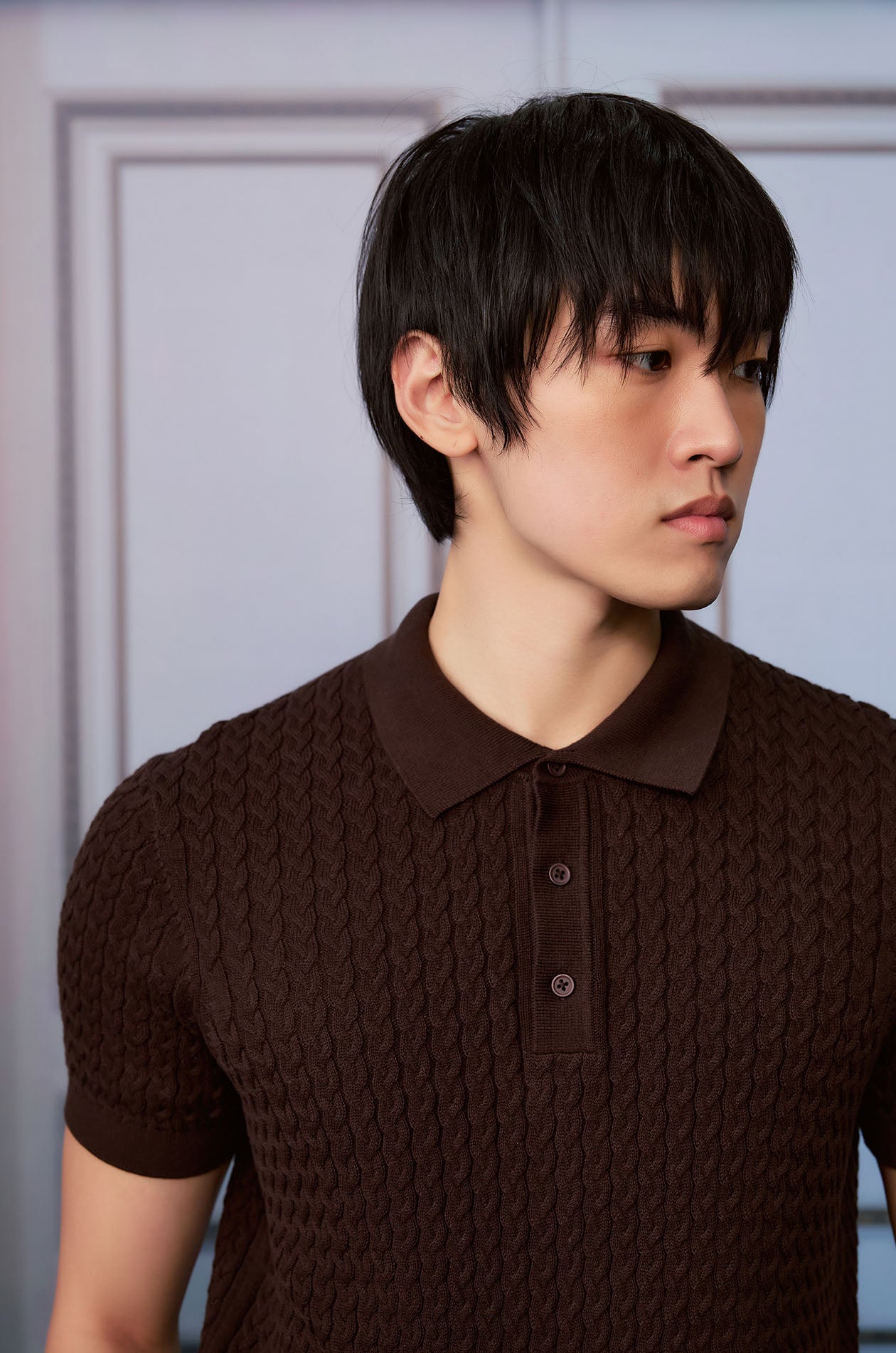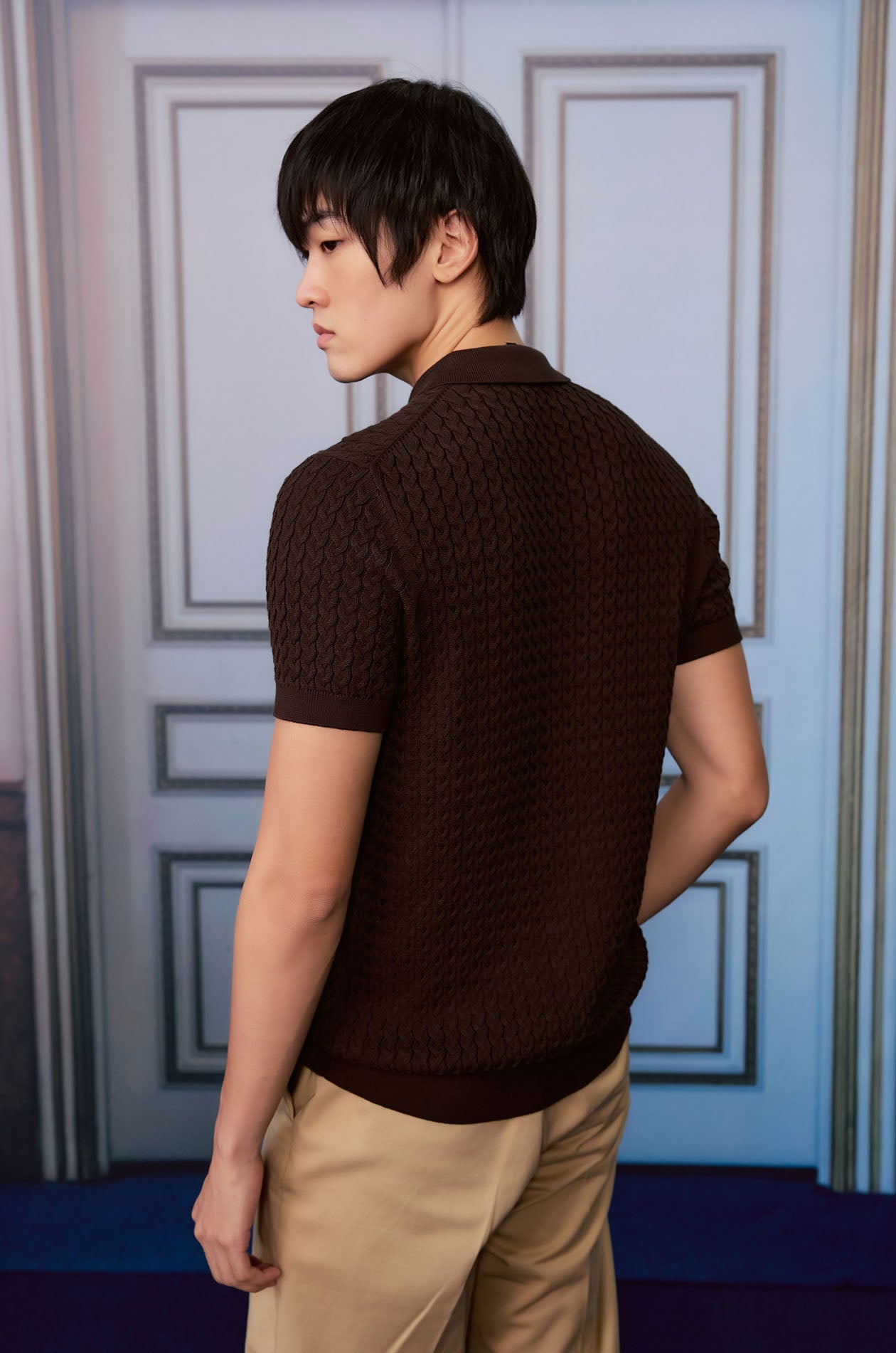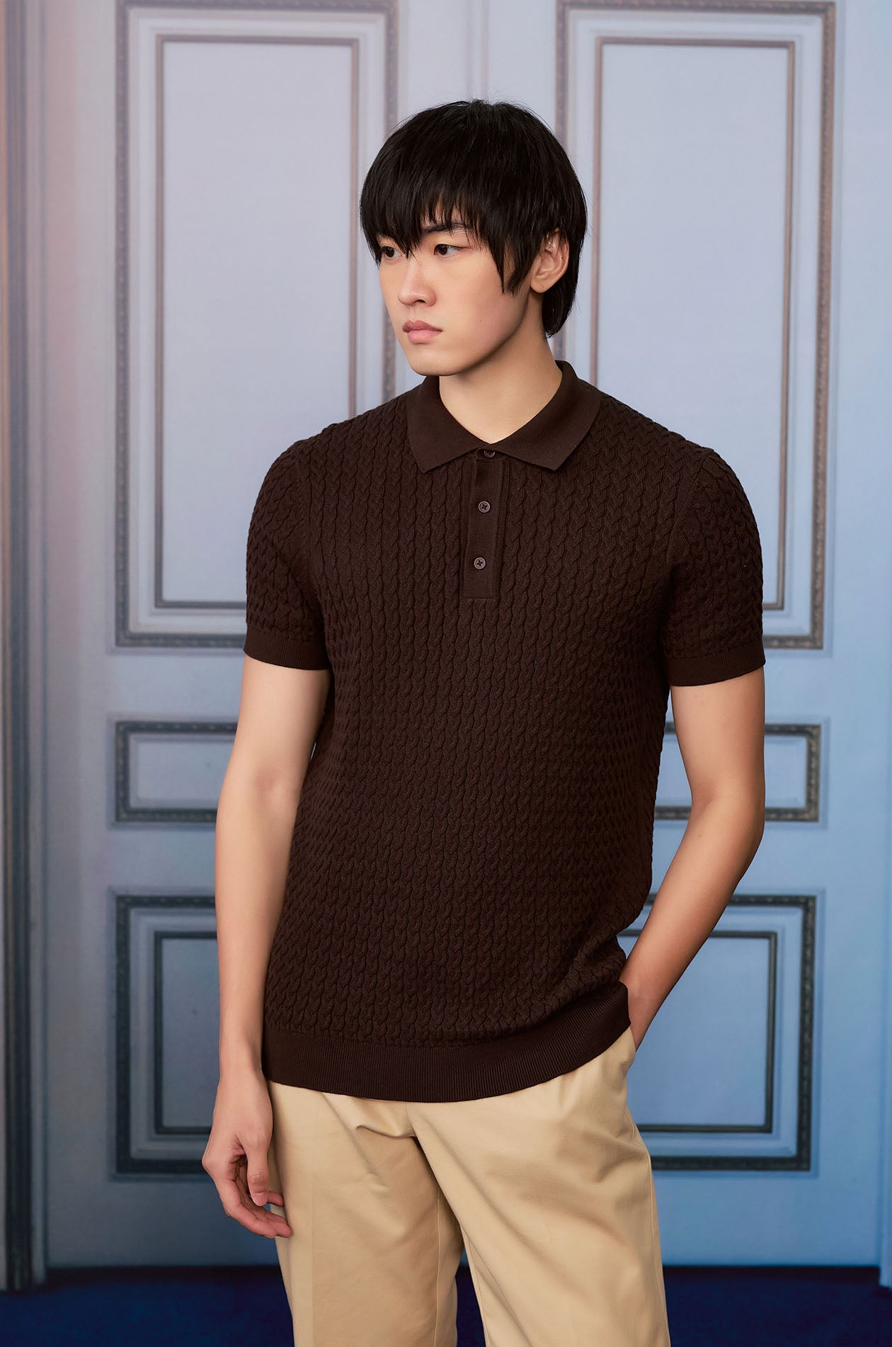 Short-sleeved polo shirt in cable knit. Regular fit with classic collar, ribbed cuffs and hem. Front button closure. Available in dark brown.
