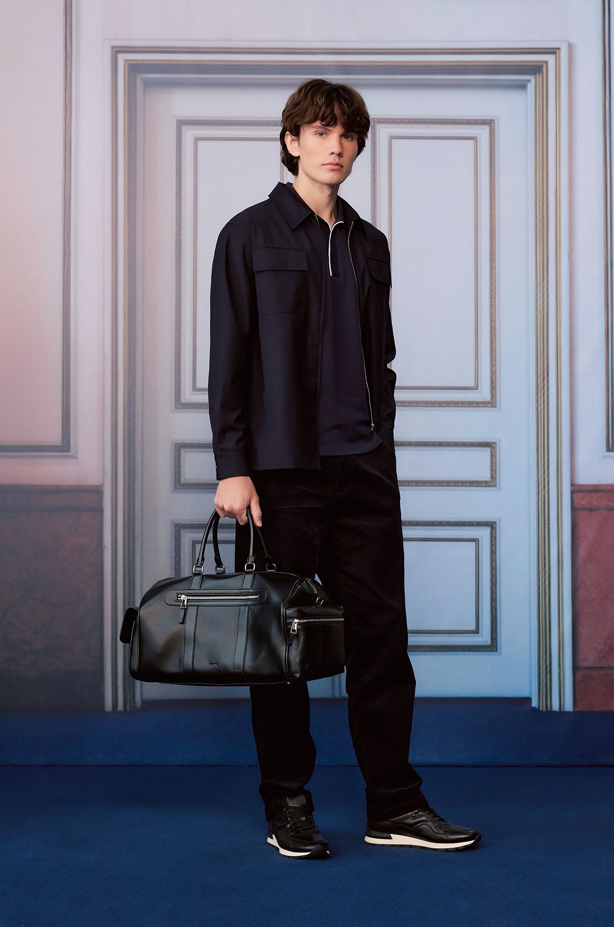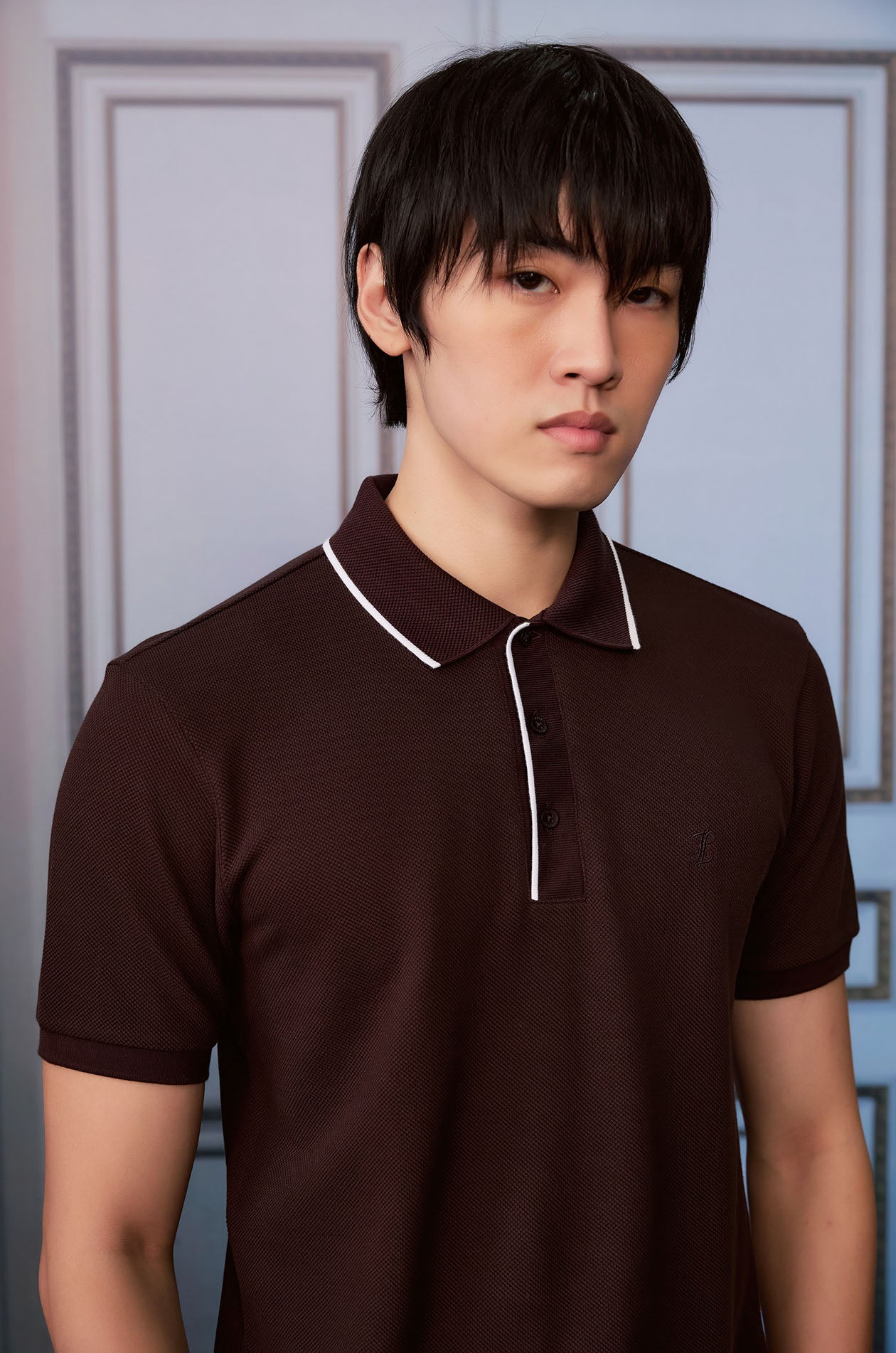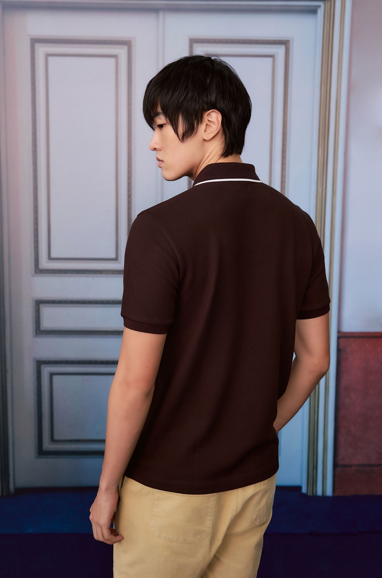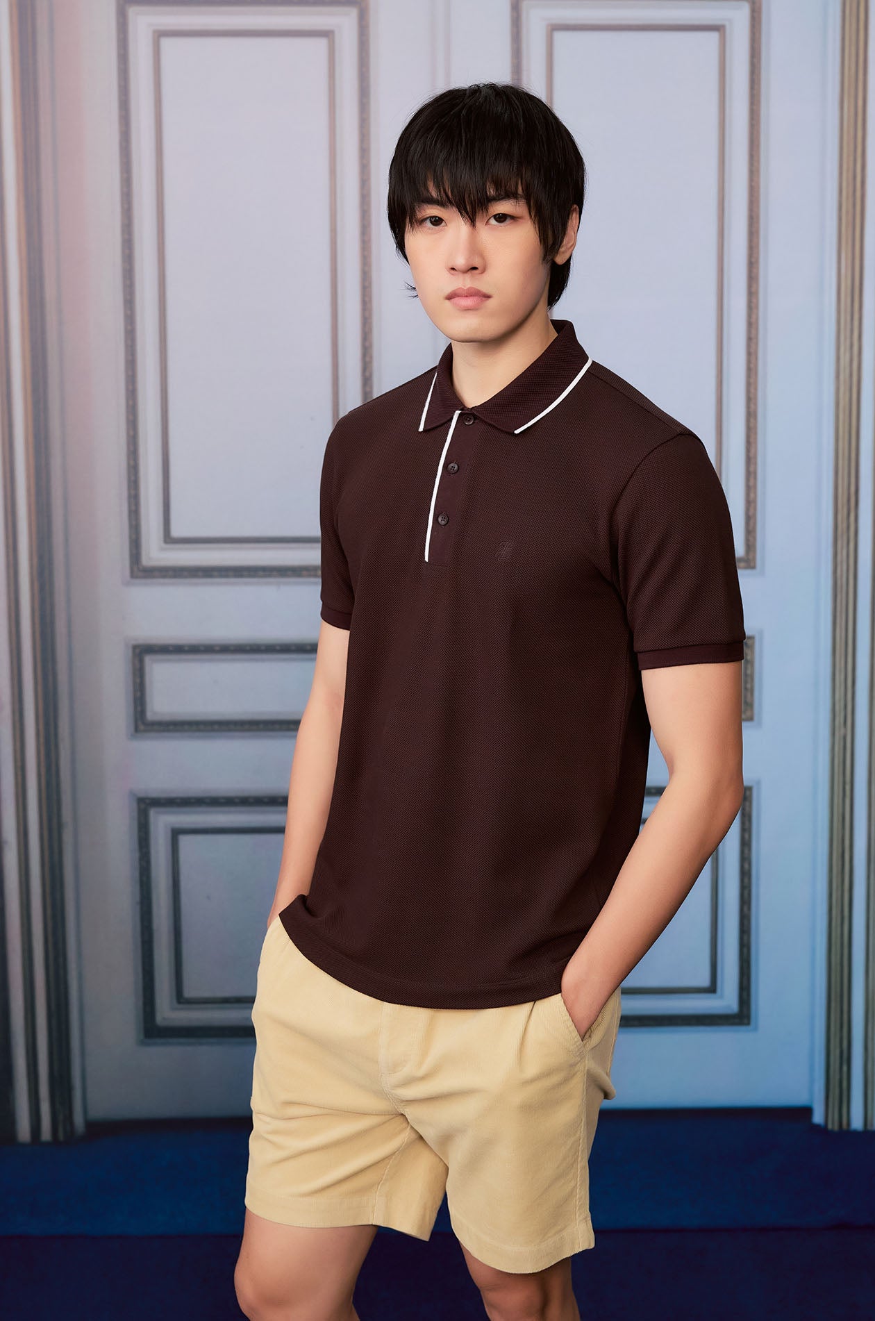 Short-sleeved polo shirt in cotton pique. Classic collar with contrast trim. Ribbed cuffs and hem. Front button closure. Available in white, navy, and dark brown.