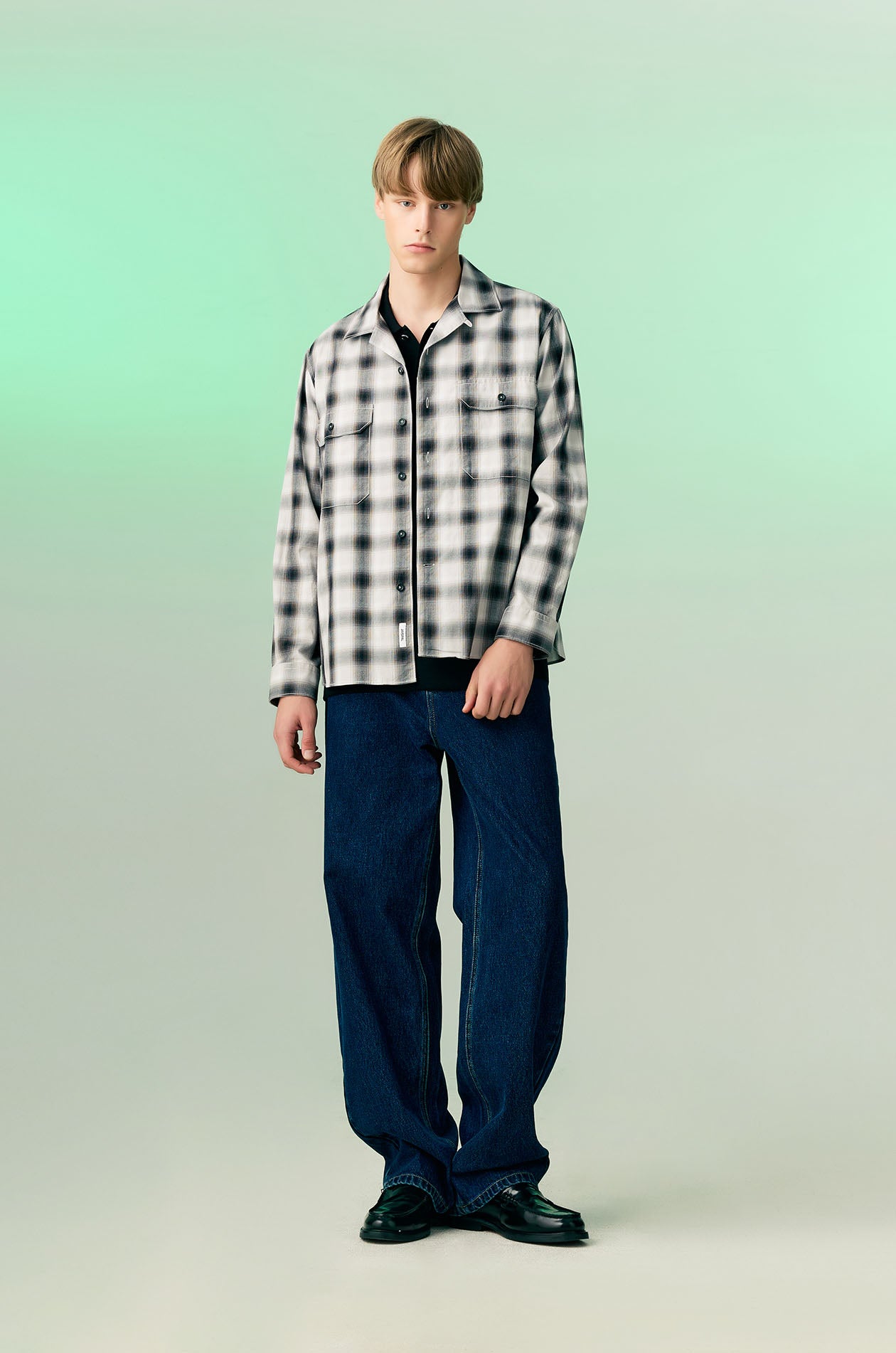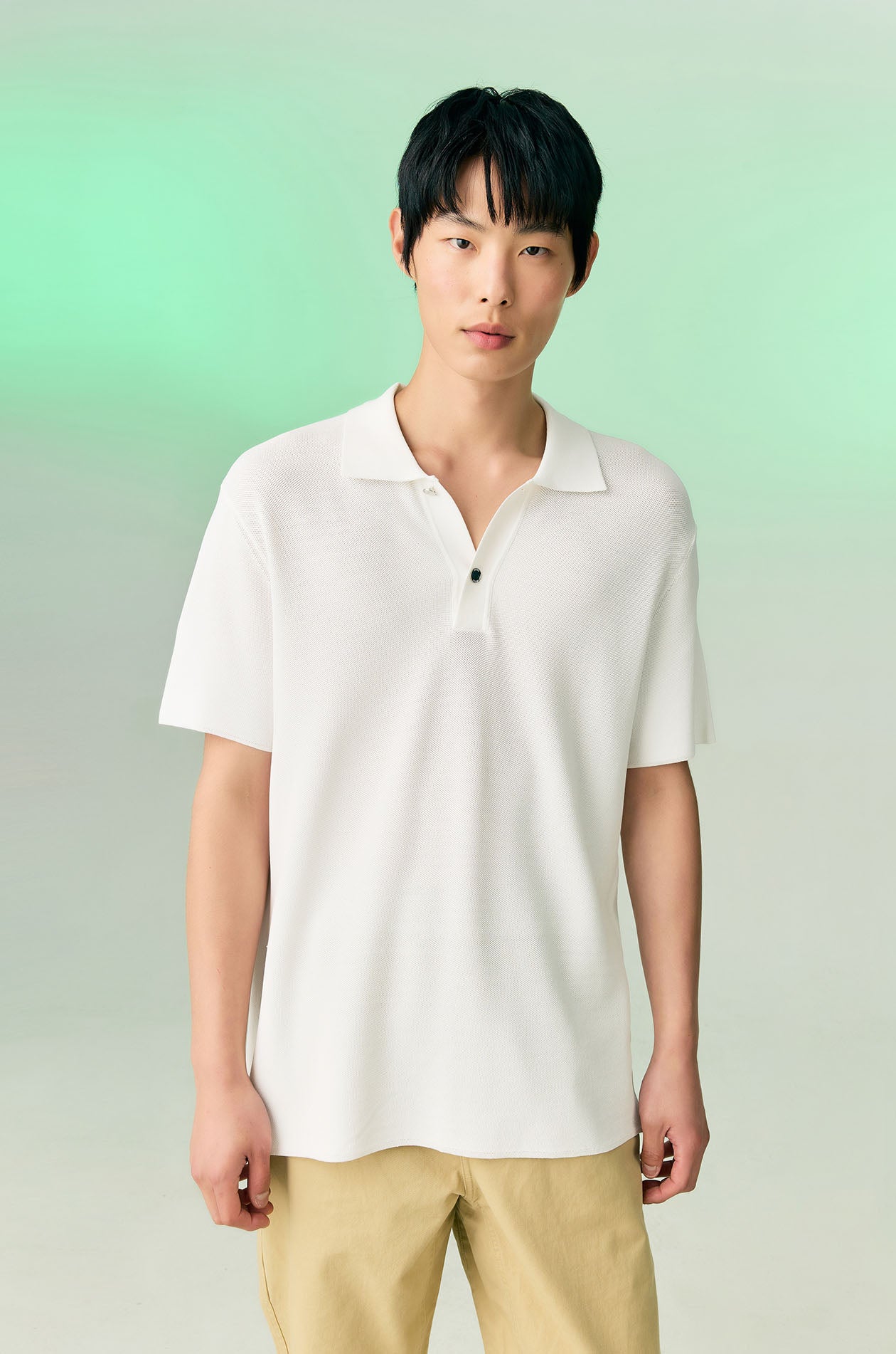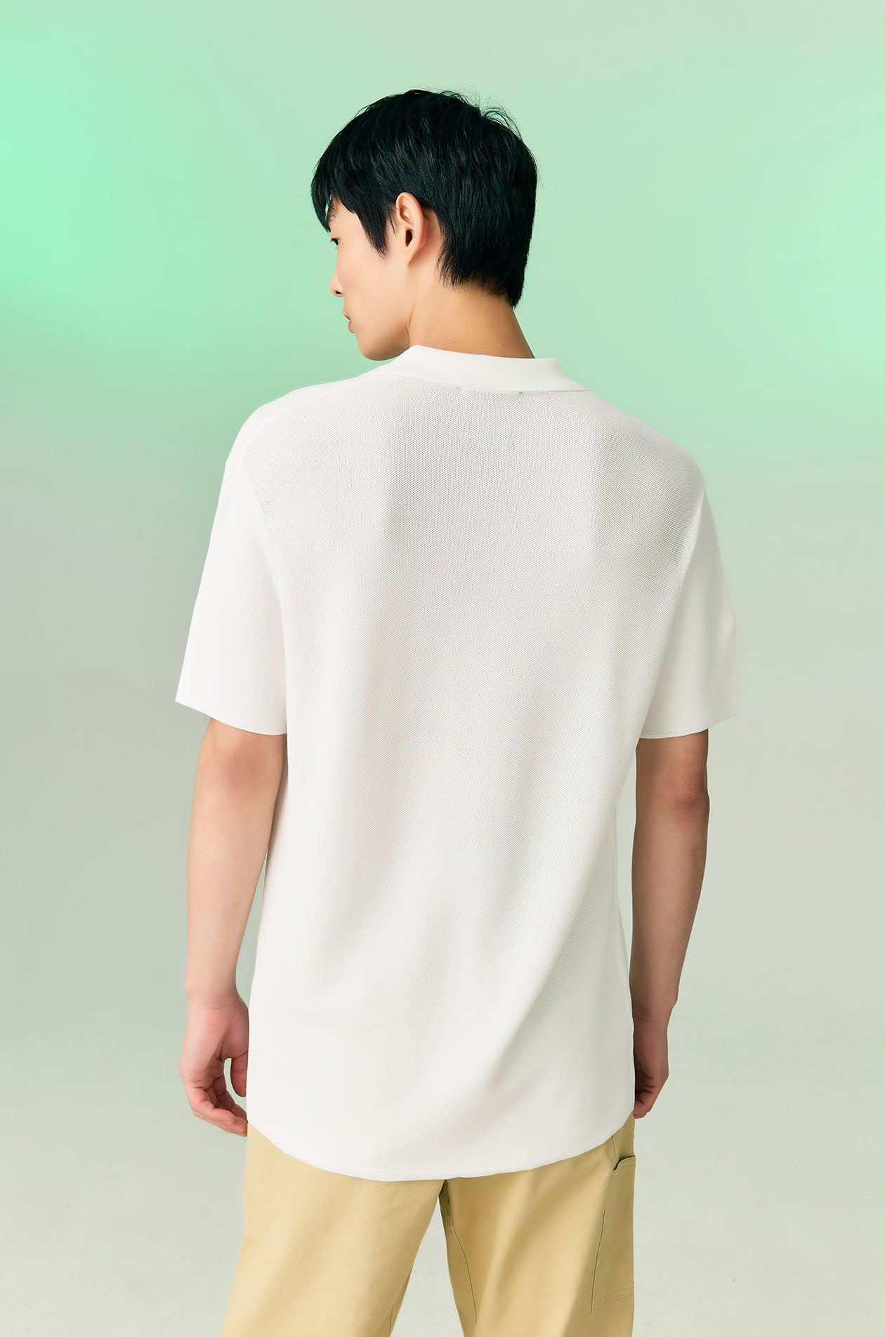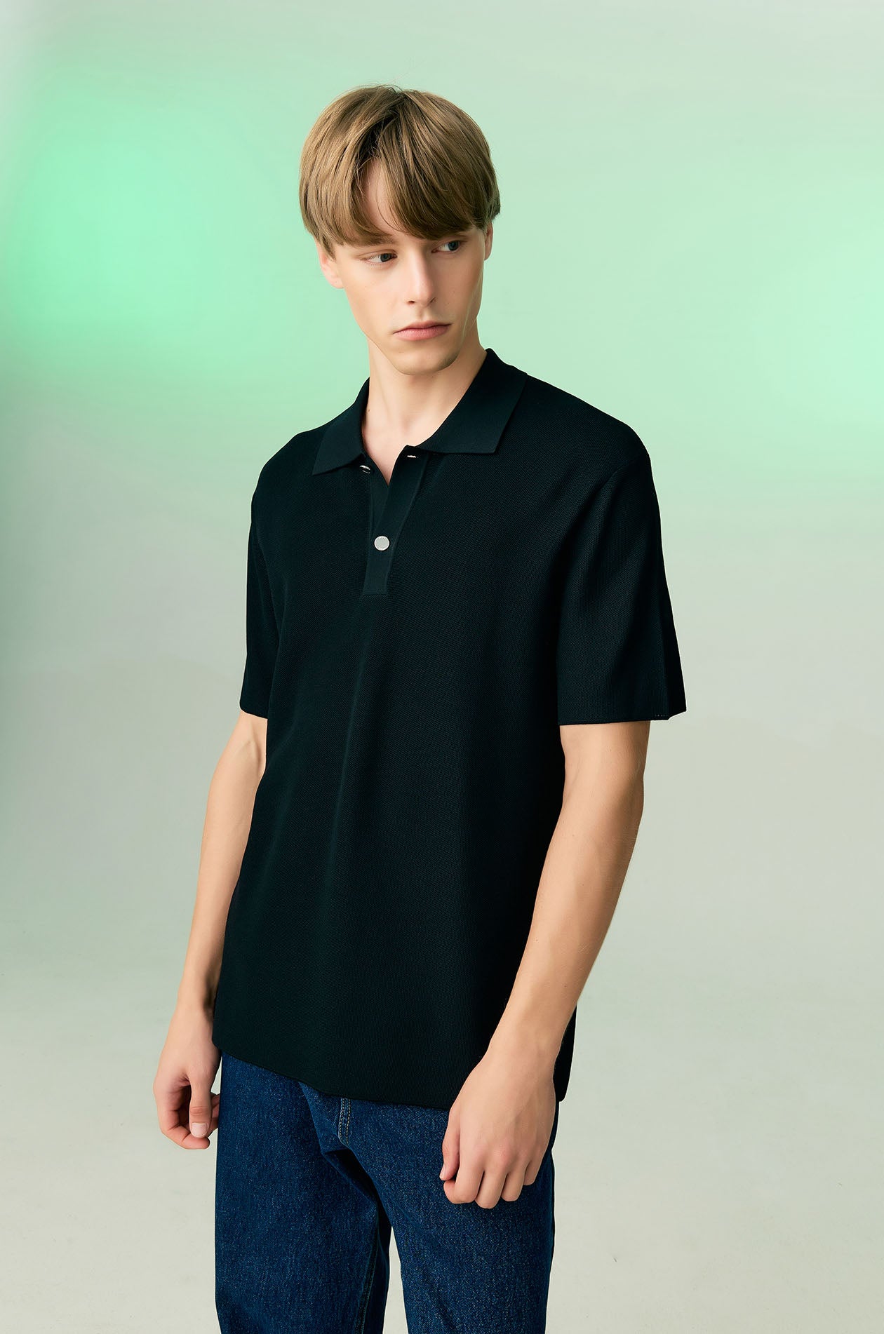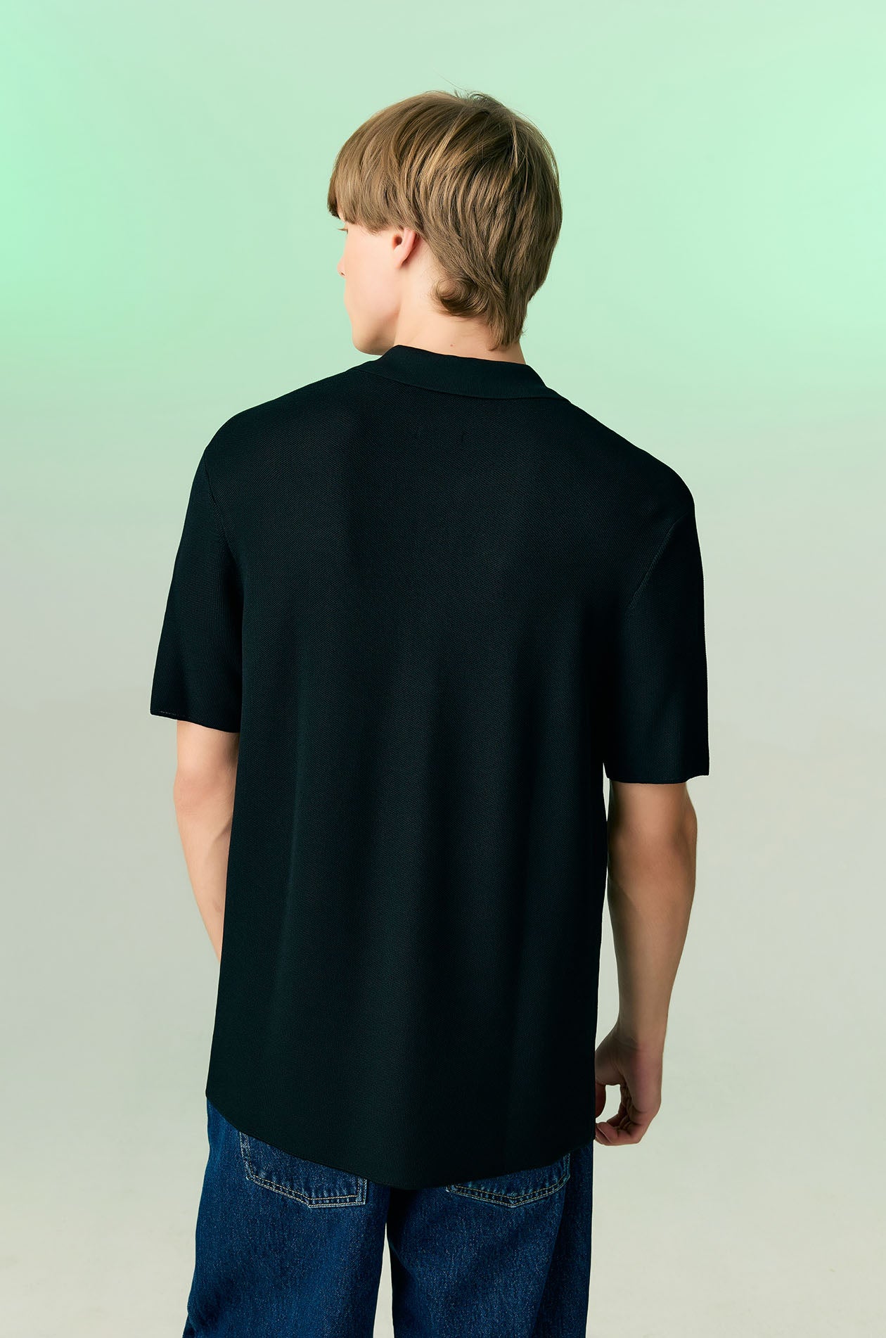 Short-sleeved polo shirt in knit fabric. Relaxed fit with spread collar and lettering logo at the chest. Front button closure. Available in black and white.