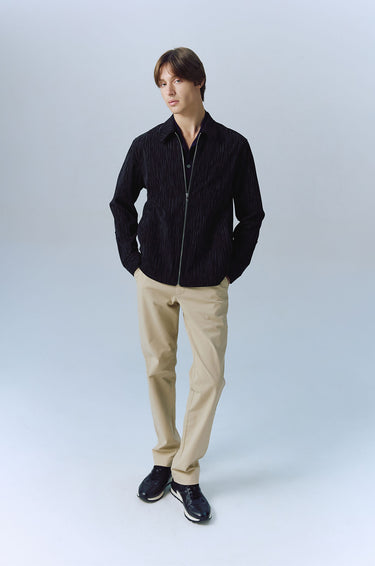 Short-sleeved resort shirt in textured fabric with striped pattern. Relax fit with camp collar. Front button closure. Available in white and blue.