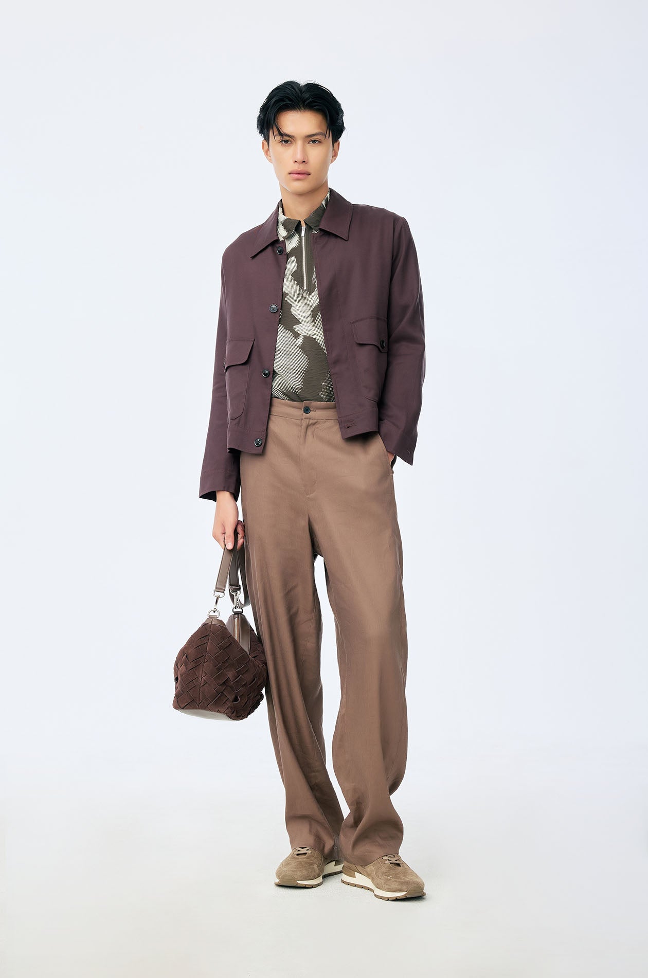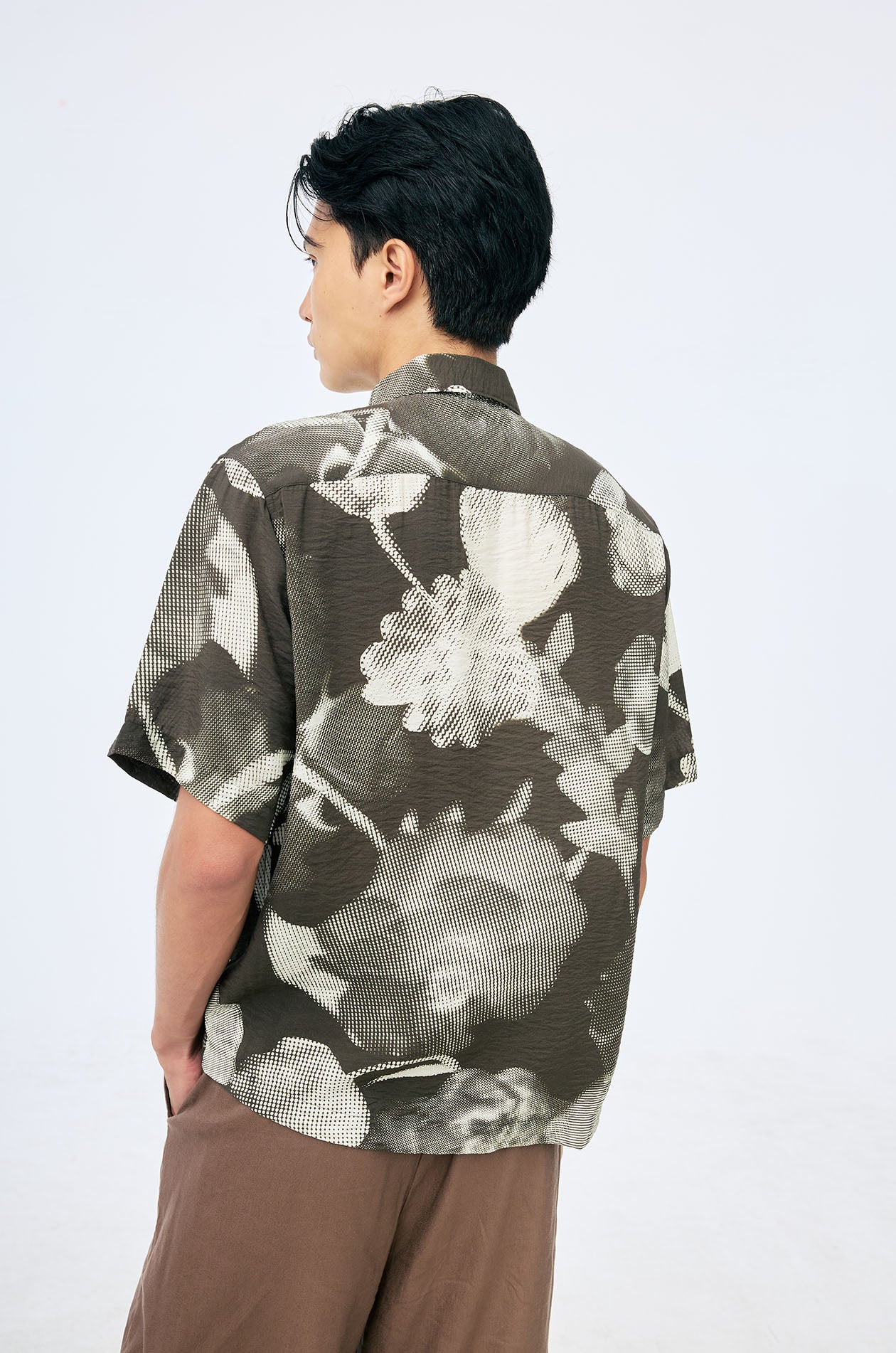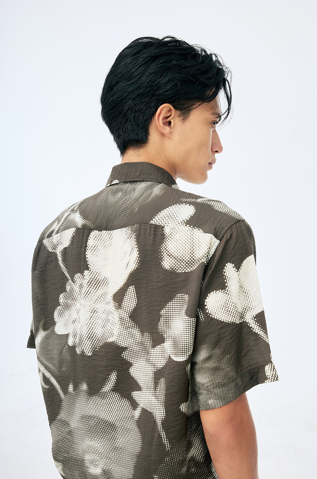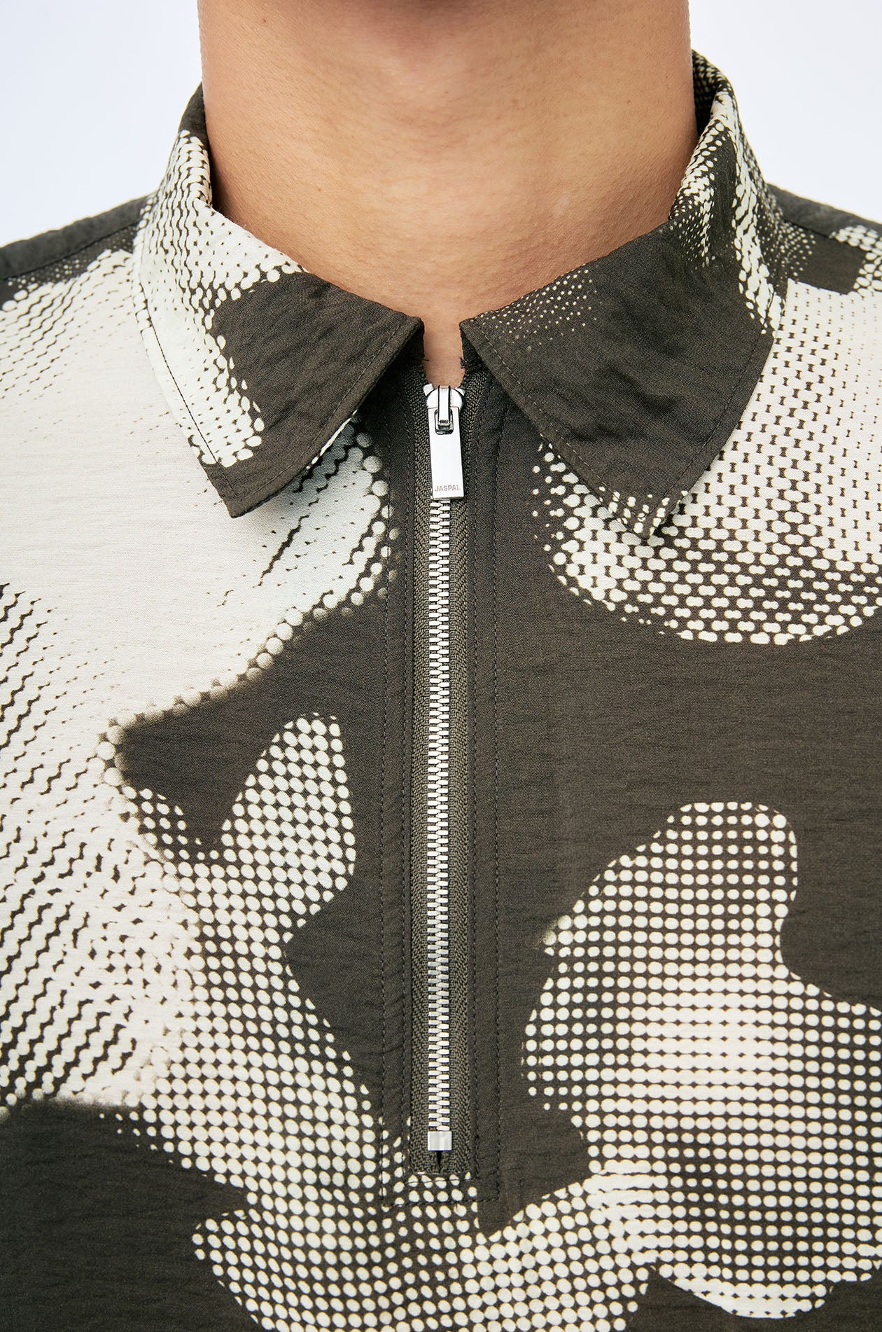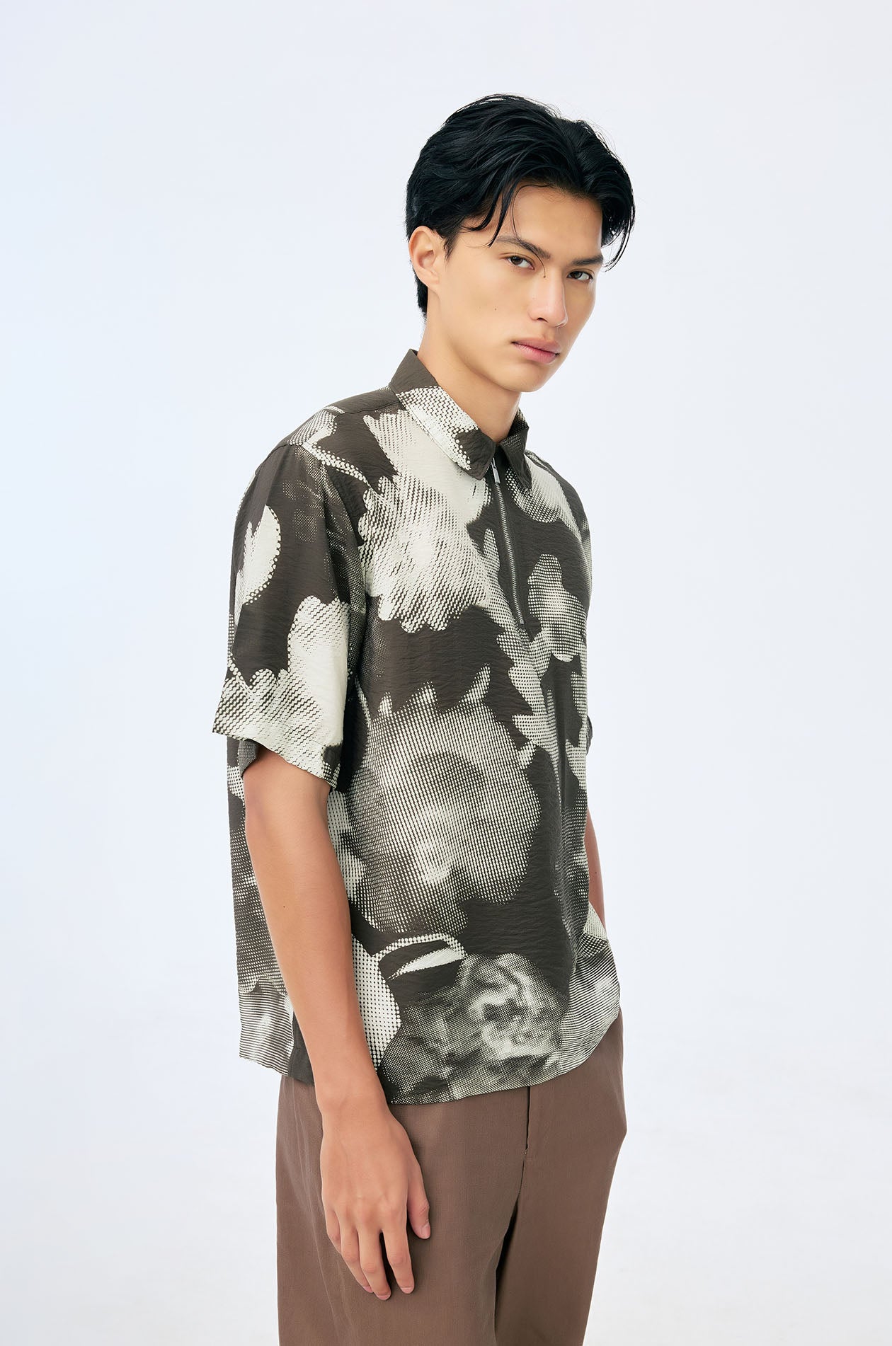 Short-sleeved shirt crafted from a lightweight viscose-blend woven fabric, offering a soft, fluid drape. Designed with a half-zip neckline and a regular fit, it features an allover tonal botanical print that adds depth and visual texture. Finished with clean lines for a modern, effortless look. Available in dark grey.