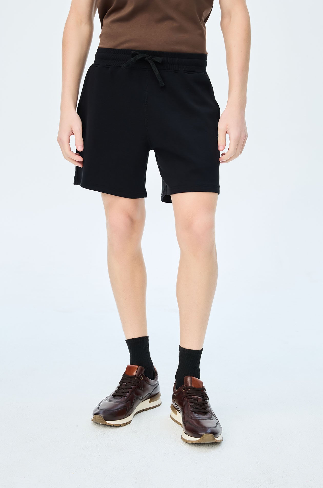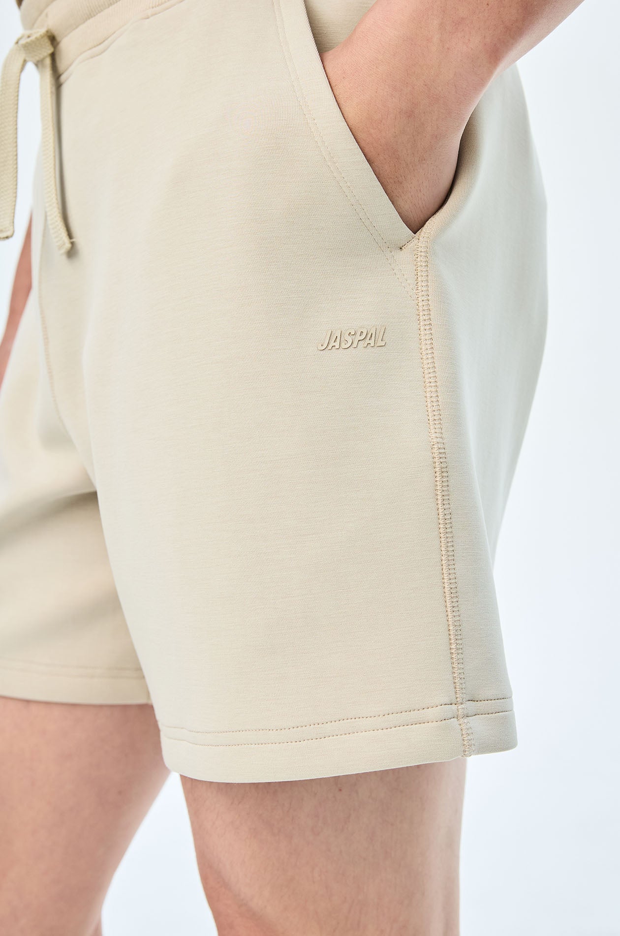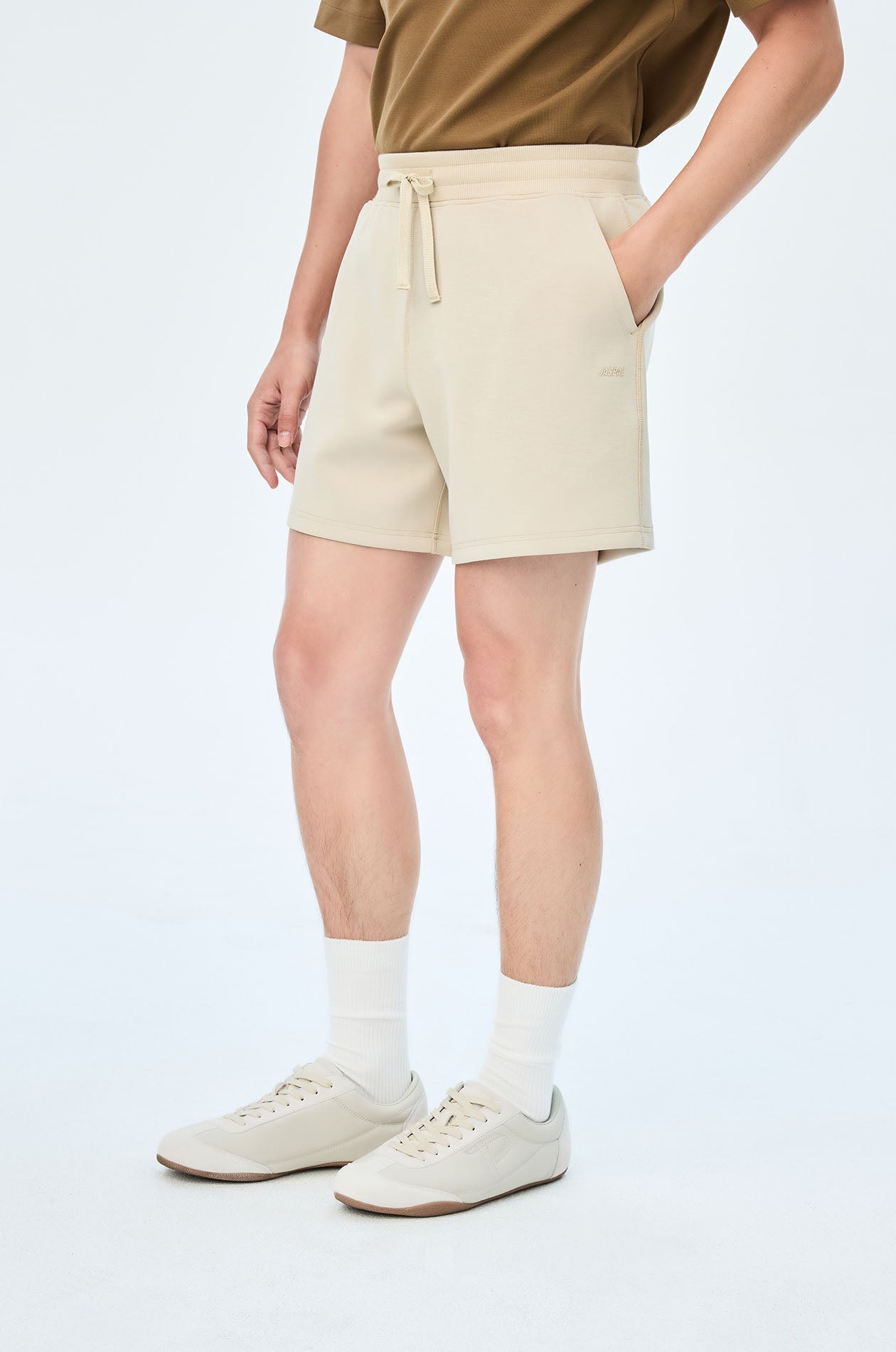 Mid-rise sweatshorts in spongy scuba fabric. Above-knee length with side and back pockets. Elastic drawstring waistband. Available in black and light beige.